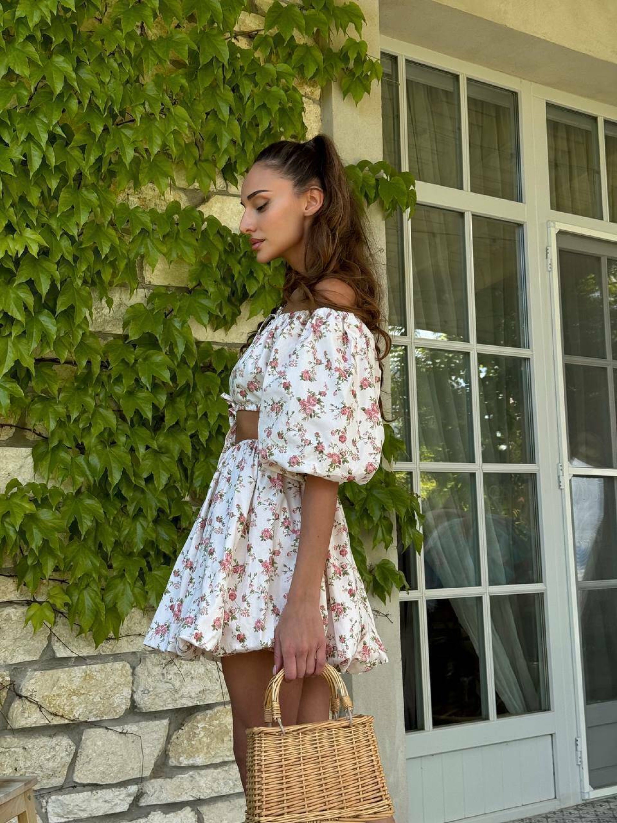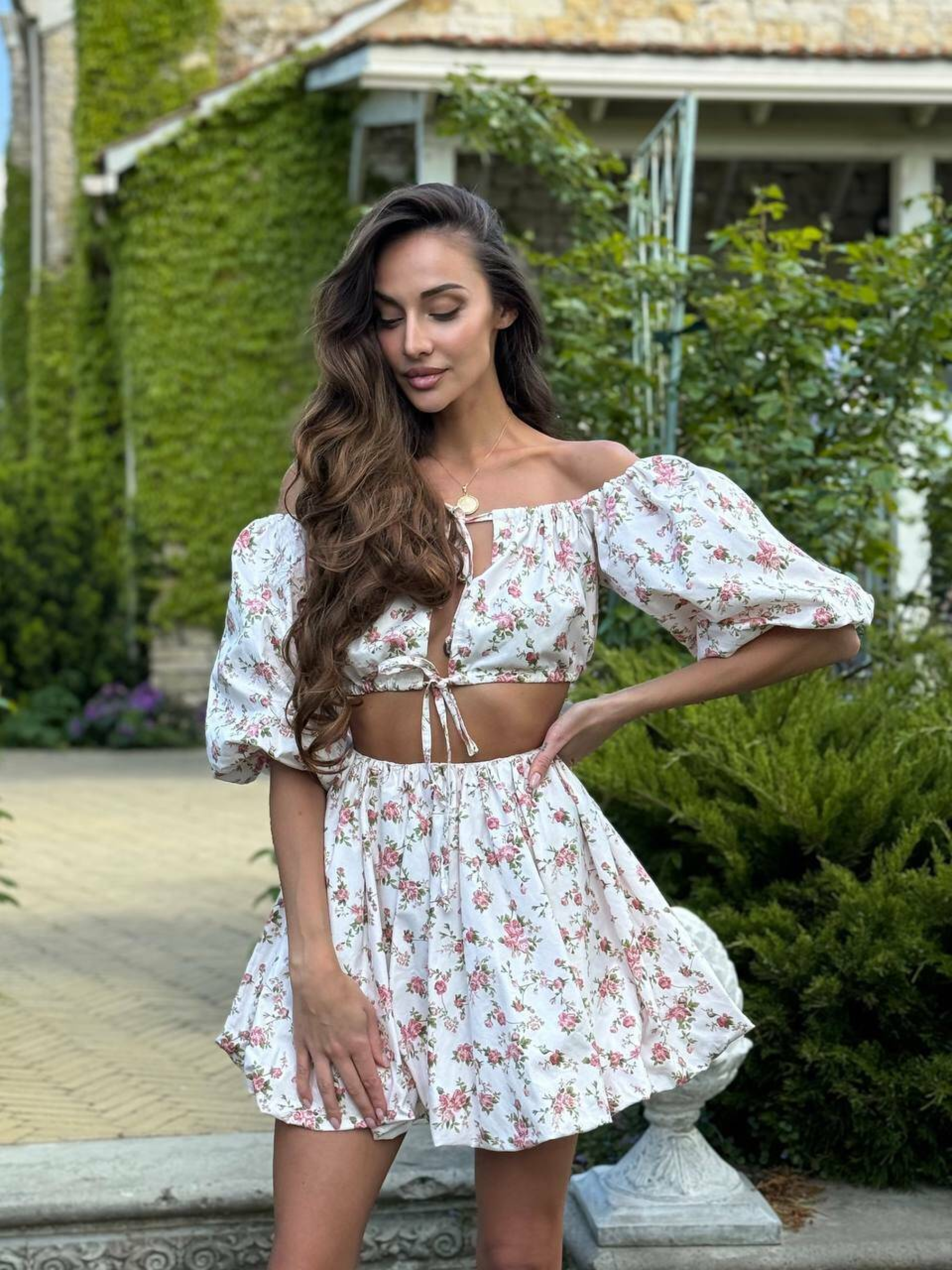 Характеристики: Тип: костюм (топ + спідниця) Сезон: літо Матеріал: 100% бавовна Довжина спідниці: міні Тип верху: ліф-топ із зав’язками Посадка спідниці: середня, на резинці Догляд: ручне або делікатне машинне прання при температурі до 30 °C прасування при температурі до 150 °C не відбілювати не піддавати хімічній чистці сушити у розкладеному вигляді, уникати прямого сонячного світла Особливості та переваги: топ має зручні зав’язки, що дозволяють регулювати об’єм та висоту посадки; спідниця-парашют вільного крою забезпечує комфорт і свободу рухів; натуральна бавовна приємна до тіла, не парить і не викликає подразнень; квітковий принт створює святковий, романтичний настрій; костюм легко комбінується з босоніжками, сандалями або кедами. Легкий та невагомий літній костюм Стефа створений для яскравих, сонячних днів. Комплект складається з лаконічного ліфа-топа та вільної міні-спідниці з ефектом “парашют”. Завдяки легкій бавовняній тканині костюм забезпечує комфорт навіть у спекотну погоду, а насичений квітковий принт додає образу свіжості та грайливості.