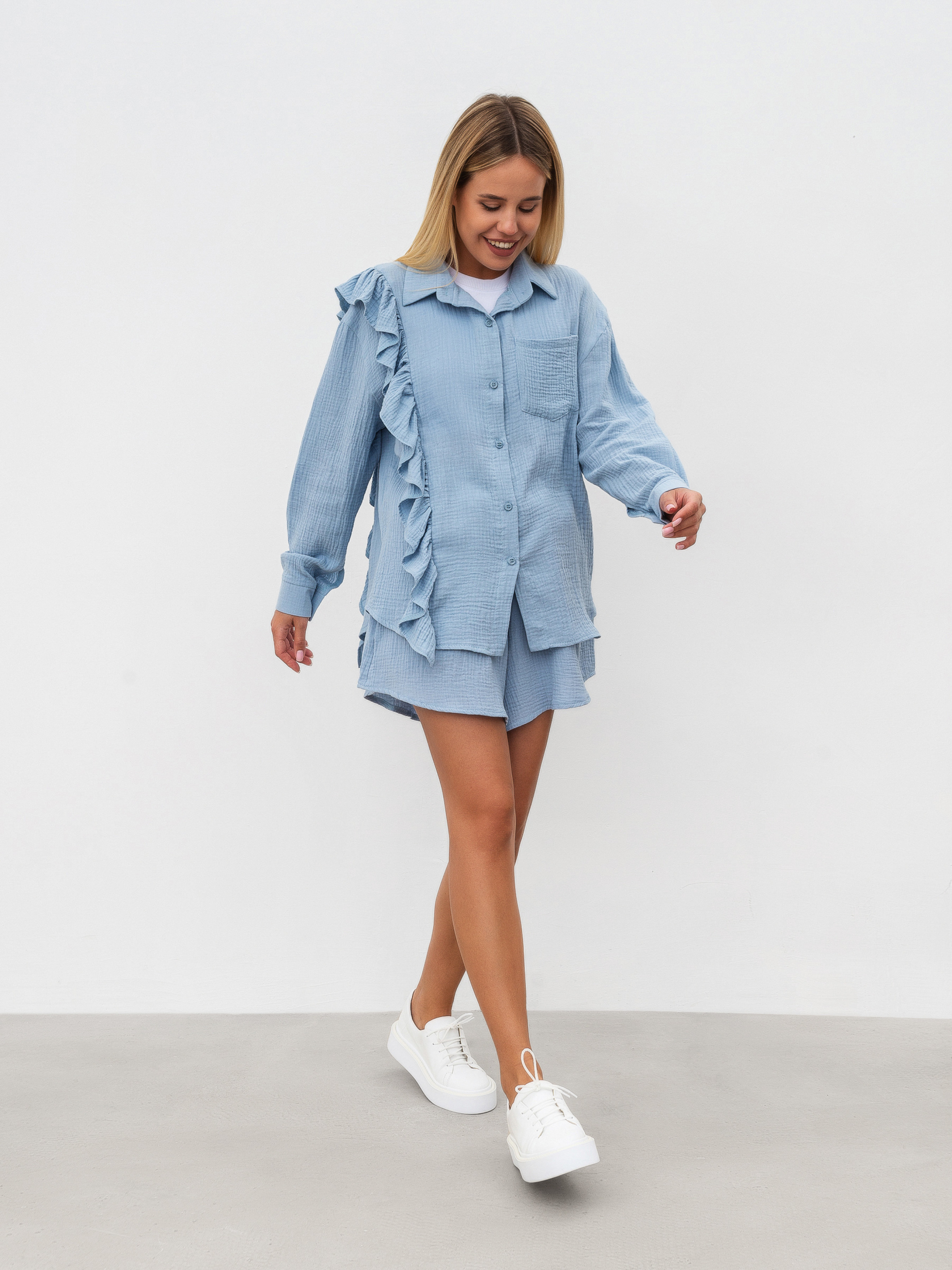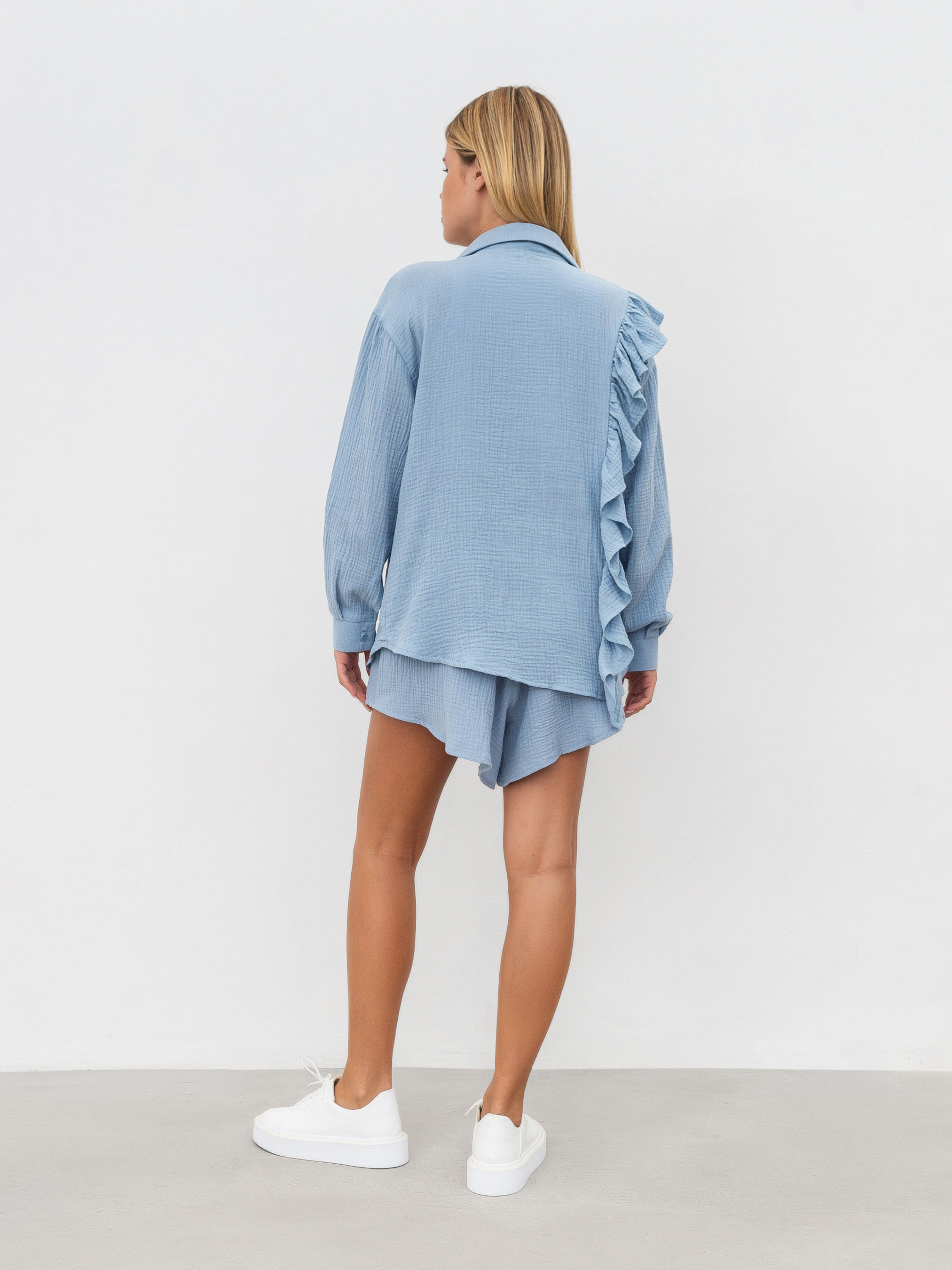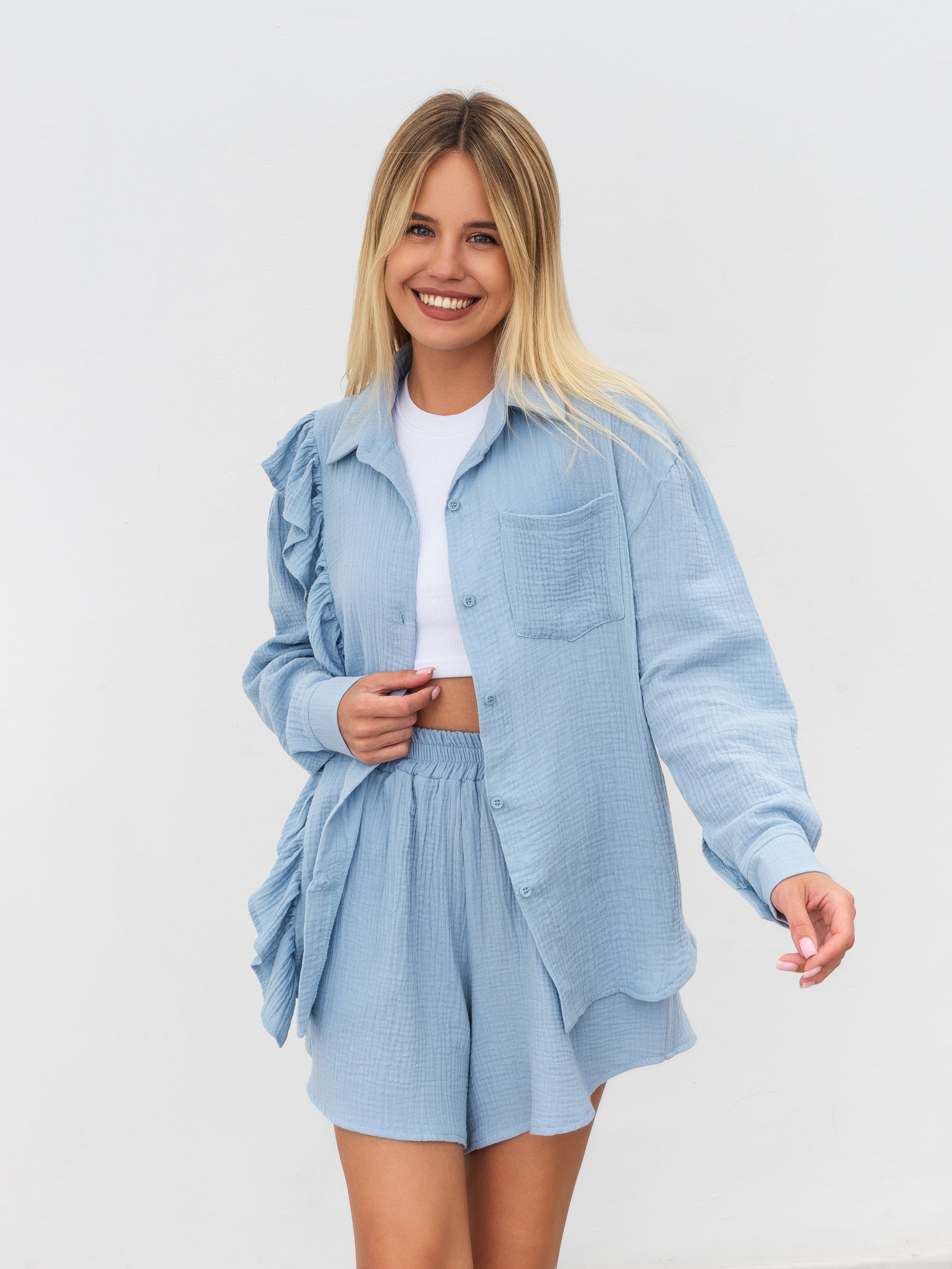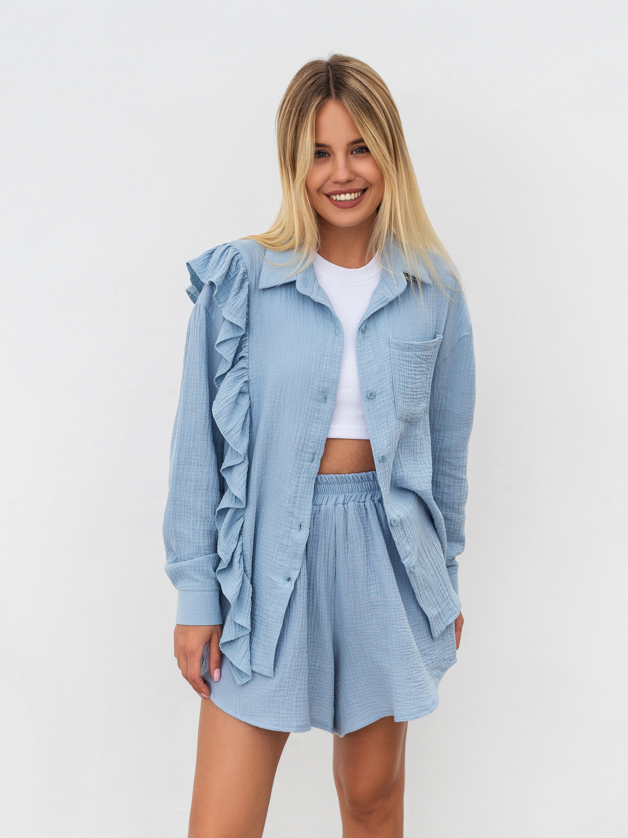 Комплект із вільної сорочки з рюшами та шортів. Натуральний матеріал муслін 100% бавовна. Шорти на високій посадці, талія на еластичній резинці, фасон трохи трапецією. Сорочка вільного крою з опущеною лінією плеча, манжет на ґудзику. Комплект можна носити як разом, так і окремо, компонуючи з іншими речами з гардероба. XS-S Довжина по спині : 64 см Довжина рукава : 54 см Напівобхват стегон : 52 см Плечі : 52 см Посадка : 35 см Напівобхват талії : 28 см S-M Довжина по зовнішньому шву : 40 см Довжина по спині : 64 см Довжина рукава : 55 см Напівобхват стегон : 54 см Плечі : 53 см Посадка : 36 см Напівобхват талії : 30 см M-L овжина по зовнішньому шву : 40 см Довжина по спині : 64 см Довжина рукава : 56 см Напівобхват стегон : 56 см Плечі : 54 см Посадка : 37 см Напівобхват талії : 33 см