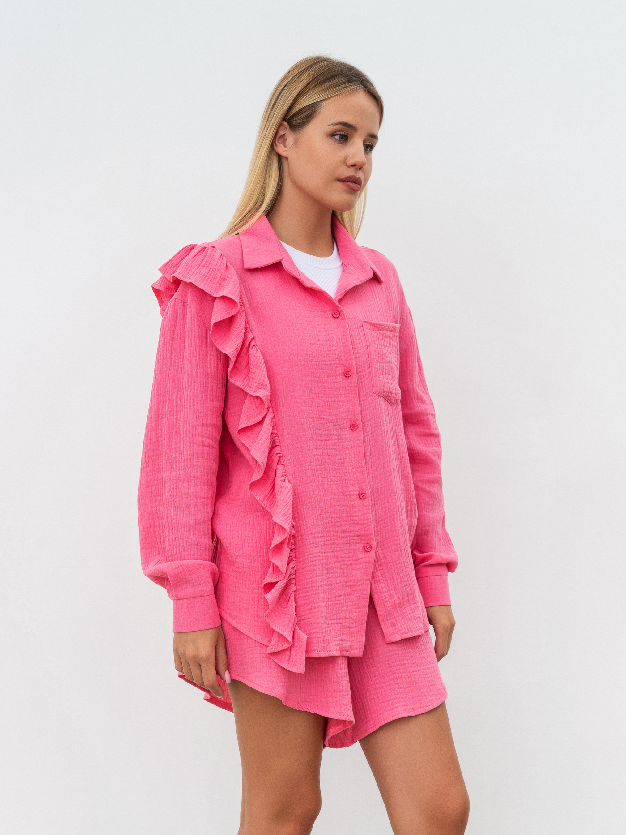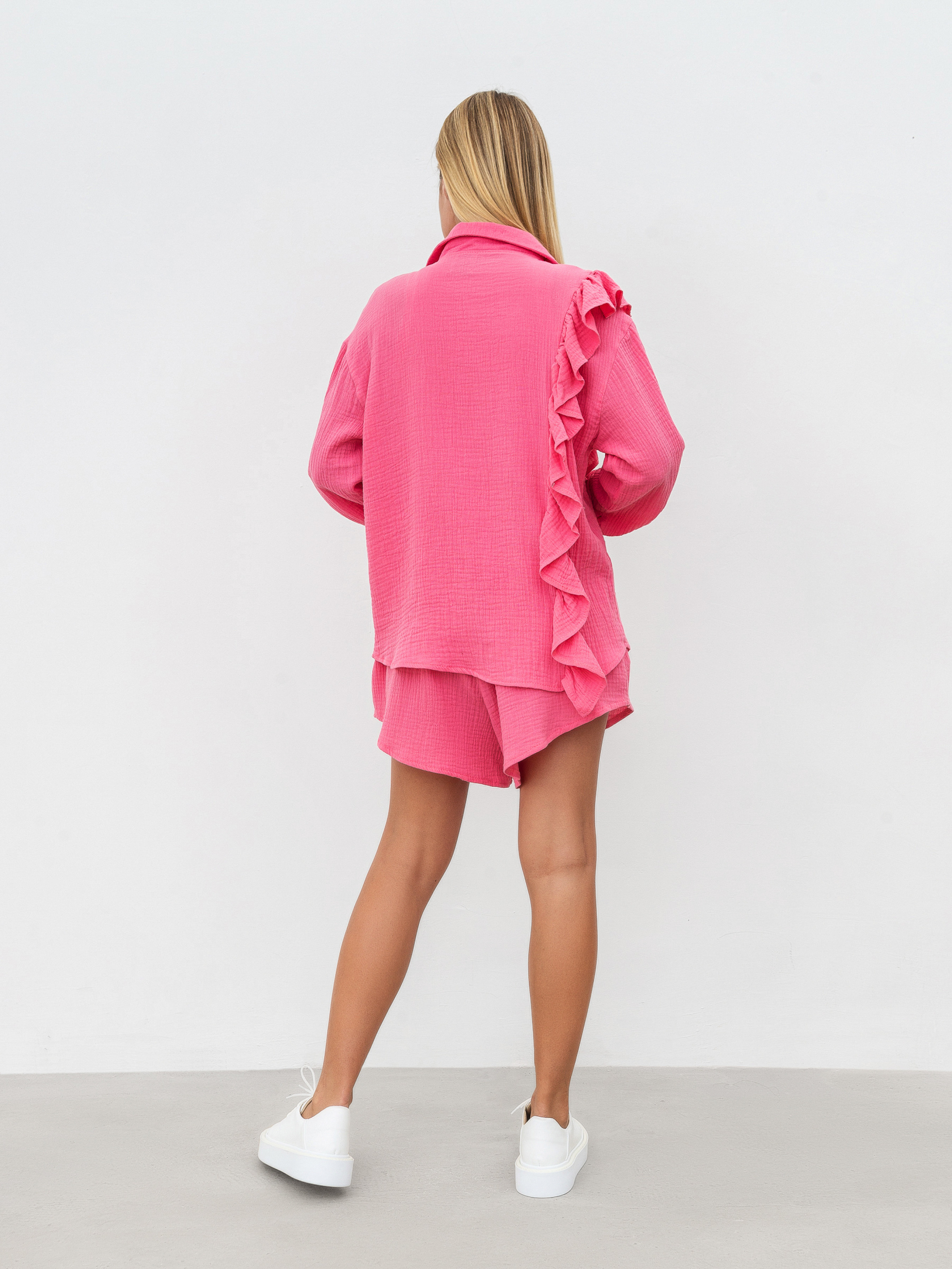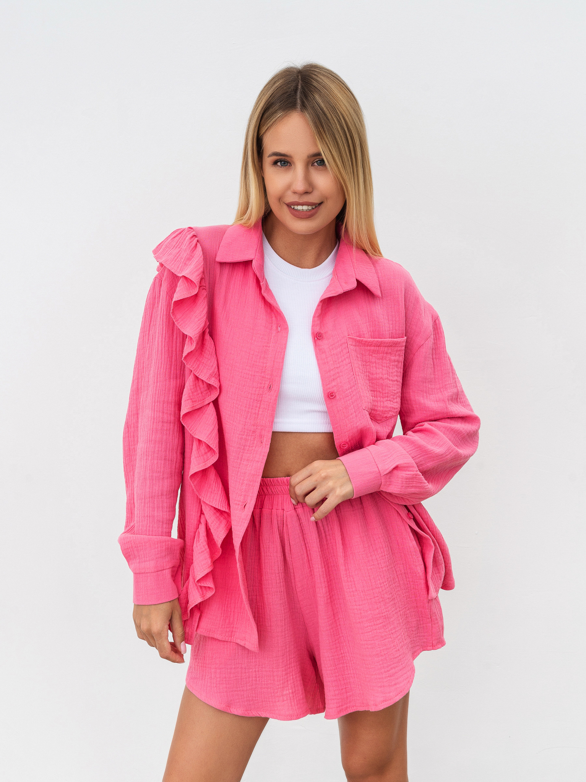 Комплект із вільної сорочки з рюшами та шортів. Натуральний матеріал муслін 100% бавовна. Шорти на високій посадці, талія на еластичній резинці, фасон трохи трапецією. Сорочка вільного крою з опущеною лінією плеча, манжет на ґудзику. Комплект можна носити як разом, так і окремо, компонуючи з іншими речами з гардероба. XS-S Довжина по спині : 64 см Довжина рукава : 54 см Напівобхват стегон : 52 см Плечі : 52 см Посадка : 35 см Напівобхват талії : 28 см S-M Довжина по зовнішньому шву : 40 см Довжина по спині : 64 см Довжина рукава : 55 см Напівобхват стегон : 54 см Плечі : 53 см Посадка : 36 см Напівобхват талії : 30 см M-L овжина по зовнішньому шву : 40 см Довжина по спині : 64 см Довжина рукава : 56 см Напівобхват стегон : 56 см Плечі : 54 см Посадка : 37 см Напівобхват талії : 33 см