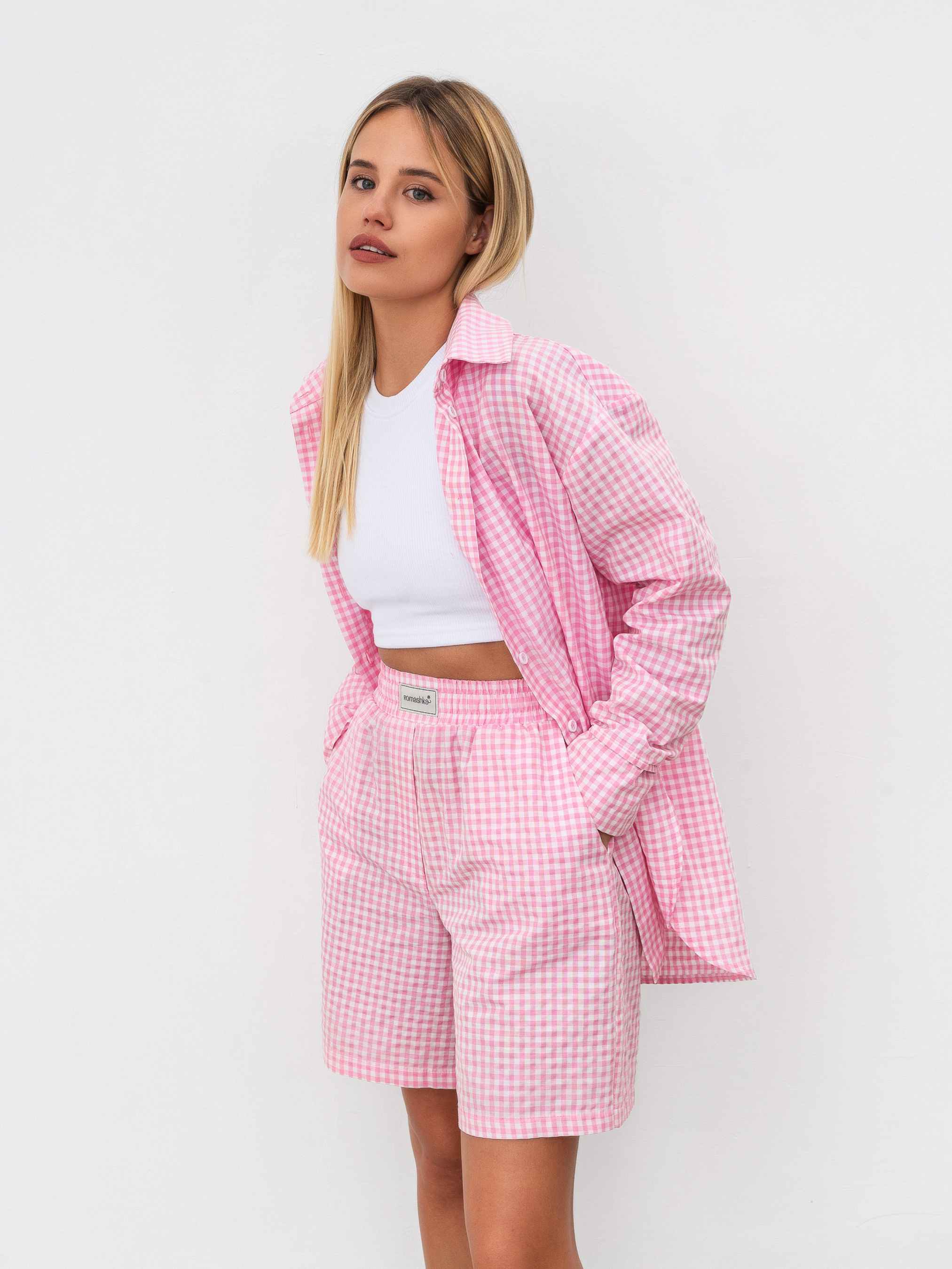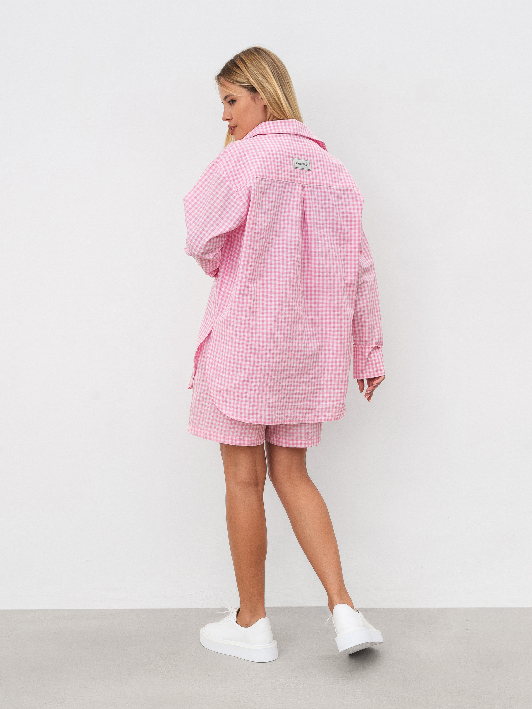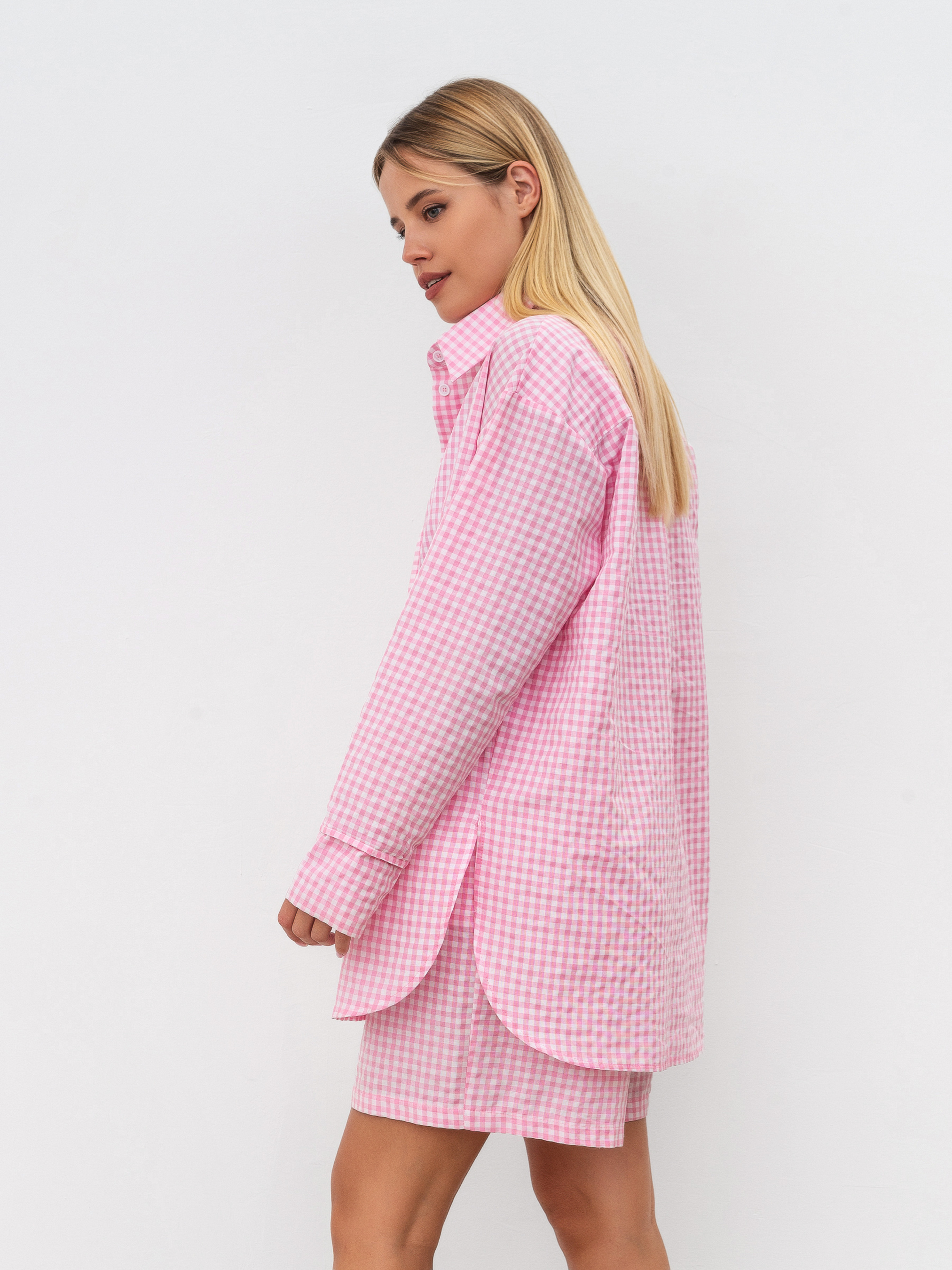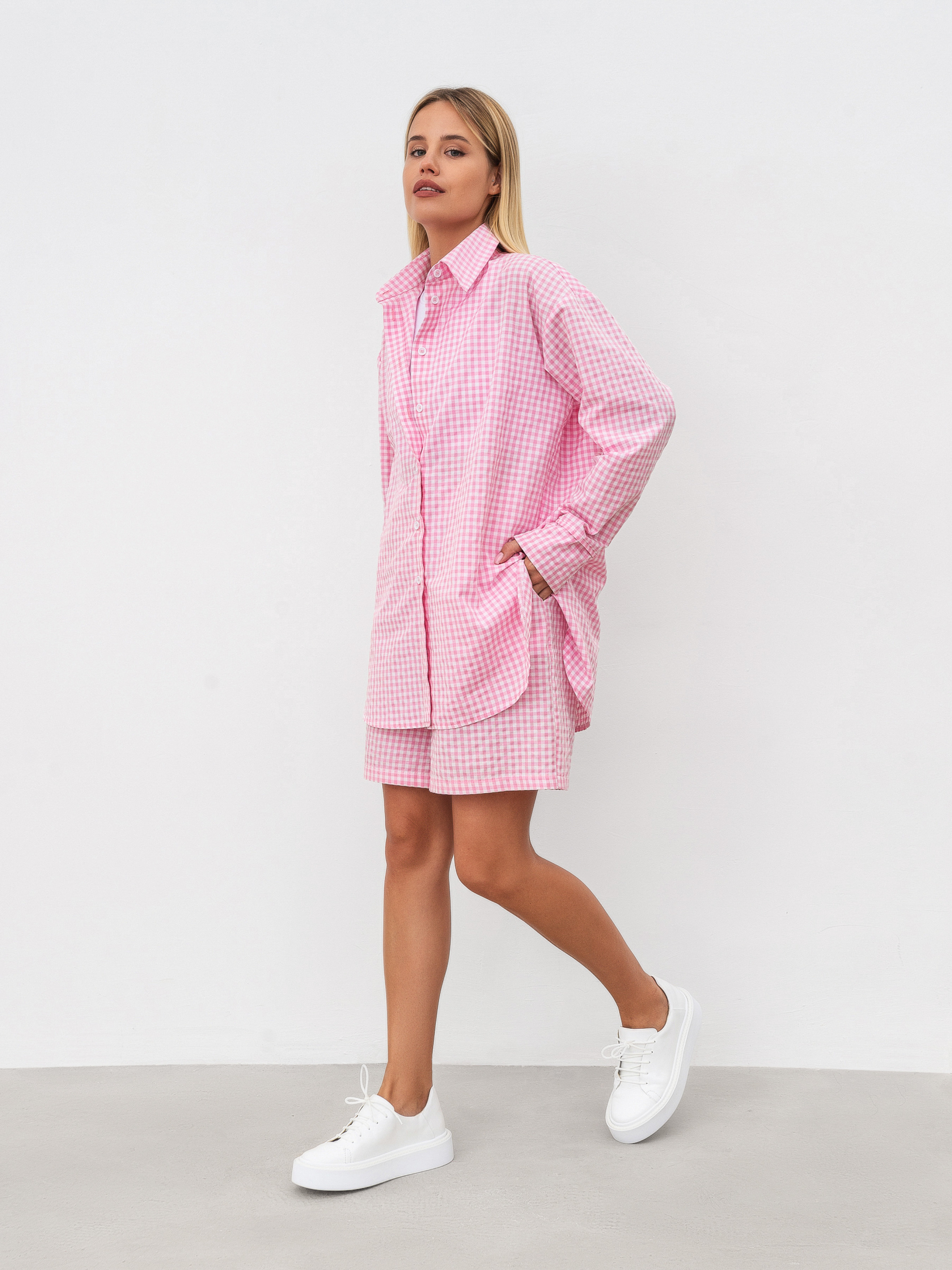 Комплект із подовжених шортів і вільної сорочки. Принт дрібна клітинка. Шорти вільного формату з кишеньками, на талії гумка. Сорочка з м'якими розрізами з боків, вільного фасону. Відмінно можна носити як комплектом, так і окремо. XS-S Довжина по зовнішньому шву : 45 см Довжина по спині : 76 см Довжина рукава : 57 см Напівобхват грудей : 55 см Напівобхват стегон : 50 см Плечі : 51 см Посадка : 29 см Напівобхват талії : 54 см S-M Довжина по зовнішньому шву : 45 см Довжина по спині : 76 см Довжина рукава : 57 см Напівобхват грудей : 59 см Напівобхват стегон : 52 см Плечі : 52 см Посадка : 32 см Напівобхват талії : 56 см M-L Довжина по зовнішньому шву : 45 см Довжина по спині : 76 см Довжина рукава : 57 см Напівобхват грудей : 60 см Напівобхват стегон : 54 см Плечі : 53 см Посадка : 33 см Напівобхват талії : 58 см