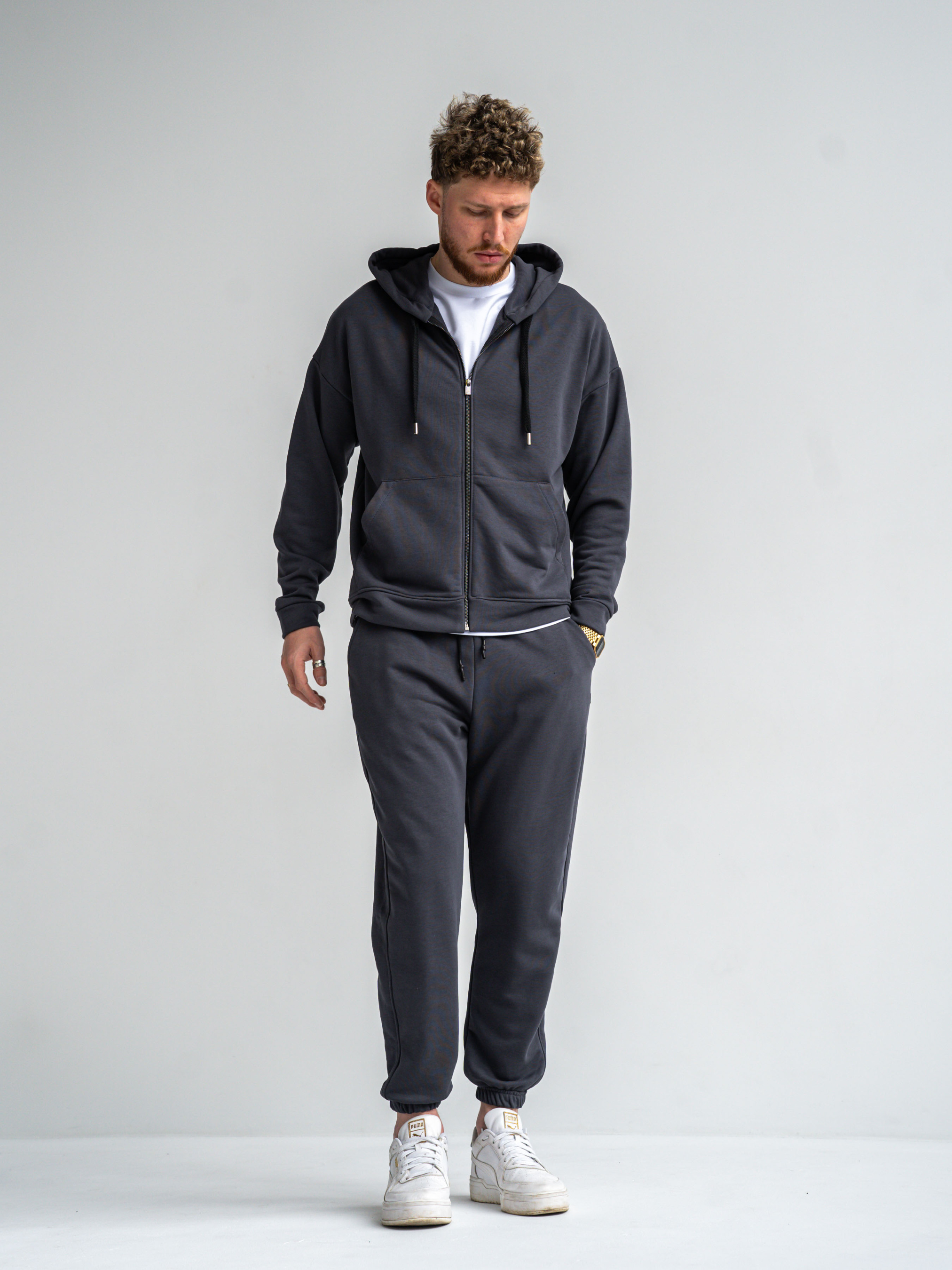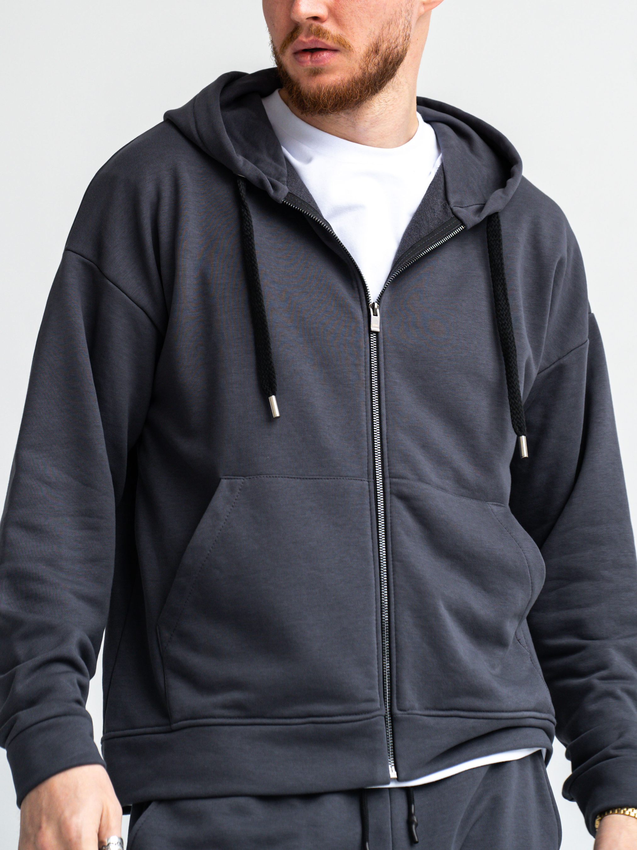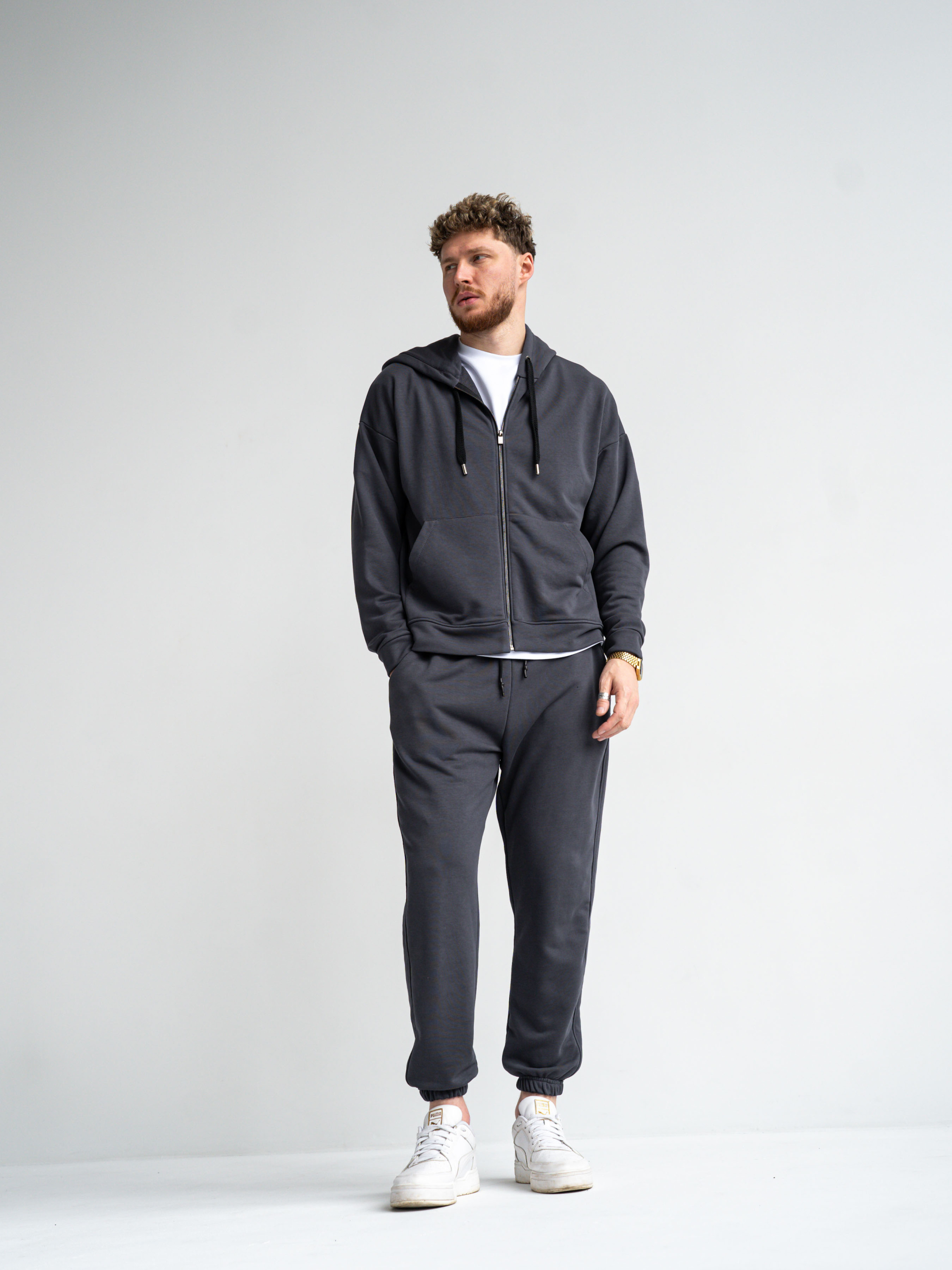 Чоловічий спортивний костюм на блискавці [Zipper] Сезон: Весна-осінь. Костюм із щільної бавовняної тканини Футер тринитка петля. Фурнітура: Металева фурнітура із брендуванням TEAMV преміум якості. Склад тканини: Бавовна 75%, Поліестер 21%, Еластан 4%. На фото розмір M Параметри моделі: Вага 80кг, Зріст 184см.