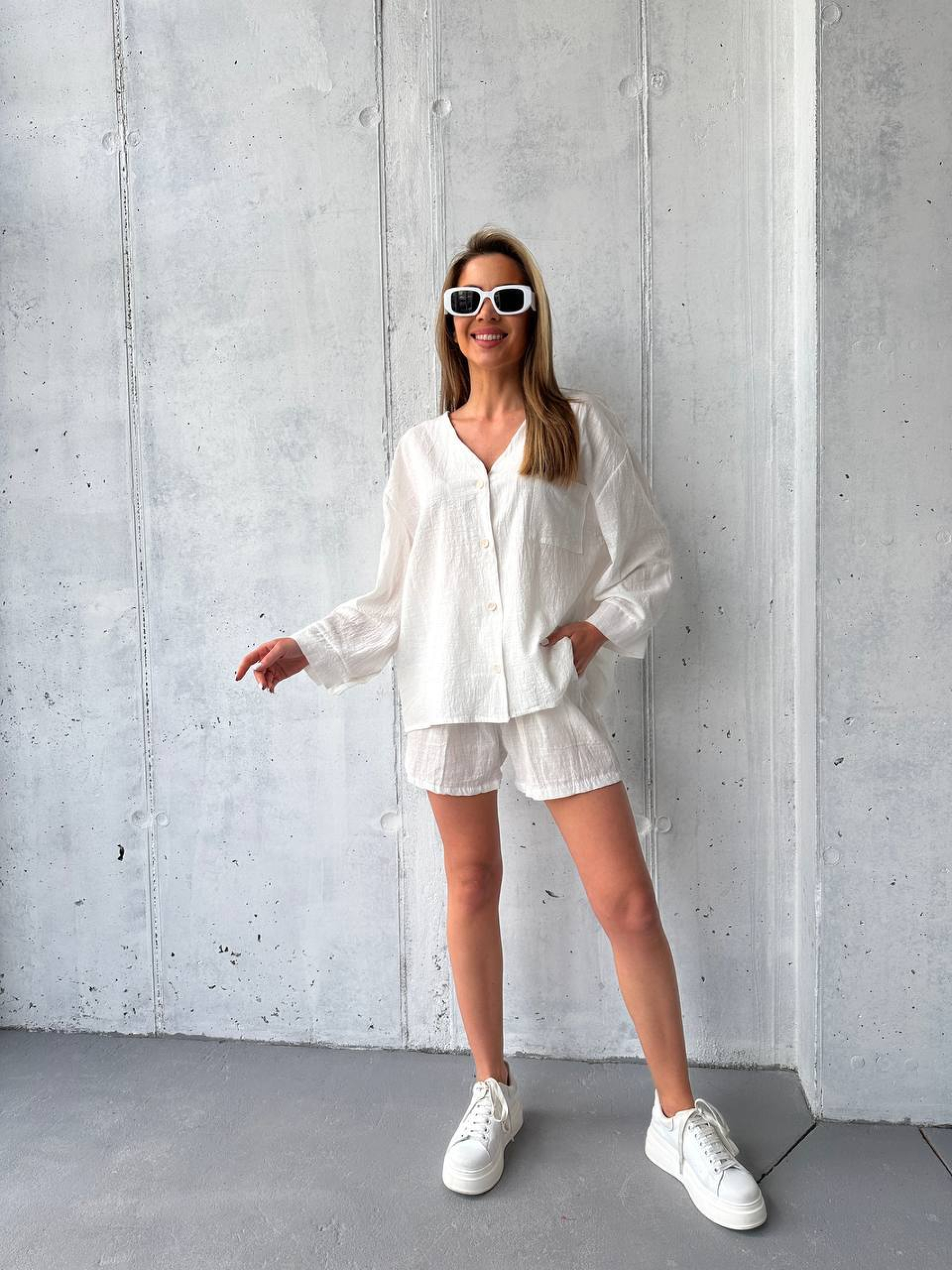 Жіночий лляний костюм (блуза + шорти) — це бездоганне поєднання природної естетики та сучасного комфорту. Цей комплект створений для тих, хто цінує легкість натуральних тканин і лаконічний дизайн. Завдяки світлому відтінку та благородній фактурі, костюм виглядає свіжо та вишукано, стаючи ідеальною базою для вашого літнього гардероба. Чому цей молочний лляний комплект стане вашою улюбленою річчю? Вишукана блуза: Рукав 3/4 та елегантна застібка на ґудзиках дозволяють створювати як стримані офісні, так і розслаблені повсякденні образи. Комфортні шорти: Оптимальна посадка та наявність зручних кишень у бічних швах роблять шорти незамінними для активних міських прогулянок чи відпочинку. Універсальність: Однотонний молочний колір легко комбінується з будь-яким взуттям — від шкіряних сандалій до текстильних кедів. Якість від українського виробника: Костюм створений з урахуванням анатомії тіла, що гарантує ідеальну посадку, а високі стандарти пошиття забезпечують надійність кожного шва. Характеристики: Комплектація: Блуза + шорти Матеріал: Льон (фактура жатка) Склад: 60% Льон, 40% Бавовна Довжина рукава: Рукав 3/4 Застібка: На ґудзиках Тип кишень: У шві Стиль: Повсякденний (Casual) Сезон: Літо Країна виробник: Україна Рекомендації з догляду: Щоб зберегти природну красу льону та молочний відтінок: Прання: Рекомендовано делікатне прання при температурі не вище 30-40°C. Засоби: Використовуйте м'які рідкі засоби без відбілювачів (хлору), щоб не пошкодити волокна тканини. Сушіння: Сушіть у розправленому вигляді на свіжому повітрі. Уникайте пересушування під прямими сонячними променями. Прасування: Завдяки фактурі «жатка» костюм майже не потребує прасування. За потреби прасуйте з вивороту з використанням пари. Костюм розроблено для забезпечення максимального комфорту в спекотні дні: вільний крій не обмежує рухів, а продумані деталі додають образу жіночності. Виготовлений із високоякісного змісового льону, виріб вирізняється довговічністю та зносостійкістю, що дозволить вам насолоджуватися ним протягом багатьох сезонів.