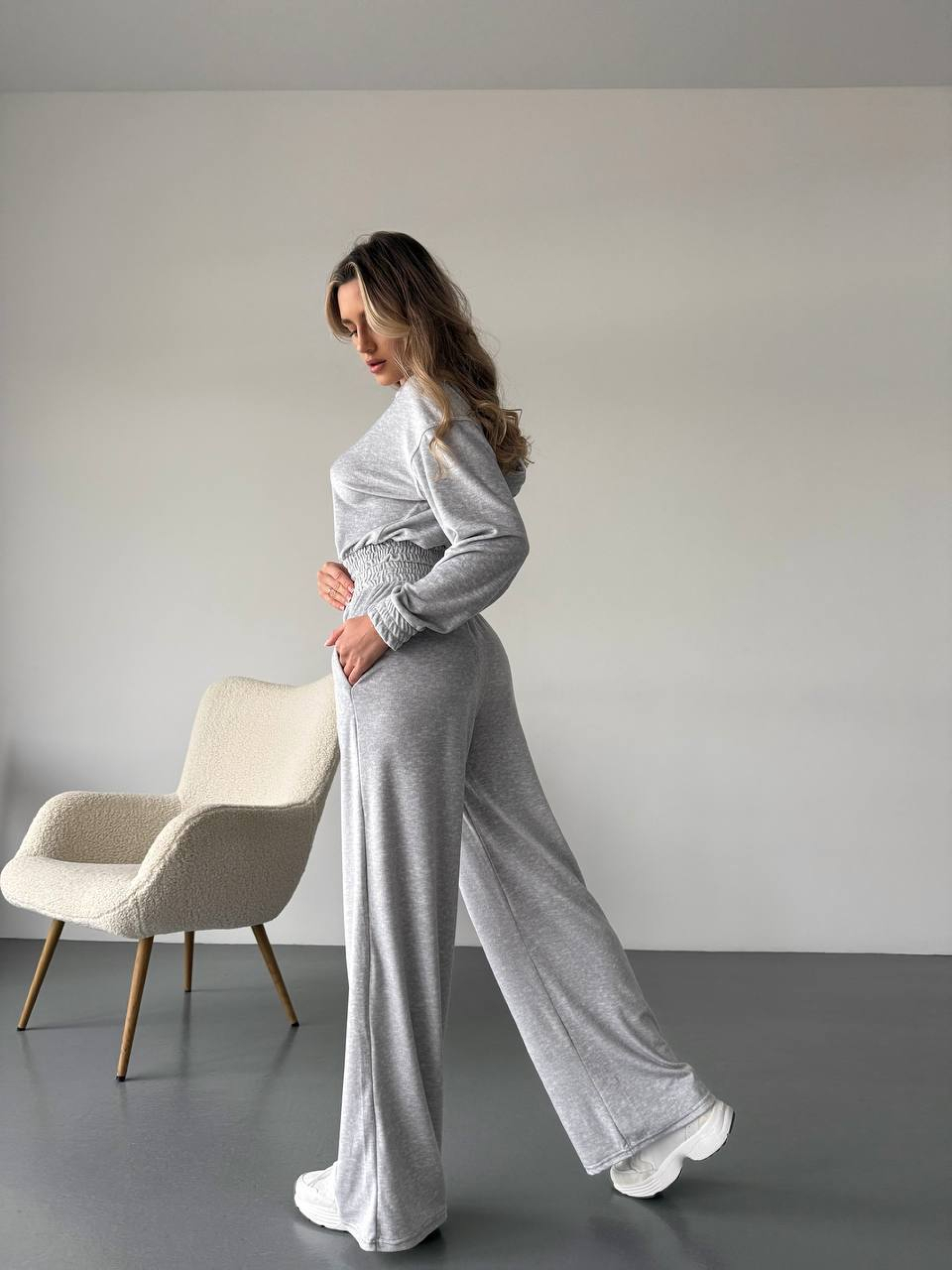 Жіночий велюровий костюм на змійці (худі + штани) у стриманому сірому кольорі — це ідеальне поєднання практичності та сучасного дизайну. Цей легкий костюм розроблений для жінок, які цінують комфорт у кожній деталі, чи то під час ранкової прогулянки, подорожі або активного вихідного дня. Чому цей велюровий костюм — ваш кращий вибір? Практичне худі: Застібка на блискавці (змійці) дозволяє зручно одягати та знімати худі, а також регулювати терморегуляцію залежно від погоди. Капюшон додає образу спортивної динаміки. Зручні штани: Продуманий фасон штанів з кишенями у бічних швах поєднує в собі функціональність та естетику. Класичний сірий колір: Однотонний сірий відтінок є базовим і практичним. Він легко комбінується з кедами, кросівками або демісезонними черевиками будь-якого кольору. Українське виробництво: Кожен костюм пошитий в Україні з великою увагою до якості швів та фурнітури. Характеристики: Комплектація: Худі + штани Колір: Сірий (однотонний) Матеріал: Велюр (фактура плюш) Склад: 70% Поліестер, 25% Бавовна, 5% Спандекс Довжина рукава: Довгий Застібка: На блискавці (змійка) Тип кишень: У шві Стиль: Повсякденний (Casual) Сезон: Демісезон Країна виробник: Україна Рекомендації з догляду: Щоб ваш велюровий костюм залишався як новий: Прання: Вибирайте делікатний режим при температурі не вище 30°C. Періть виріб, попередньо вивернувши його навиворіт. Засоби: Використовуйте м'які гелі, щоб зберегти шовковистість ворсу. Сушіння: Не використовуйте машинну сушку. Сушіть у розправленому вигляді на свіжому повітрі. Прасування: При необхідності прасуйте тільки з вивороту на мінімальній температурі або використовуйте вертикальне відпарювання. Завдяки елегантному вигляду та м'якому переливу велюру, комплект виглядає стильно та актуально. Анатомічний крій забезпечує ідеальну посадку, дозволяючи вам почуватися вільно та впевнено. Високоякісні матеріали гарантують зносостійкість виробу, тому ви зможете насолоджуватися ним протягом багатьох сезонів.