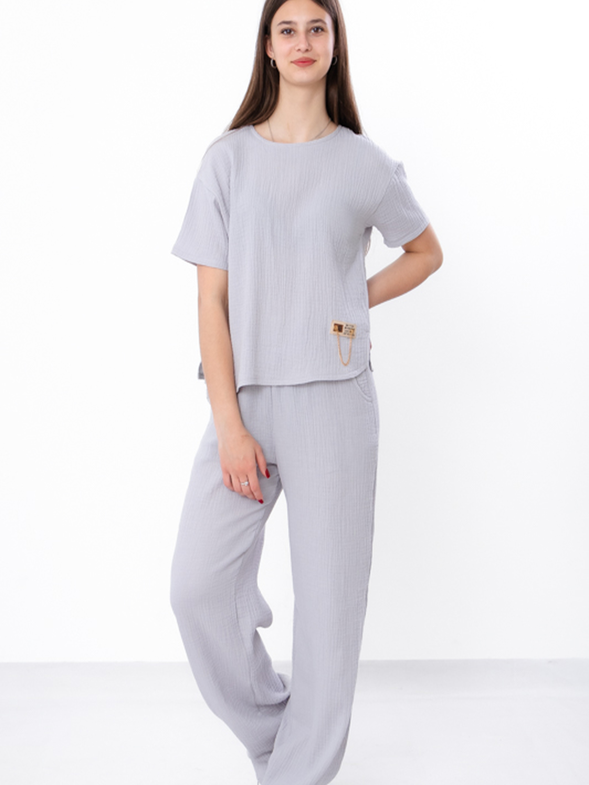 Полотно: муслін Склад полотна: 100% бавовна Зріст: 140-170 Комплект з мусліну - ідеальне поєднання комфорту та стилю для спекотних літніх днів. Поєднання натурального матеріалу та вільного крою робить його ідеальним вибором для повсякденного носіння та прогулянок містом. Комплект складається з блузи та штанів. Блуза виготовлена з м'якого мусліну, що забезпечує неймовірну легкість та повітропроникність. Круглий виріз та короткі рукави роблять блузу універсальною для будь-якого образу. На спині зроблена імітація застібки на гудзики. Також на блузі є невелика нашивка в якості декору. Штани мають вільний прямий крій, дві кишені по бокам. Вільний крій дозволяє шкірі дихати та забезпечує максимальну свободу рухів. Цей комплект дозволить почуватися комфортно протягом літа. Гарно поєднується з босоніжками, кедами або кросівками. Рекомендації з догляду: допускається прання при температурі не більше 20°C, краще прати в прохолодній воді, щоб зберегти м’якість тканини. Прасувати при низькій температурі.