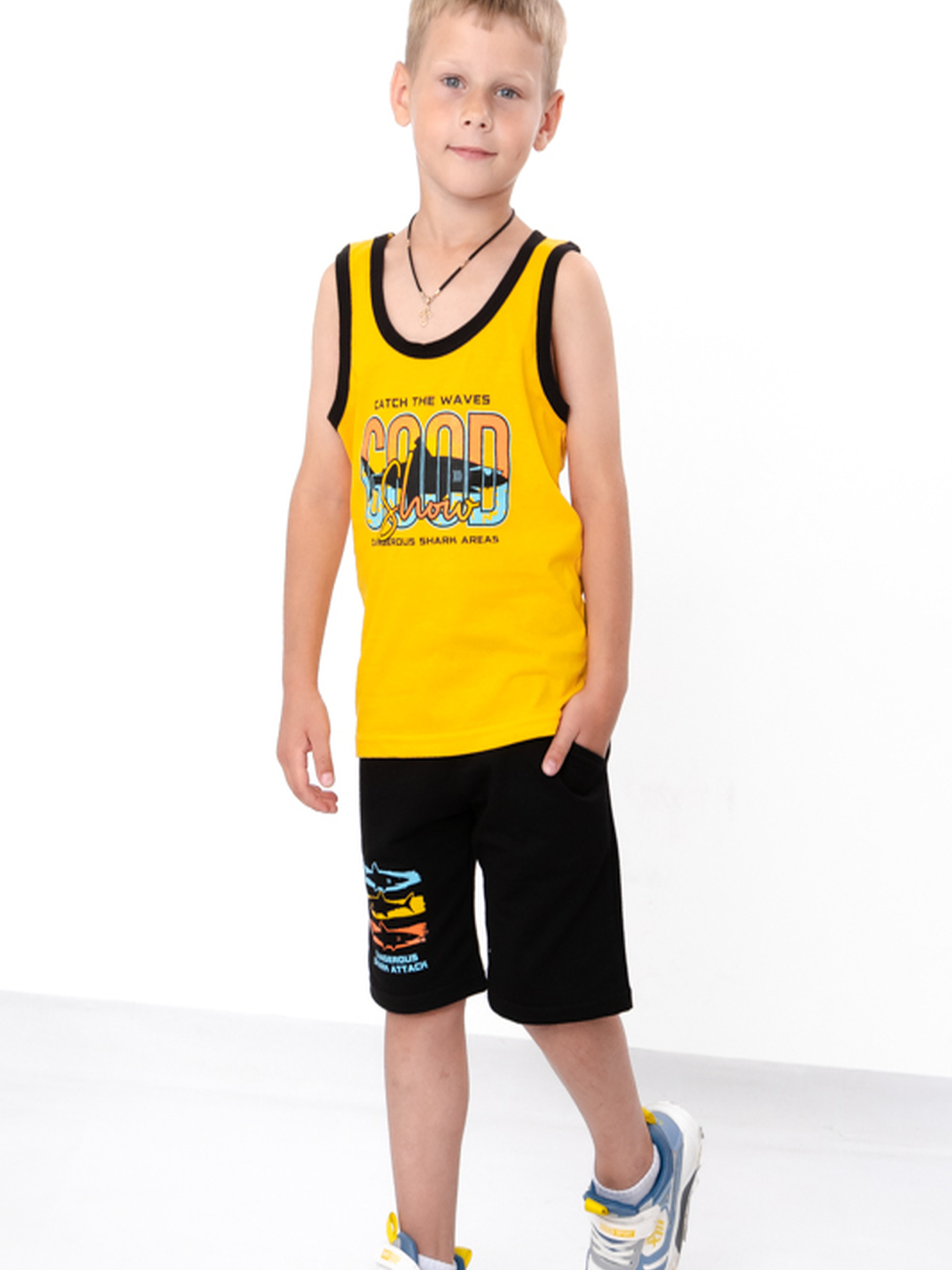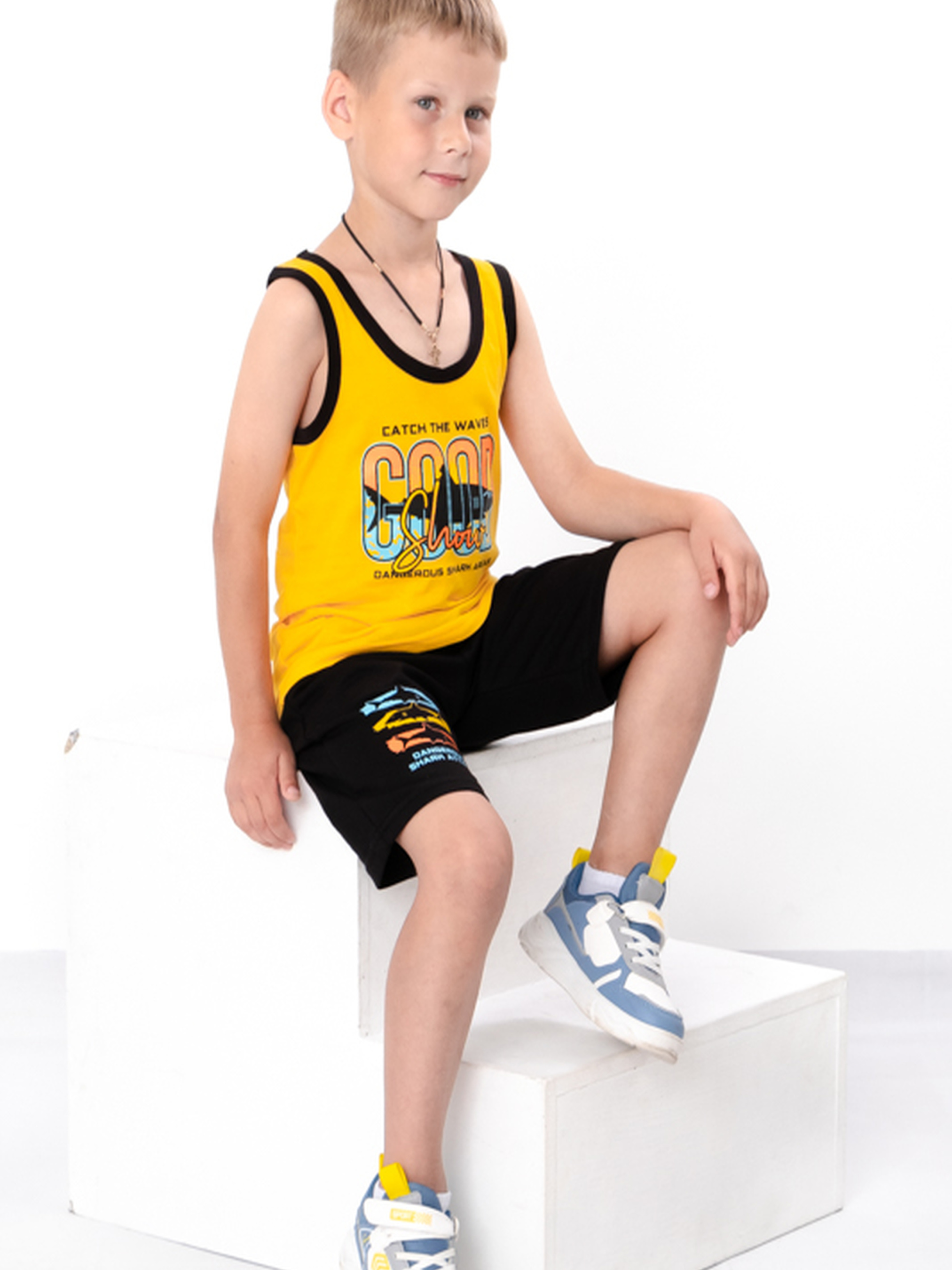 Полотно: двонитка однотонна Склад полотна: 80% бавовна, 20% поліестер Зріст: 110-134 см Комплект для хлопчика (майка + шорти) з двонитки — ідеальний вибір на літо. Майка з яскравим принтом виготовлена з м’якого трикотажу, що добре дихає та не парить у спеку. Шорти — з однотонної тканини, мають вільний крій та еластичний пояс, що забезпечує комфорт і свободу рухів. Підходить для прогулянок, активних ігор, дитсадка чи поїздок. Комплект легко комбінується з іншим одягом.