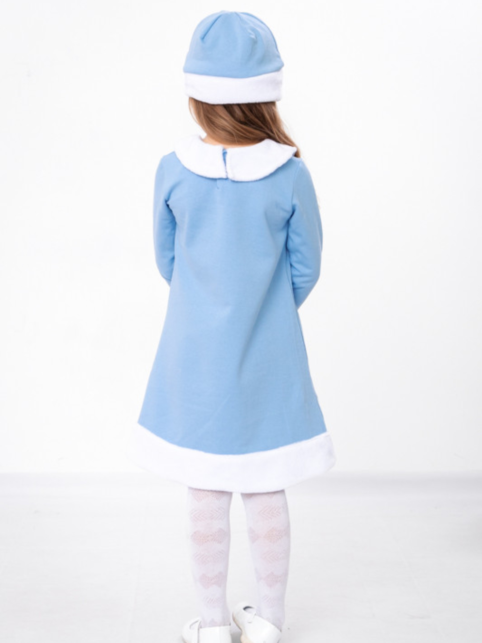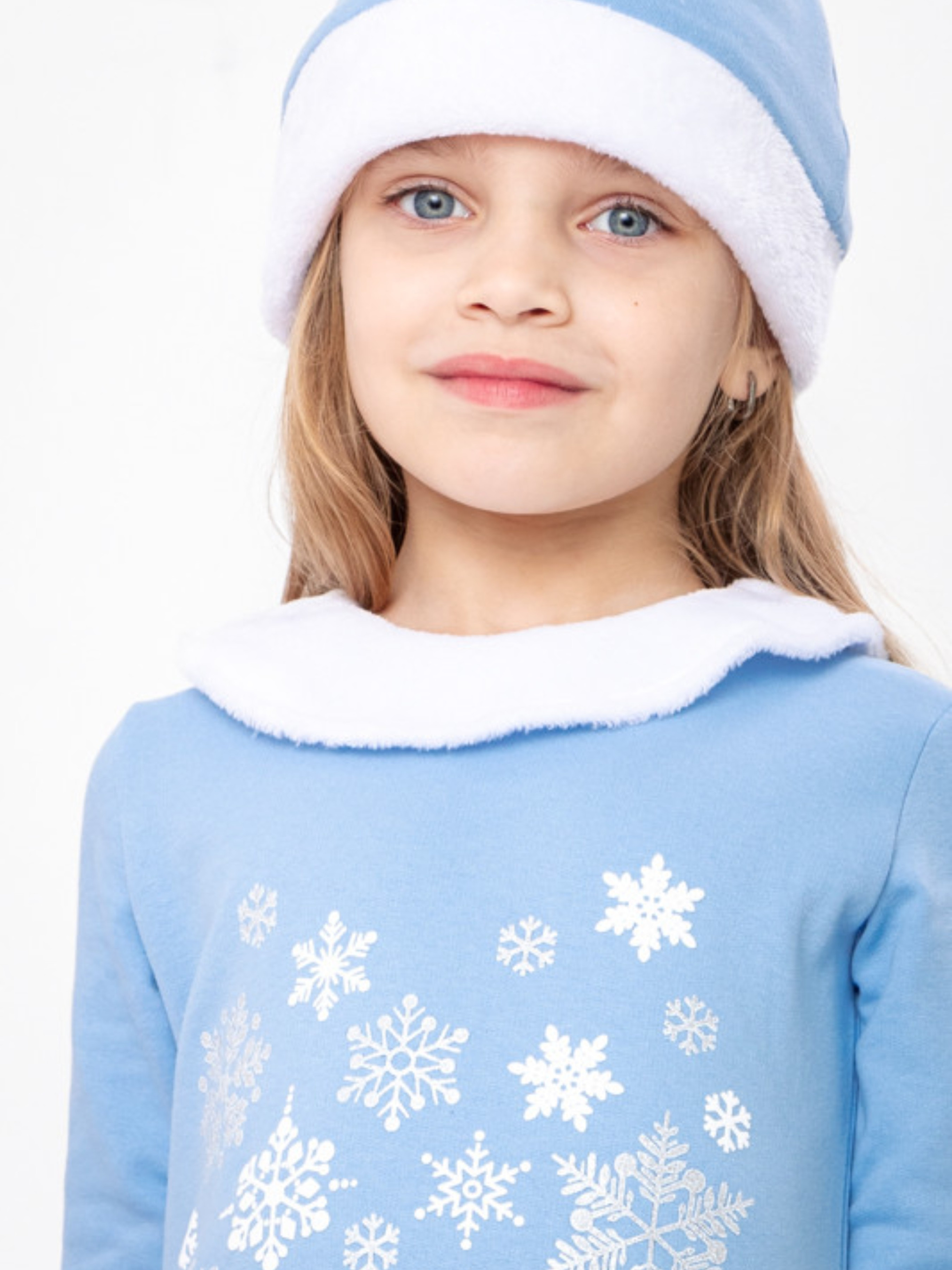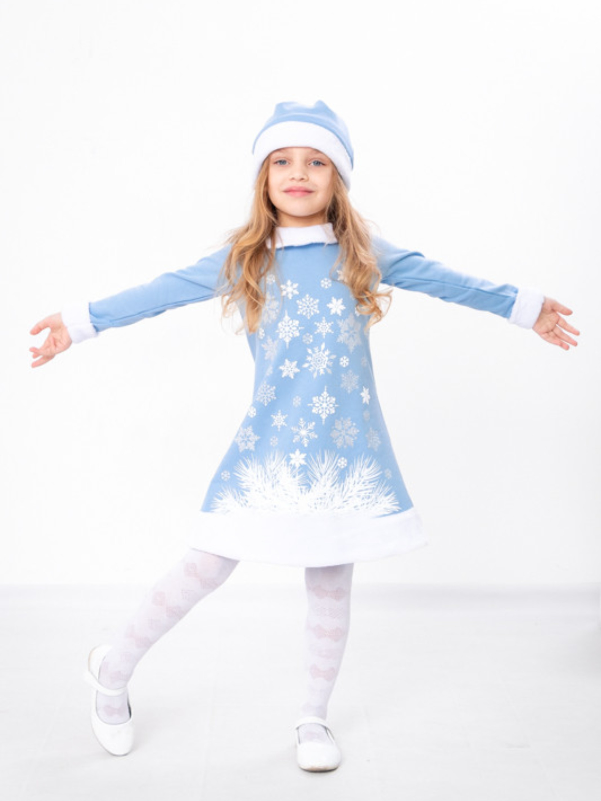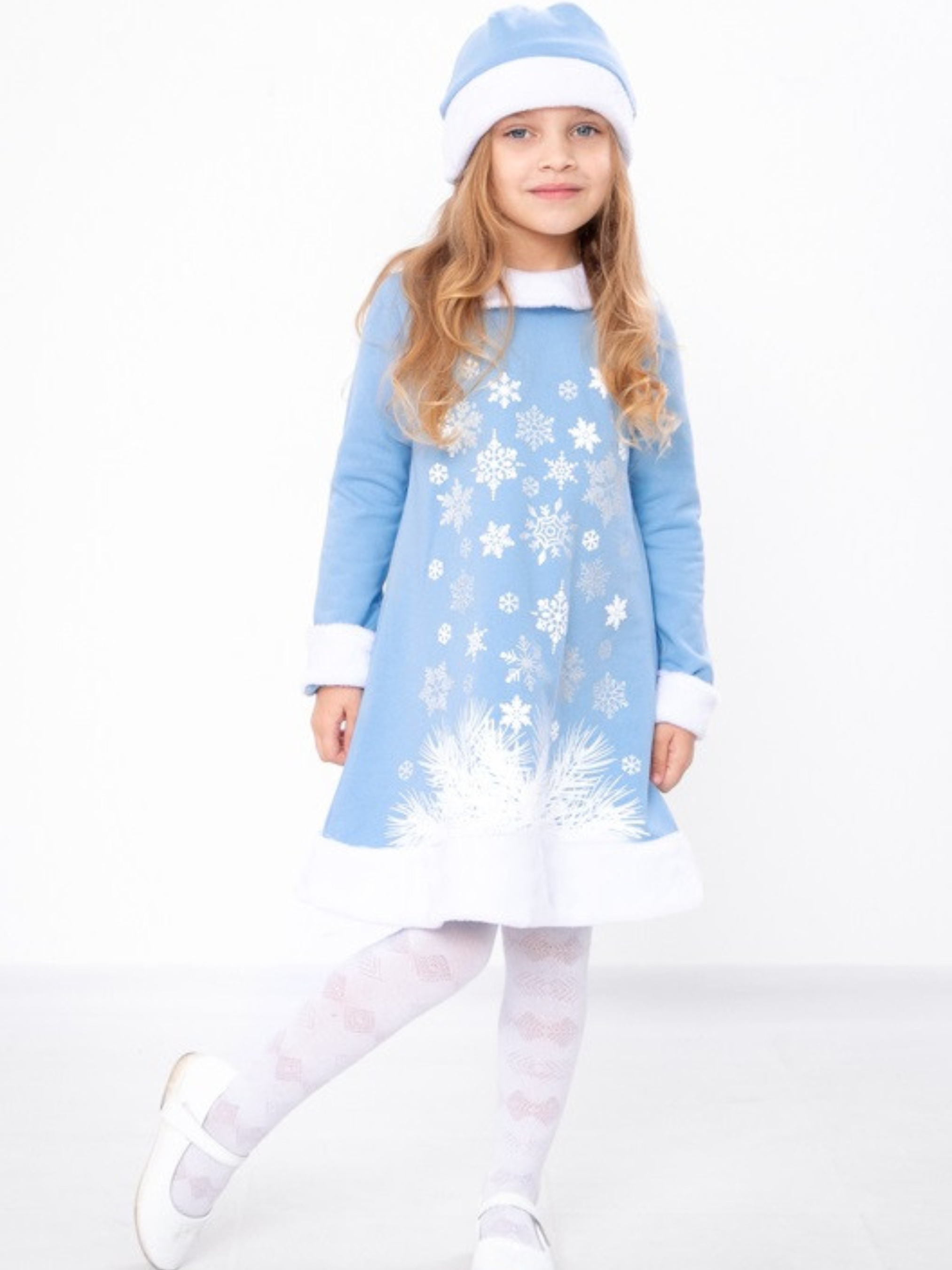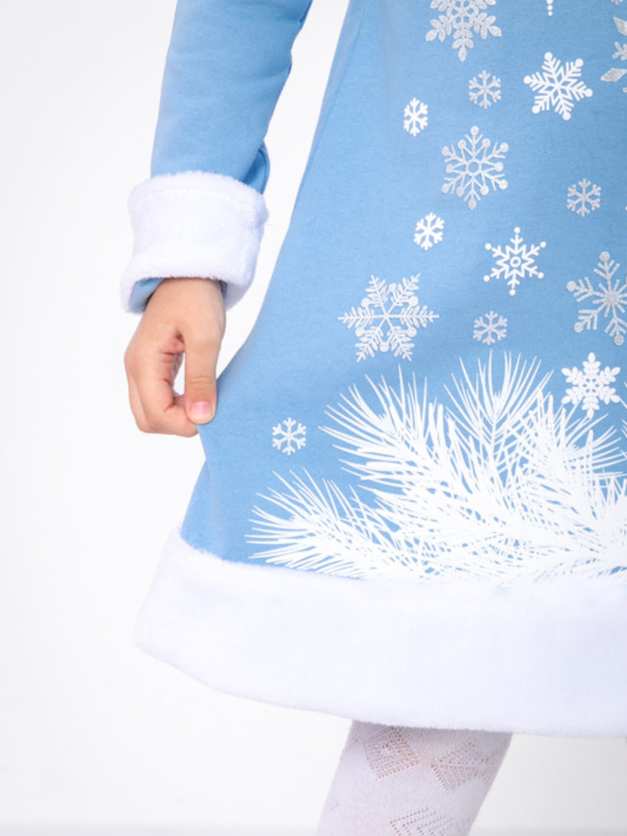 Полотно: начос однотонний + махра біла Склад полотна: начес - 100% бавовна; махра - 100 поліестер Рост: 110 Красивий новорічний костюми для дівчинки. Пошитий з натурального полотна – начос. Прикрашений костюм по низу сукні та на рукавах махрою. Костюм складається із сукні яка застібається ззаду на кнопку та шапочки. На сукні зроблений цікавий накат із додаванням сріблястих блискіток. Комплект прати при температурі не більше 30 градусів та при легкому віджиманні.