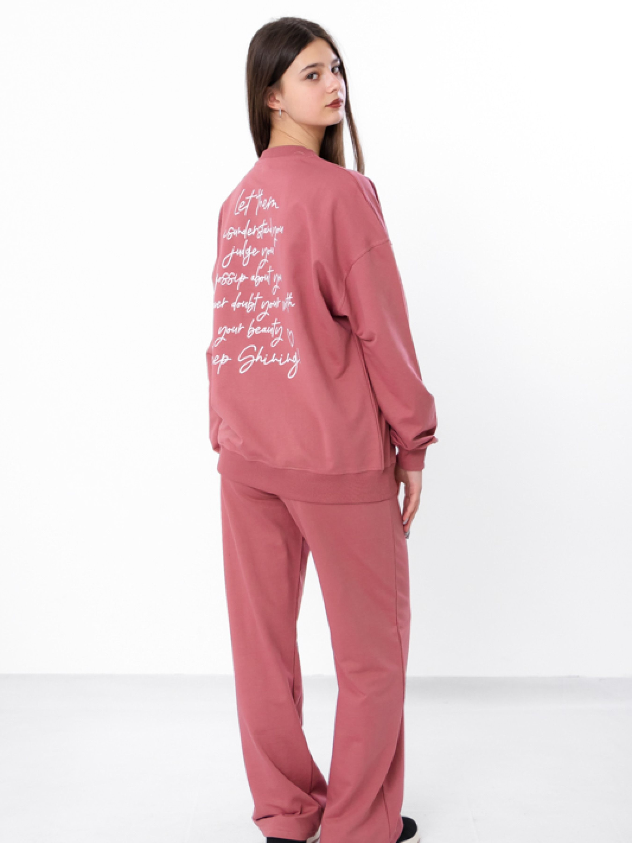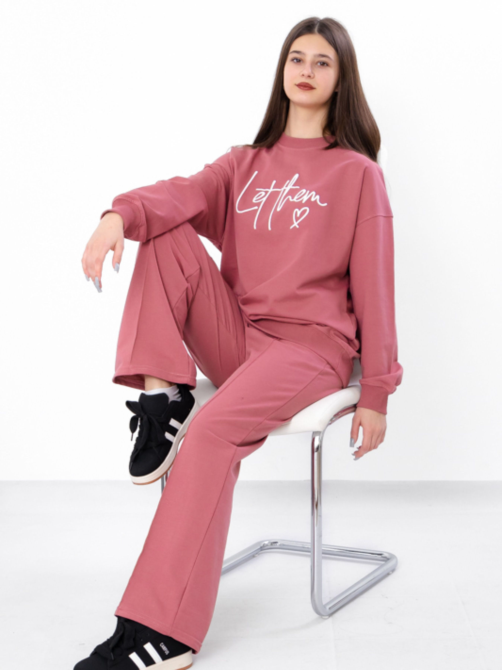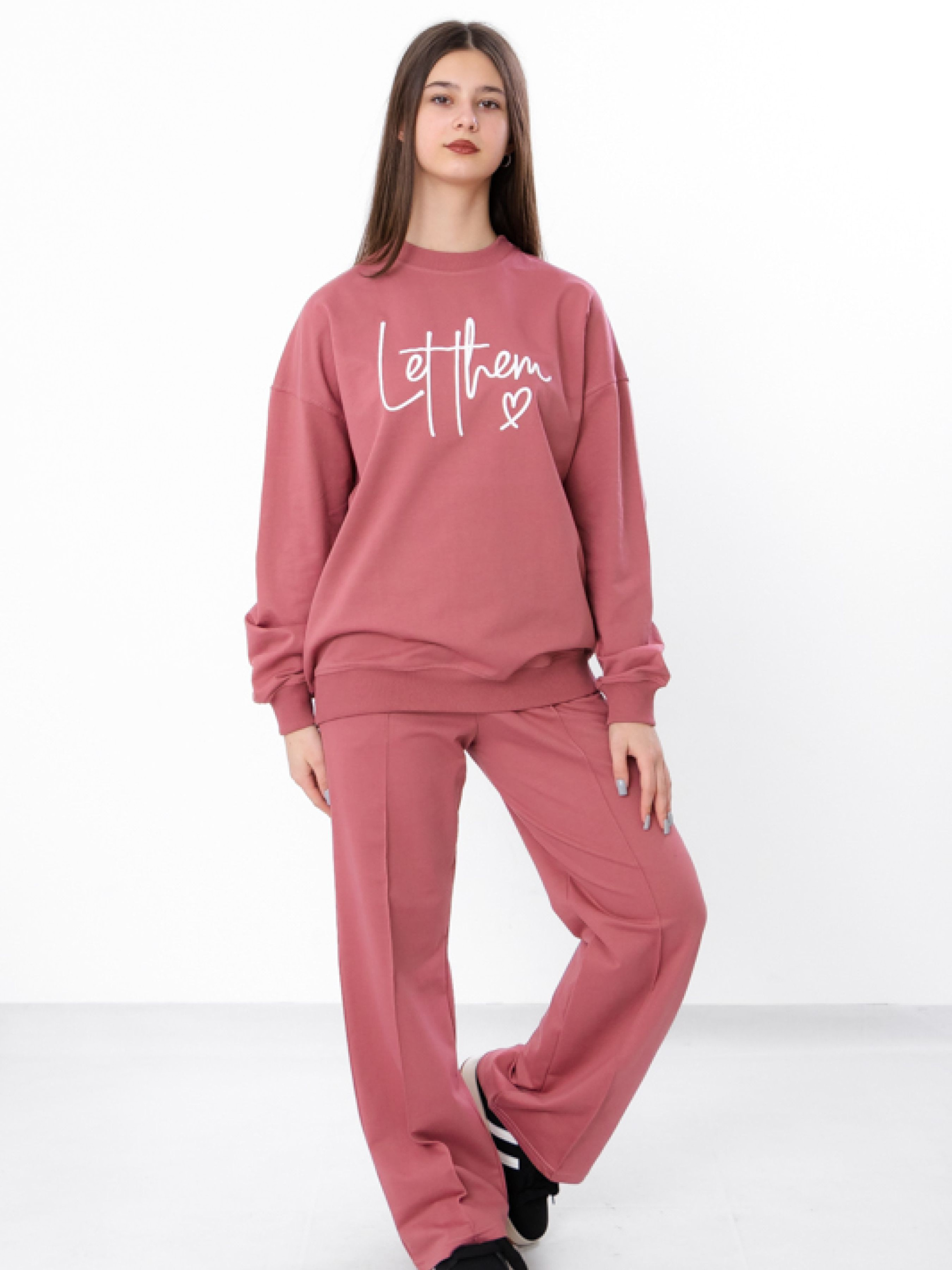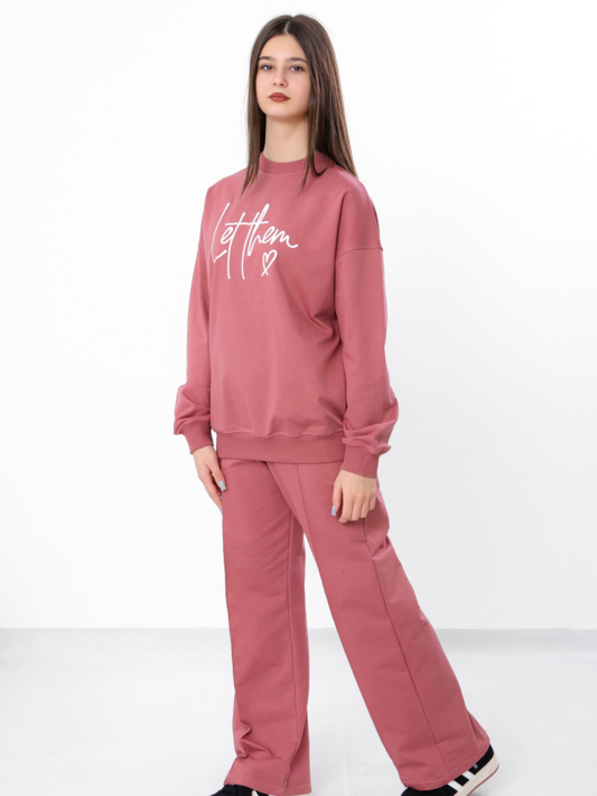 Полотно: двонитка однотонна Склад полотна: 80% бавовна, 20% поліестер Зріст: 140-170 Костюм для дівчинки-підлітка з двонитки однотонного полотна в кольорі темний графіт. Модель складається з стильного світшоту та штанів з модними надписами, що додають образу актуальності та яскравості. Зручний крій і м'яка тканина забезпечують комфорт протягом усього дня, а універсальний колір дозволяє поєднувати костюм з різними аксесуарами та взуттям. Ідеальний варіант для активних дівчат, які хочуть виглядати стильно і відчувати себе комфортно.