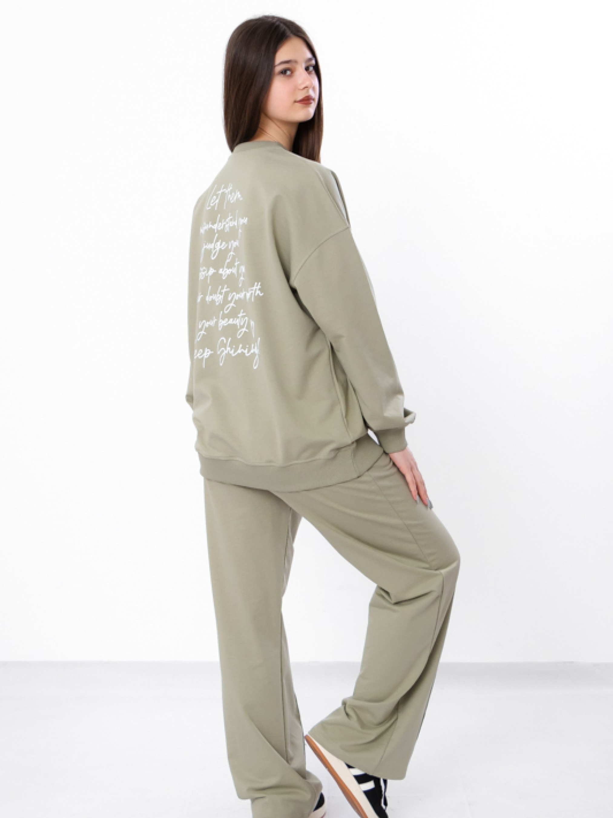 Полотно: двонитка однотонна Склад полотна: 80% бавовна, 20% поліестер Зріст: 140-170 Костюм для дівчинки-підлітка з двонитки однотонного полотна в кольорі темний графіт. Модель складається з стильного світшоту та штанів з модними надписами, що додають образу актуальності та яскравості. Зручний крій і м'яка тканина забезпечують комфорт протягом усього дня, а універсальний колір дозволяє поєднувати костюм з різними аксесуарами та взуттям. Ідеальний варіант для активних дівчат, які хочуть виглядати стильно і відчувати себе комфортно.
