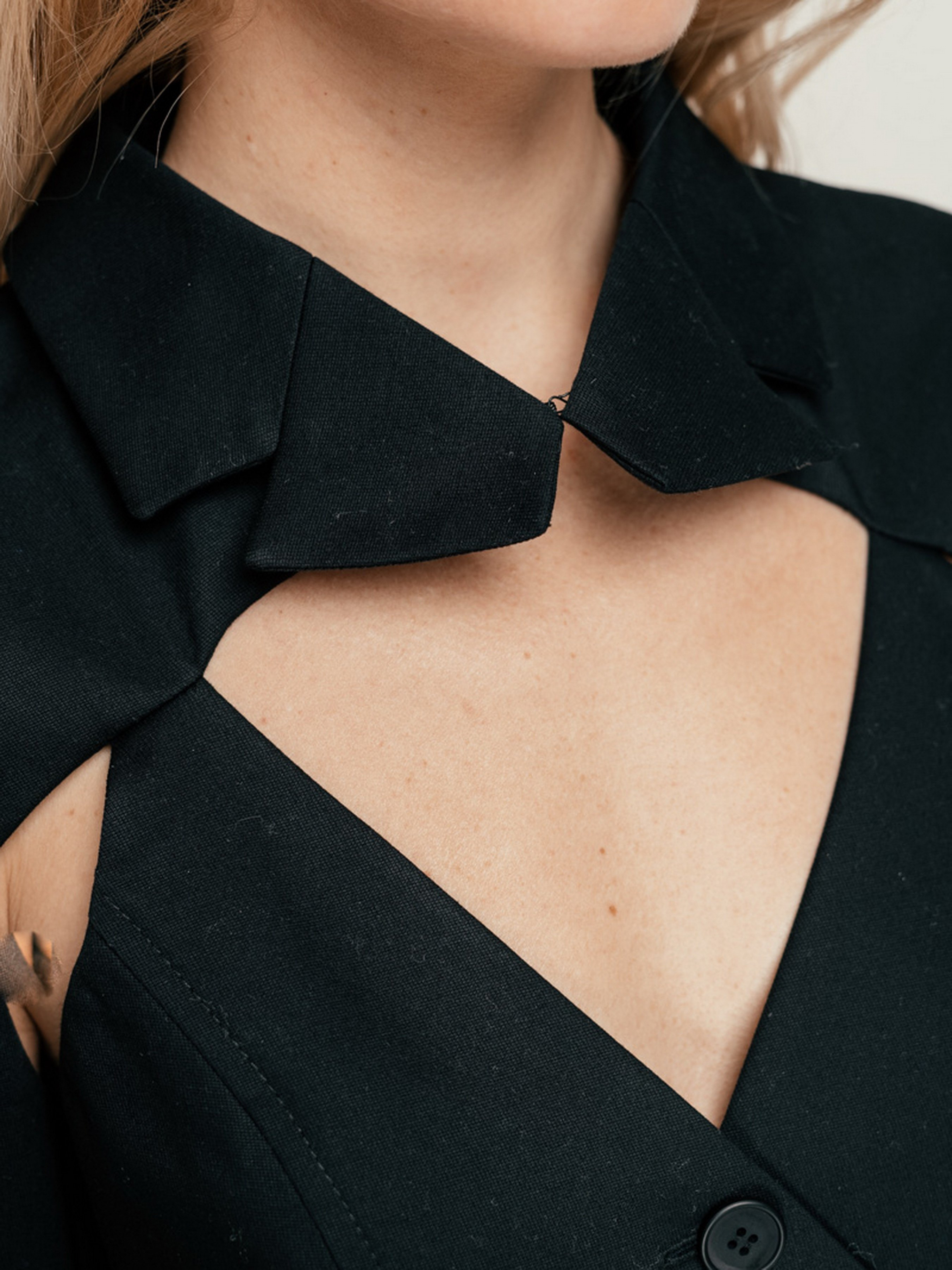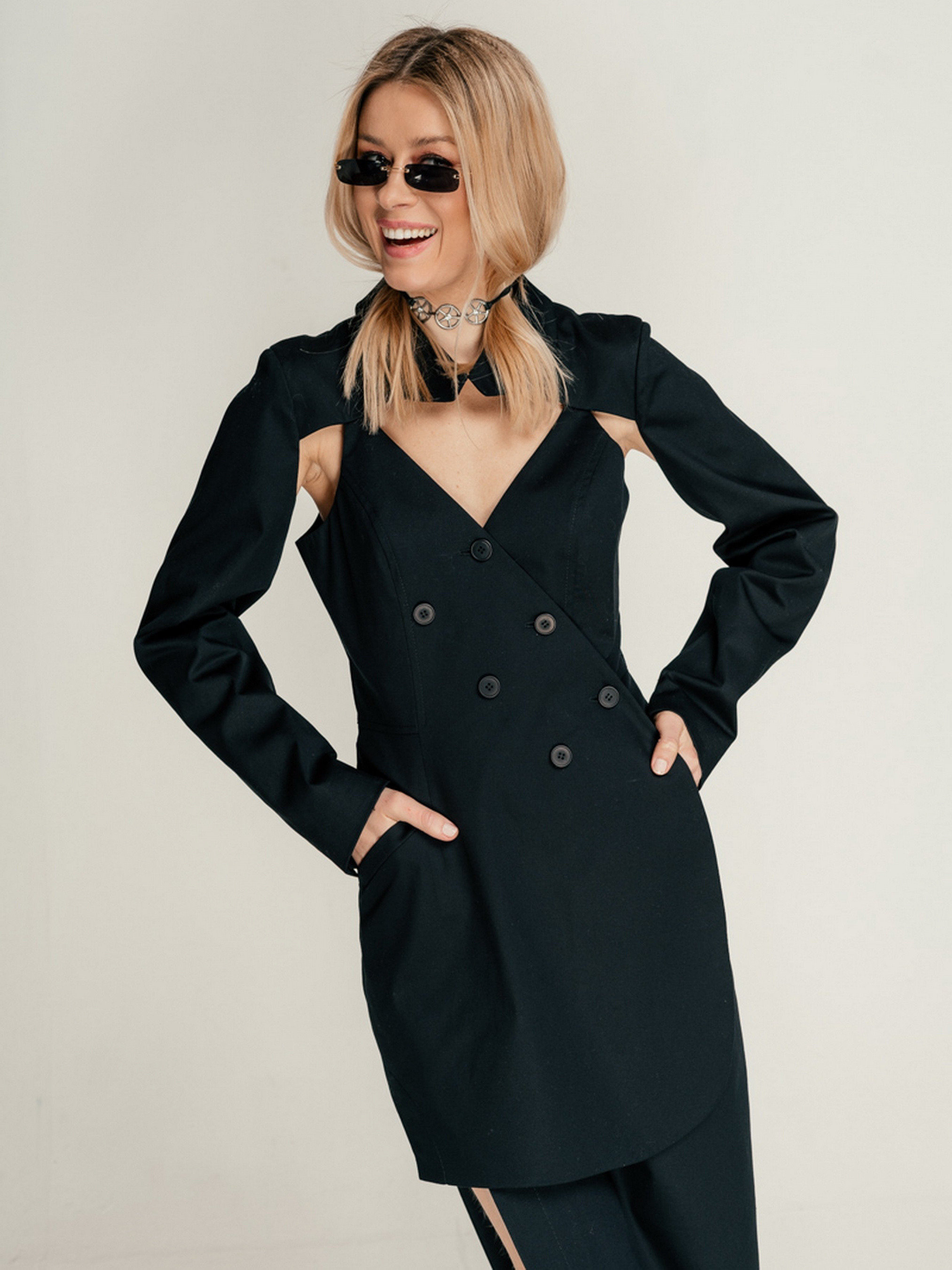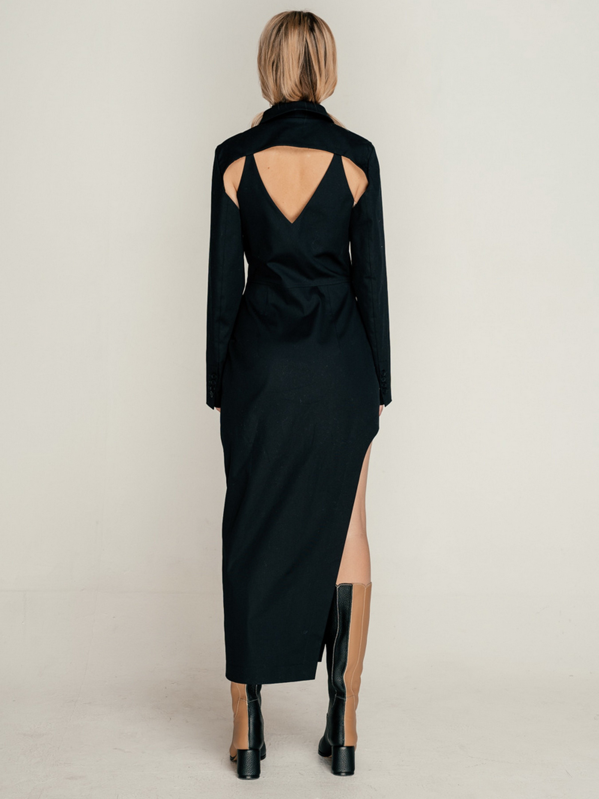 Платье- піджак приталеного силуету на підкладці. Двобортна зміщена застібка на запах. Довгий рукав, сорочковий комір. Глибокий виріз на спині.