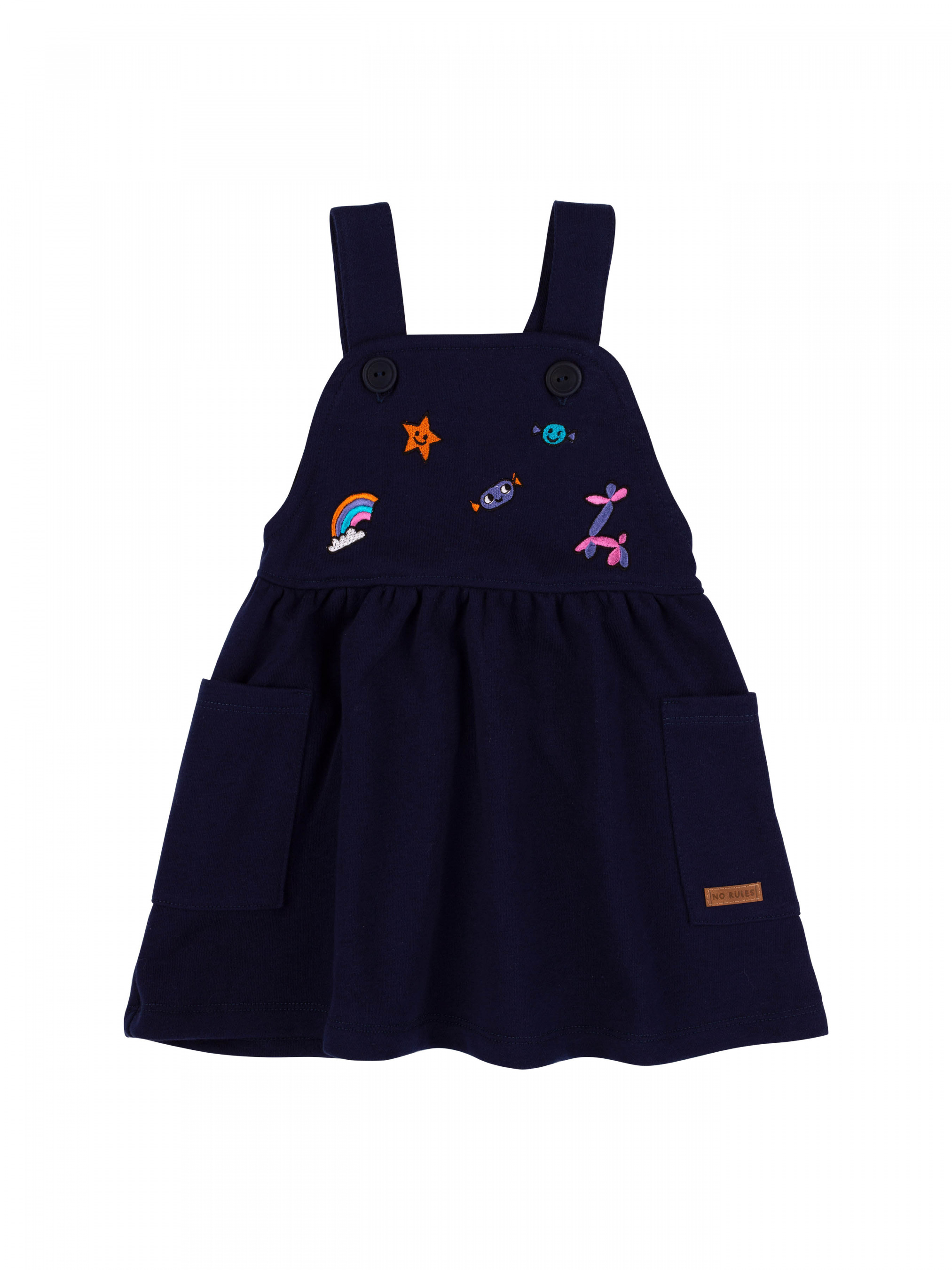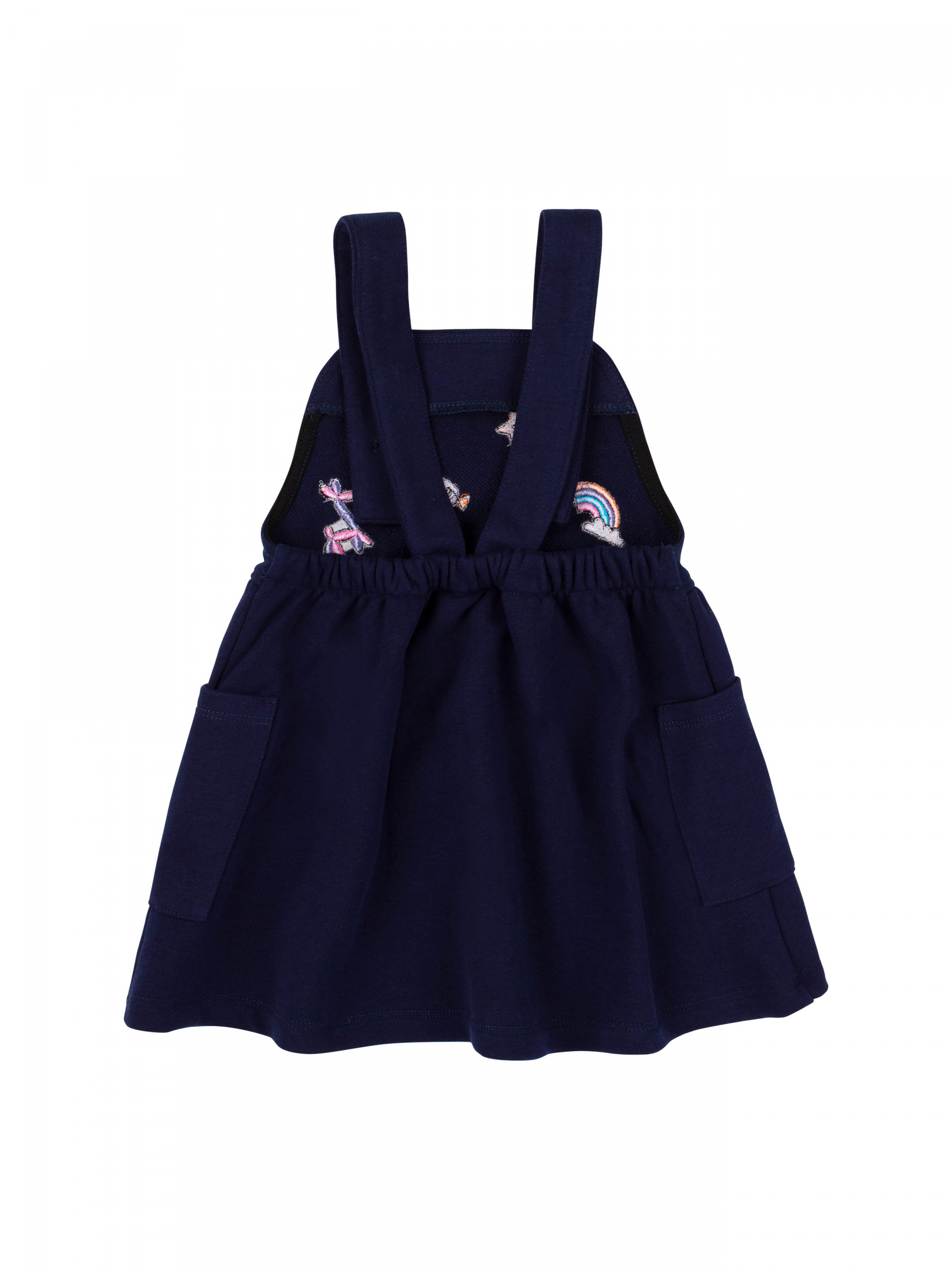 Сарафан для дівчинки на широких бретелях. Спідниця А-силуету. По боках нашивні місткі кишені. Тканина - трикотаж тринитка.Сарафан можна одягнути на футболку, сорочку, блузу чи лонгслів.