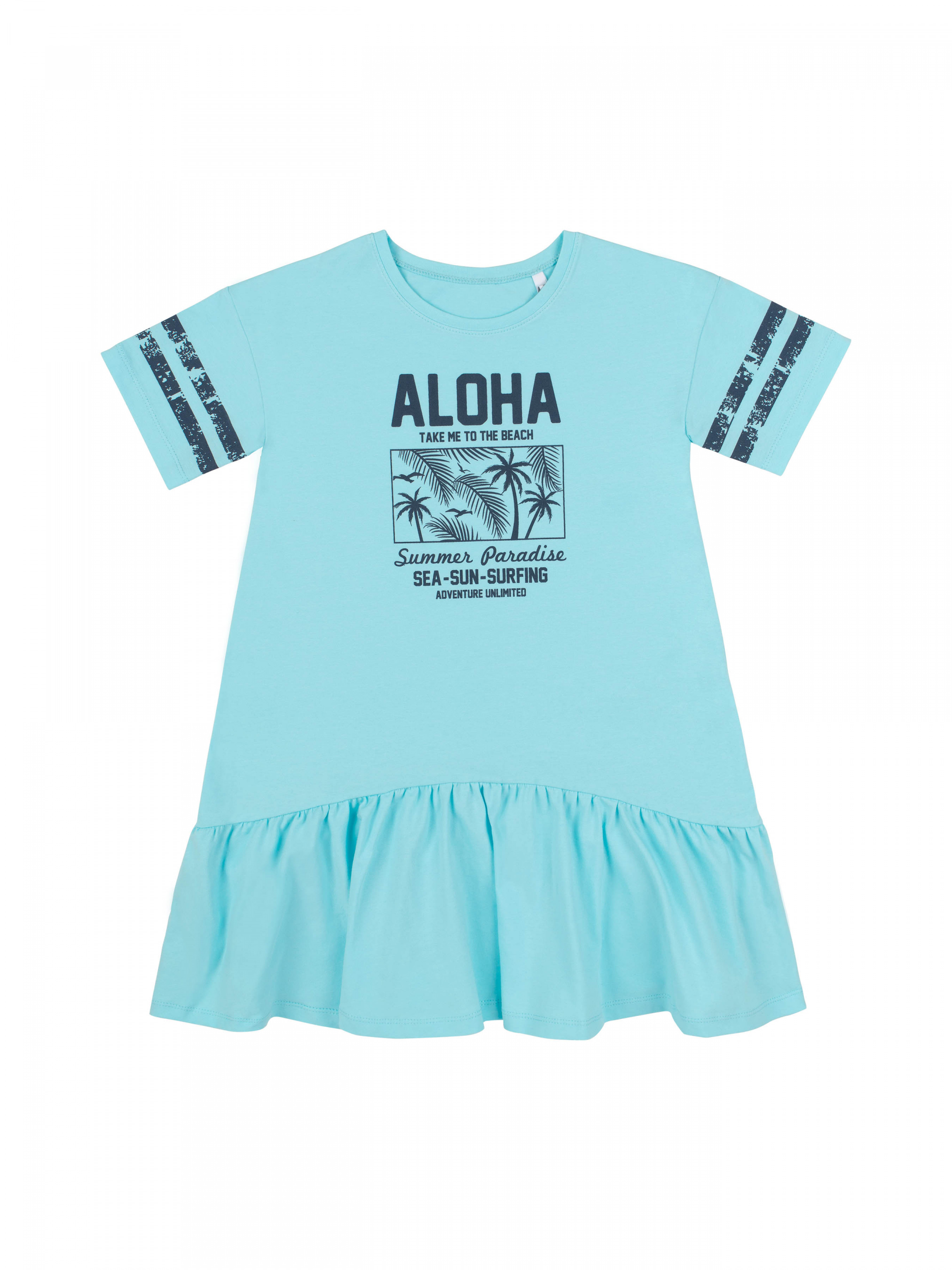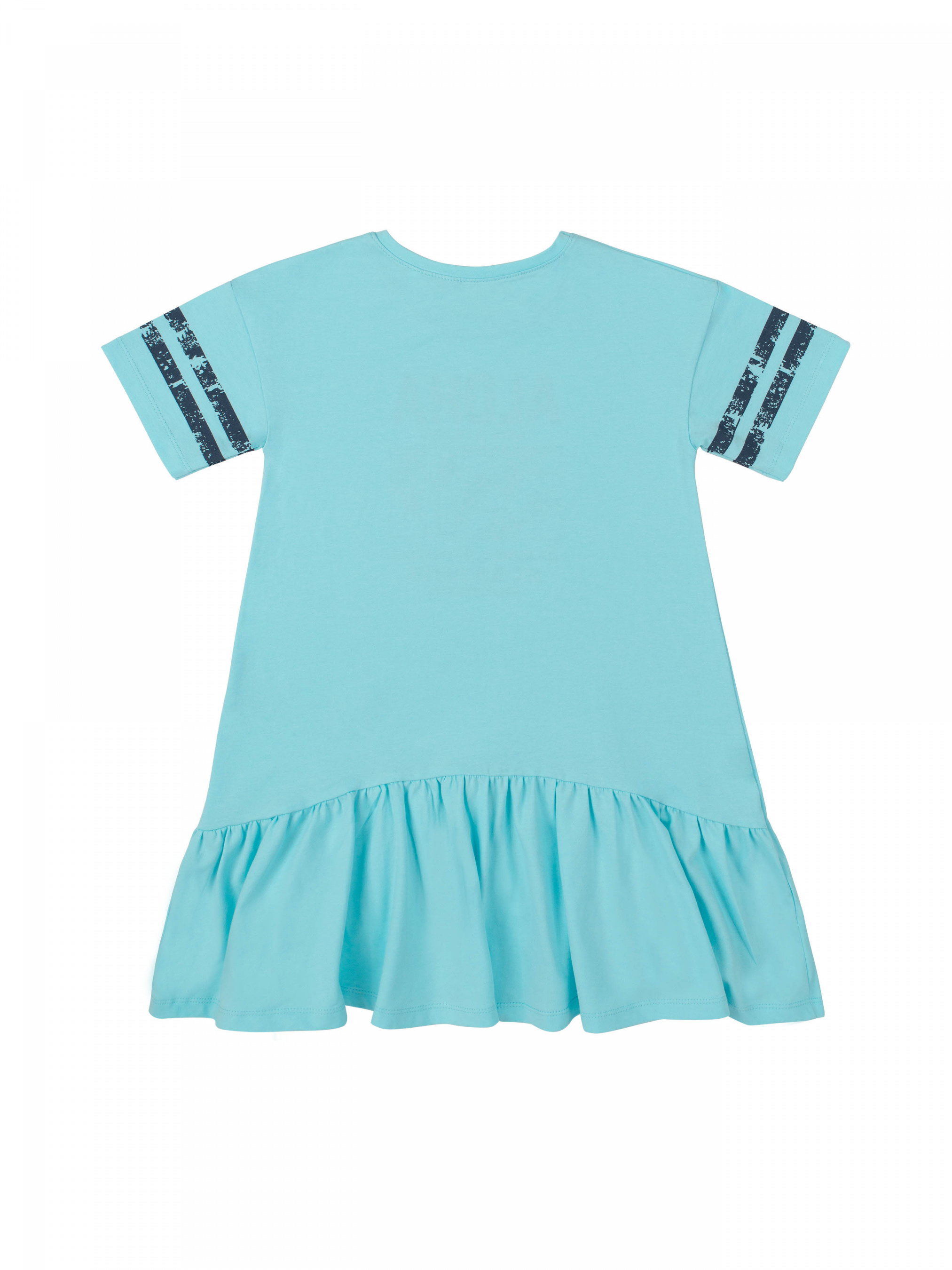 Сукня з коротким рукавом для дівчинки. Крій вільний, довжина середня. По низу широка рюша. Тканина еластична, спереду принт.
