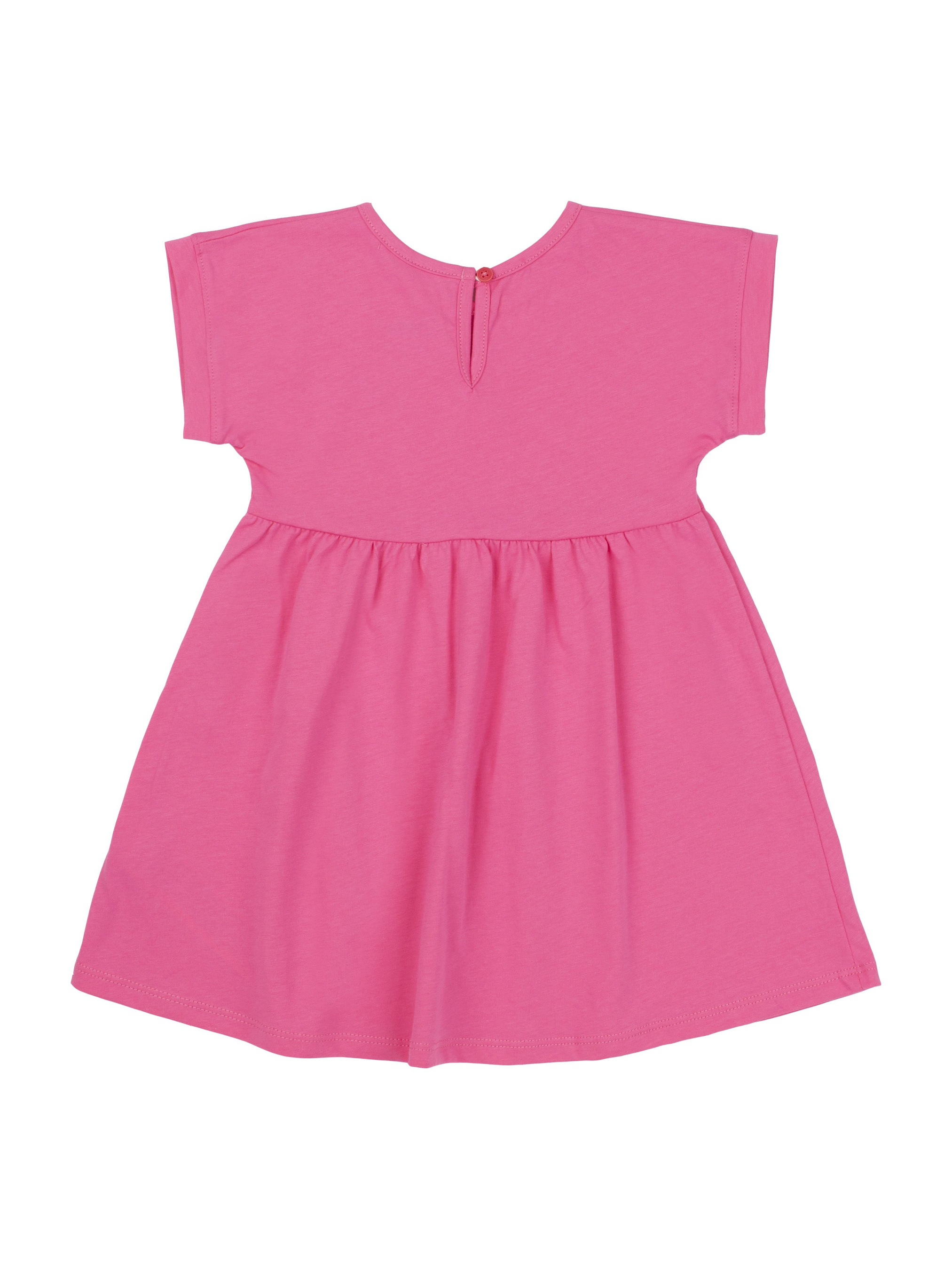 Сукня відрізна по талії, розширена до низу. Нижня частина сукні зі зборкою. Перед оздоблений друком. Рукава — цільнокроєні, короткі, по низу з манжетами. На спинці застібка “крапелька”. Горловина оброблена обкантовкою.