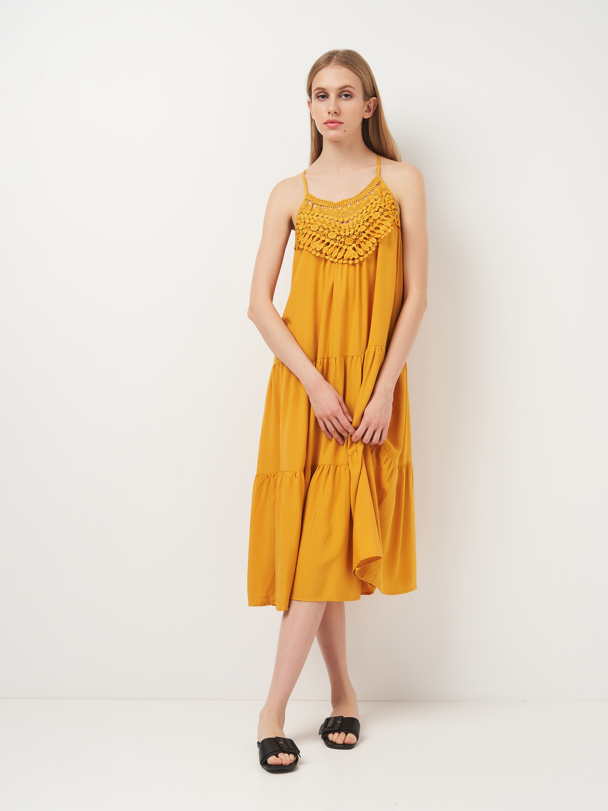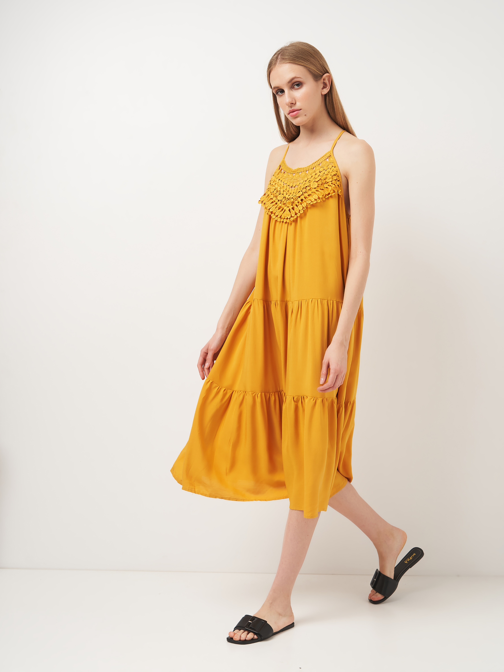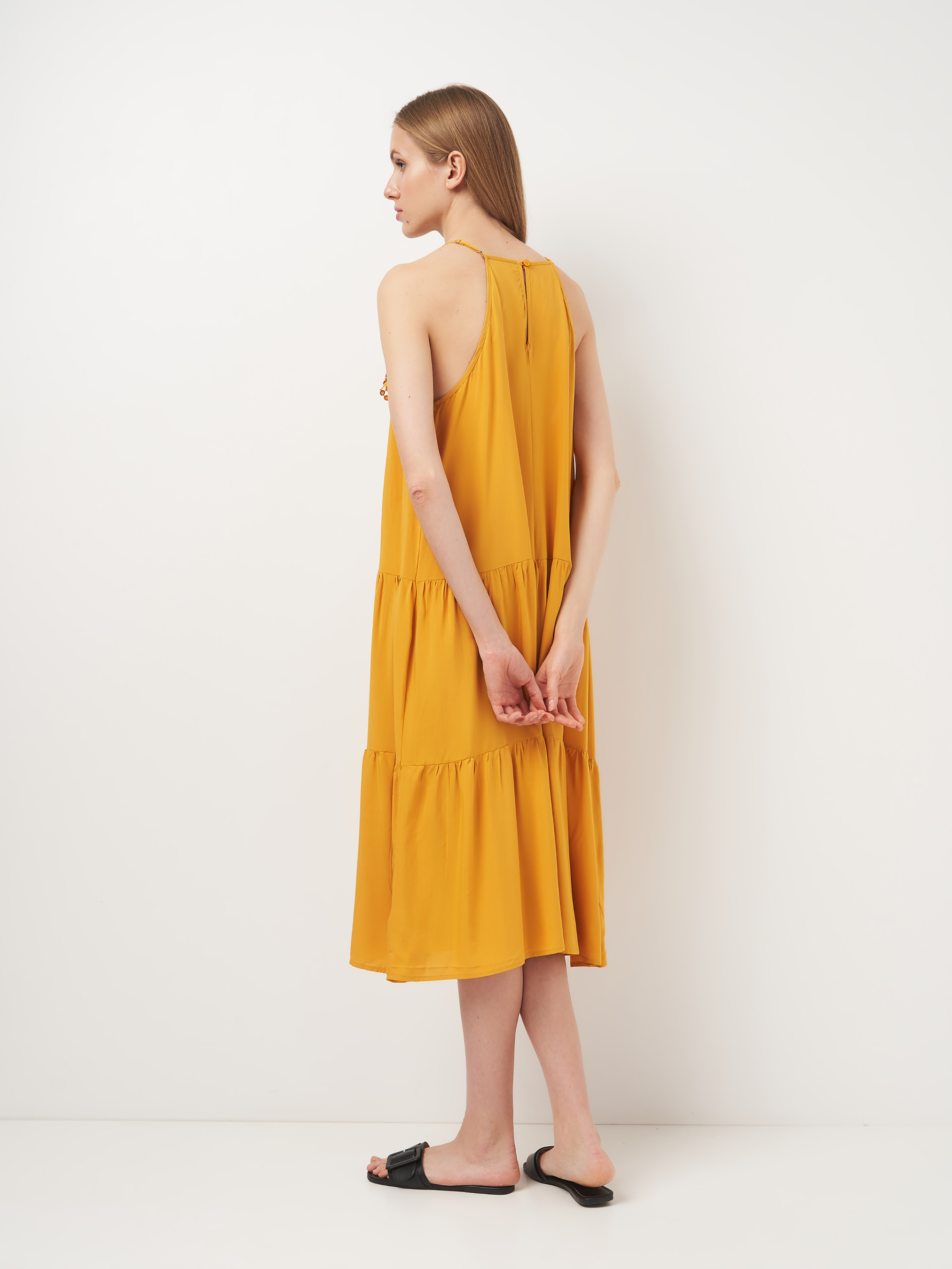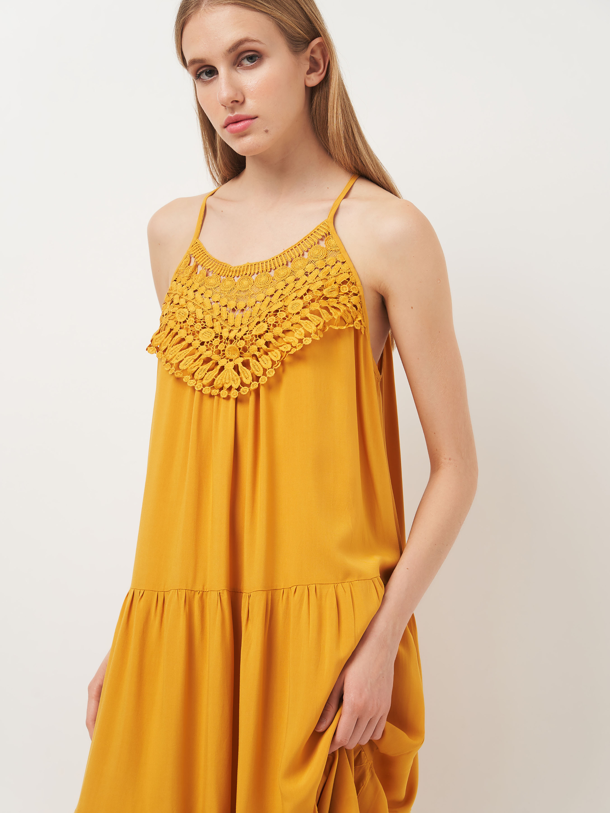 Жіноче розкльошене, коротке плаття. На тонких брилетах, що регулюються, без підкладки, з v-подібним вирізом, з вишивкою на грудях,Застібка на гудзик на шиї. ***Розмір - M Напівобхват пояса - 53,00 см Довжина виробу - 116,00 см Об'єм грудей - 94,00 см Напівобхват стегон - 60,00 см Склад: 52% віскоза, 48% поліестер