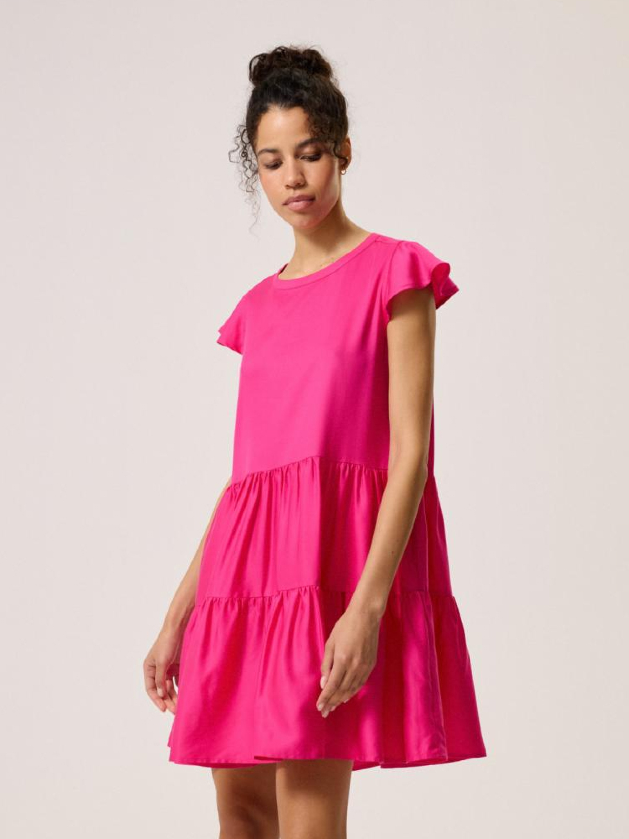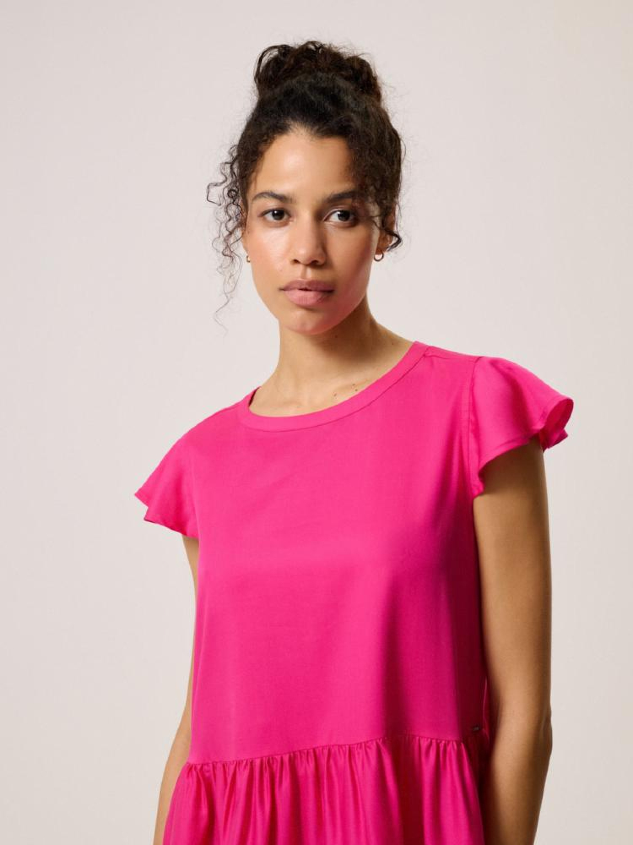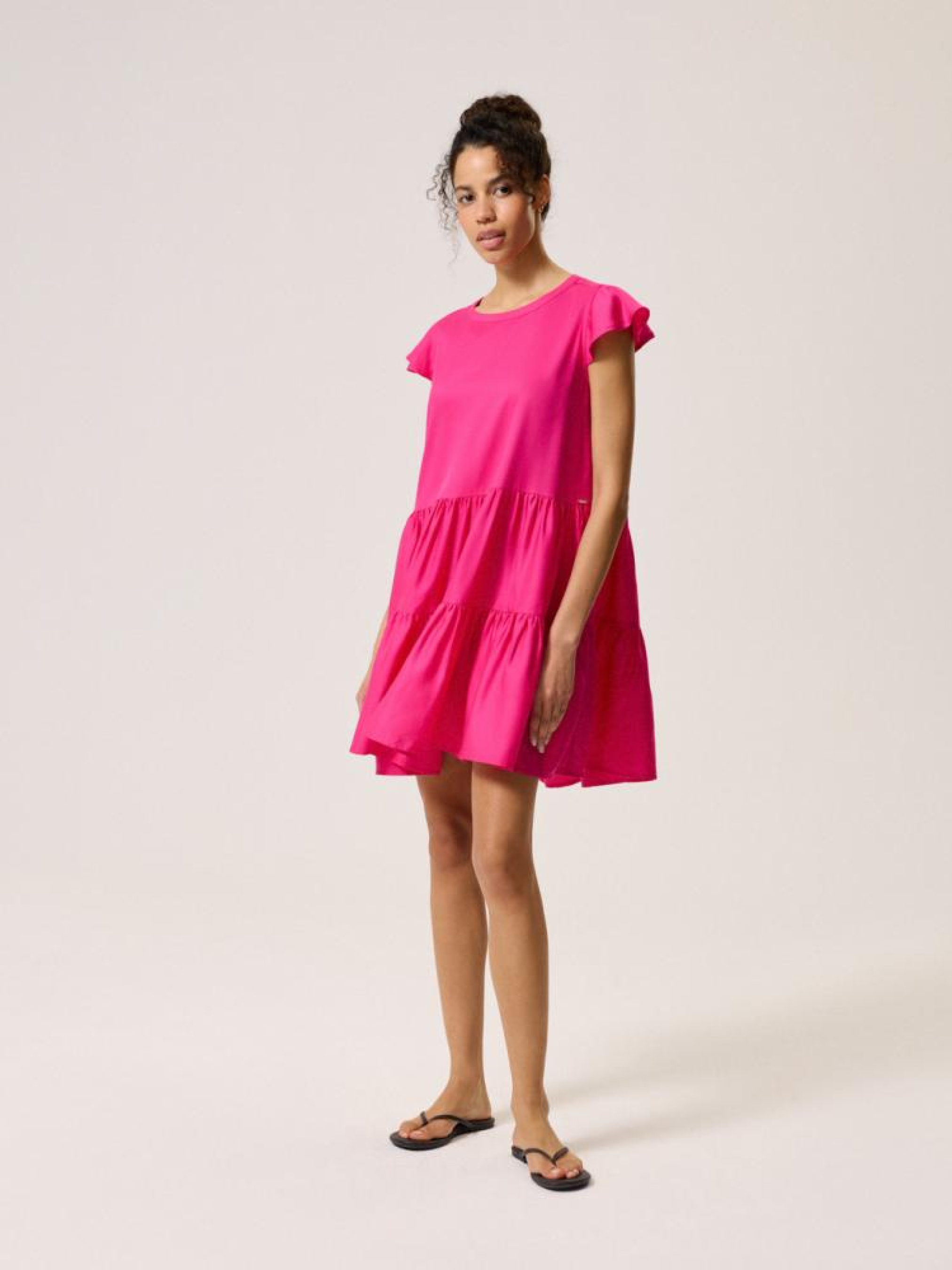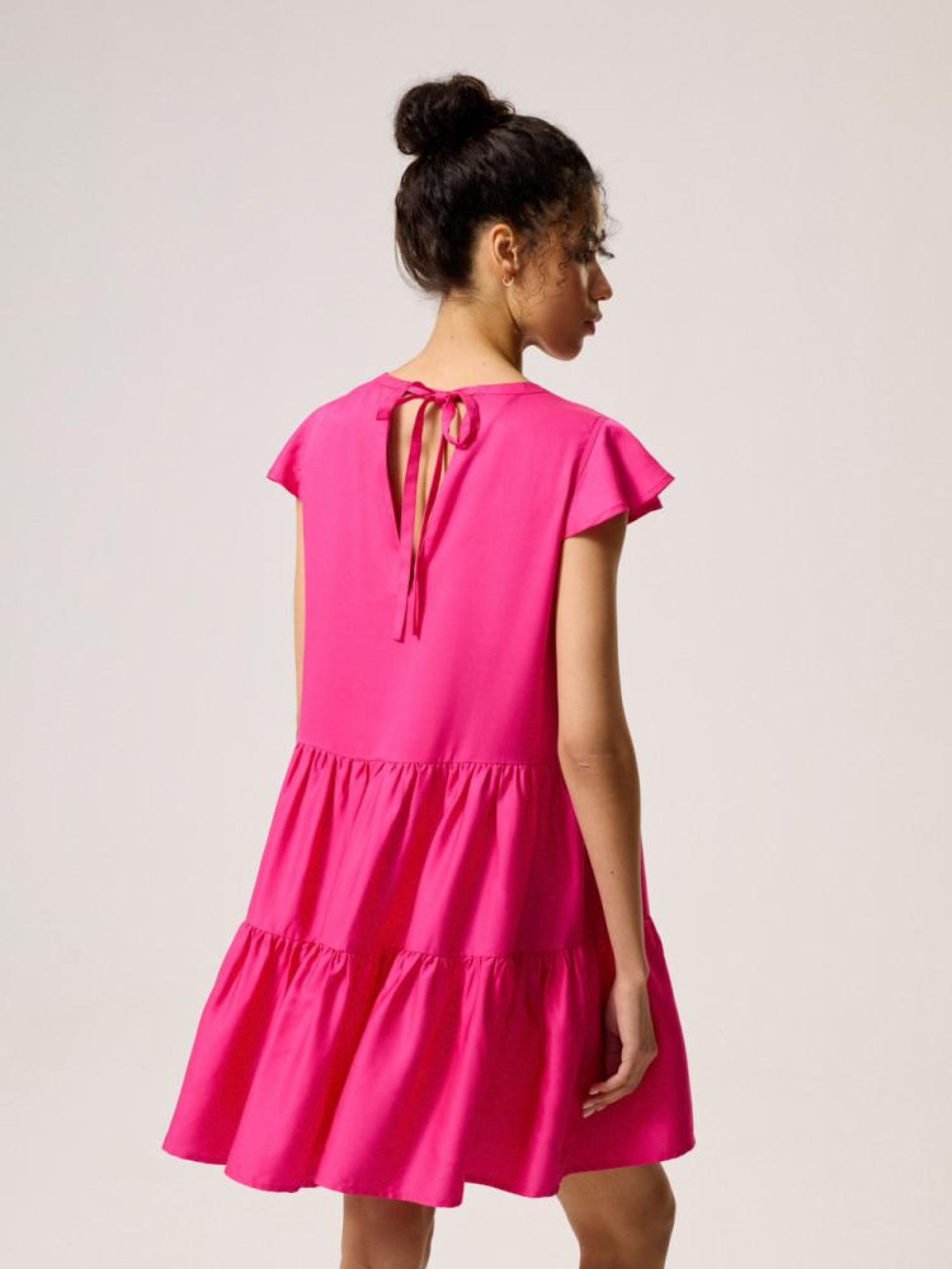Сукня FEM 10044045 Сукня з воланами з ліоцеллю: - вільний крій, - просторі волани, завдяки яким сукня красиво драпірується при русі, - зав'язка на спині, - рукав метелик, - круглий виріз горловини, - з ліоцеллю - дихаючої, повітряної та міцної тканини, що нагадує бавовну і віскоза, - в наявності кольору фуксії. Сезон: Весна/Літо 2024 Склад: 100% ліоцелл Догляд: - прання при максимум 30 °С - не відбілювати - сушіть за низької температури - прасувати максимум при темп. 150°С - не проводити хімчистку Розмір на моделі - S Зріст моделі - 180 см
