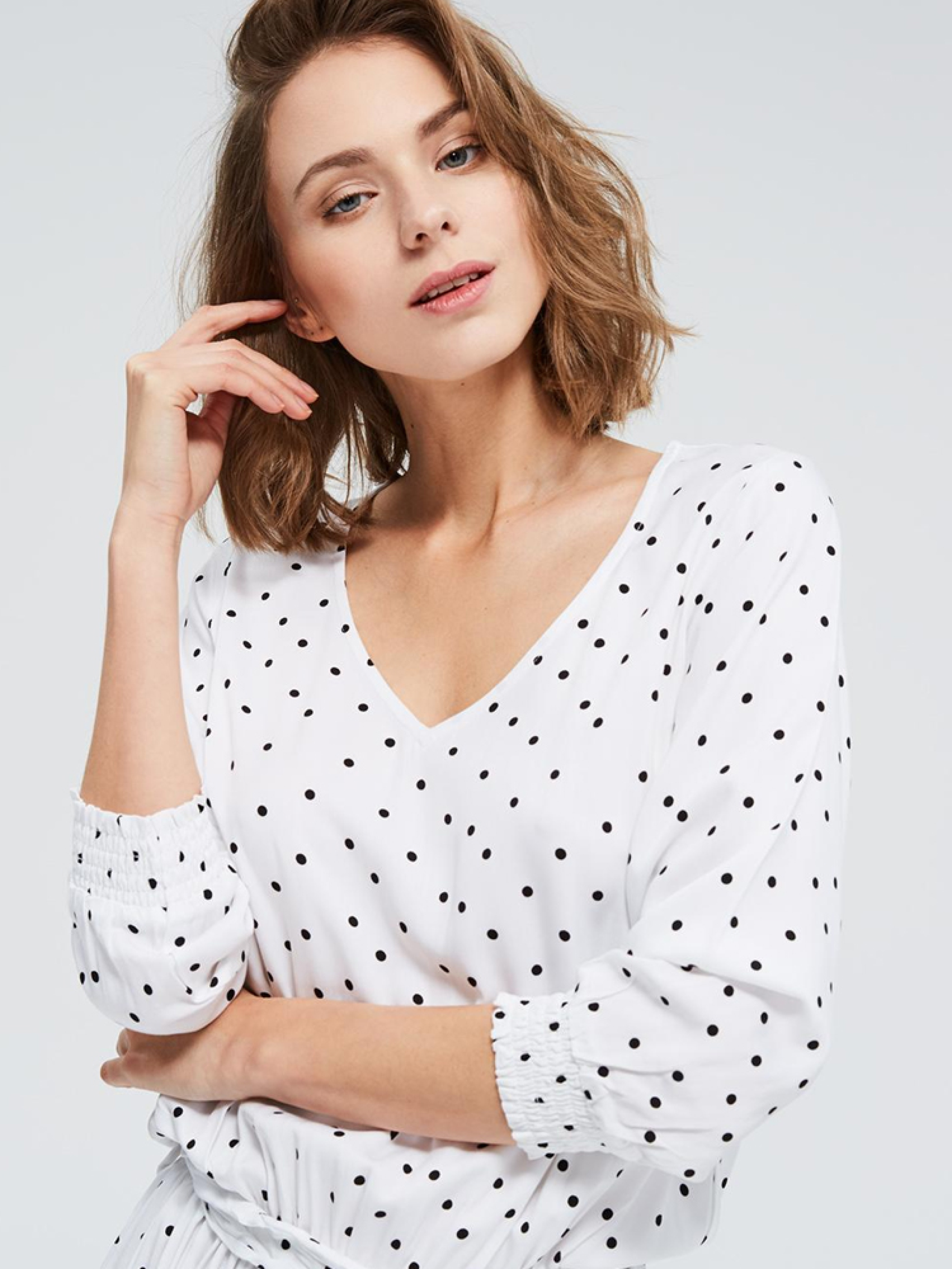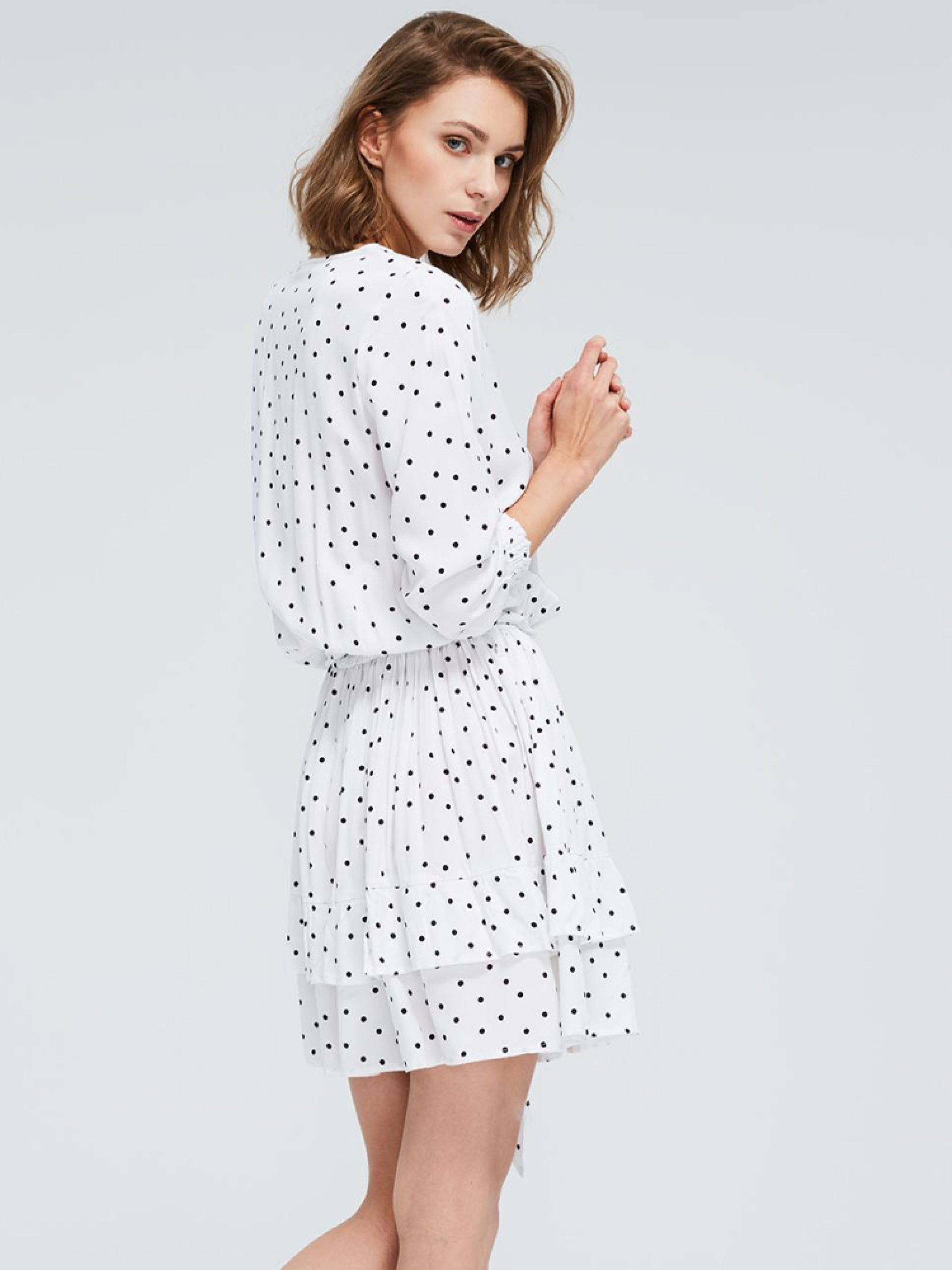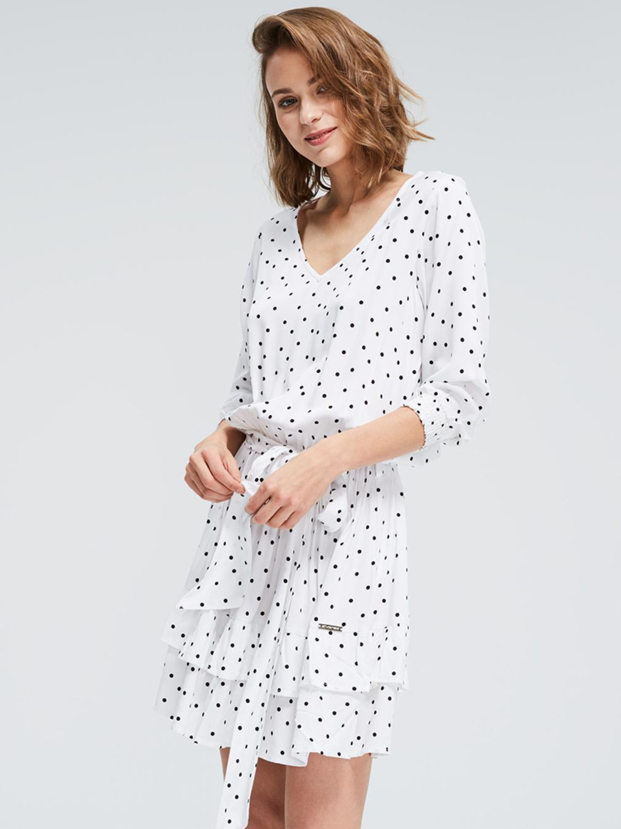 Вільна літня сукня в горошок з v-подібним вирізом горловини. На талії та манжетах рукавів еластична стрічка. Додатково зав'язка на талії. Сукня драпірована понизу. Сезон: Весна-літо Склад: 100% віскоза