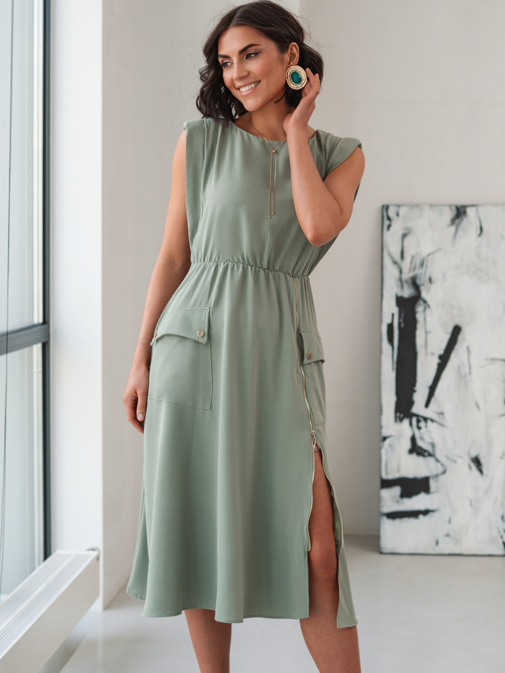 Елегантна сукня з високоякісного турецького матеріалу. Модель з акцентом на талії. Лінія плеча доповнена тонкими плечиками. Талія на гумці для комфортної посадки по фігурі. Розкльошена спідниця з накладними кишенями та клапанами додає функціональності. Доповнена блискавкою спереду збоку, що дає змогу регулювати висоту розрізу.