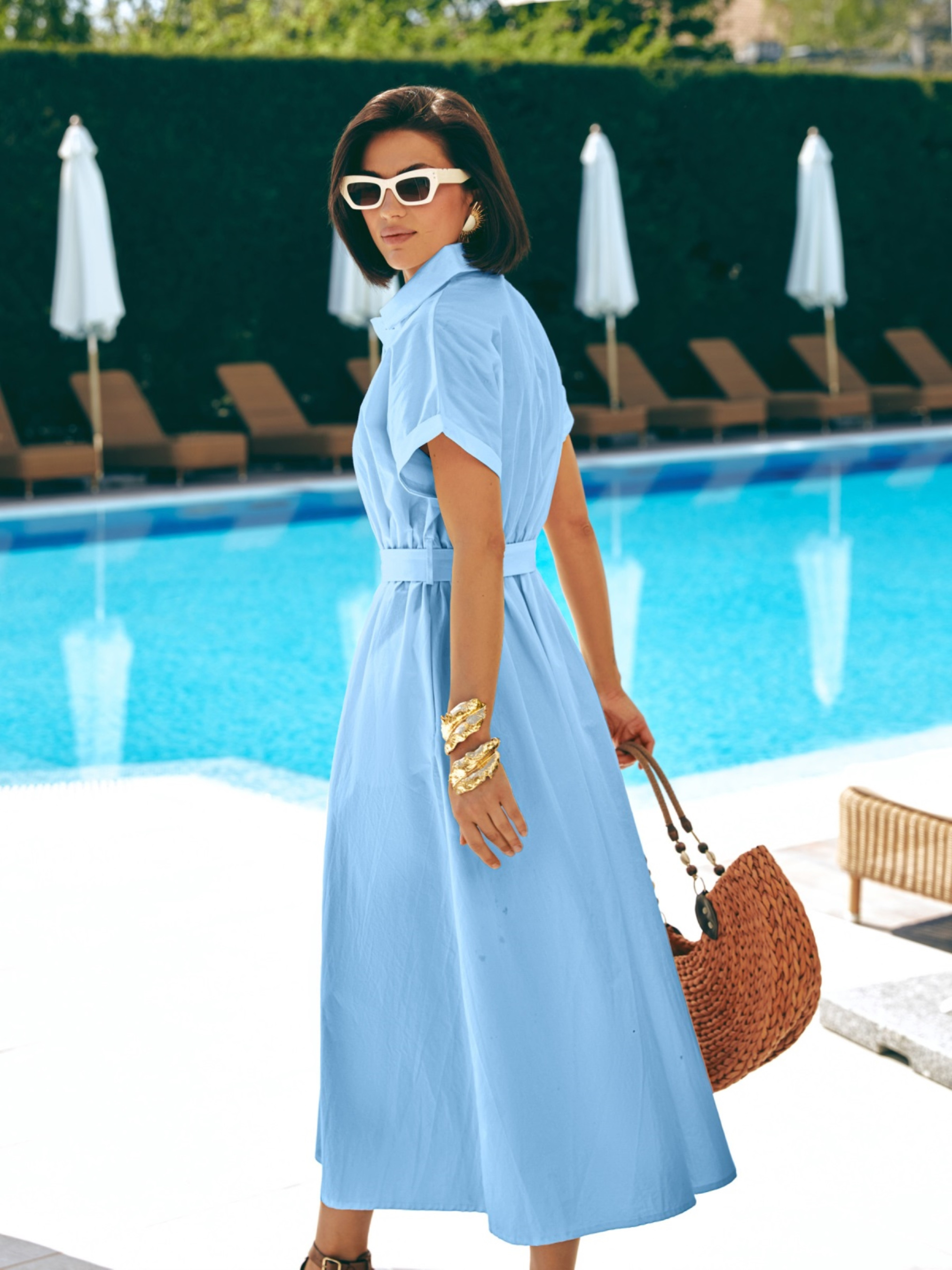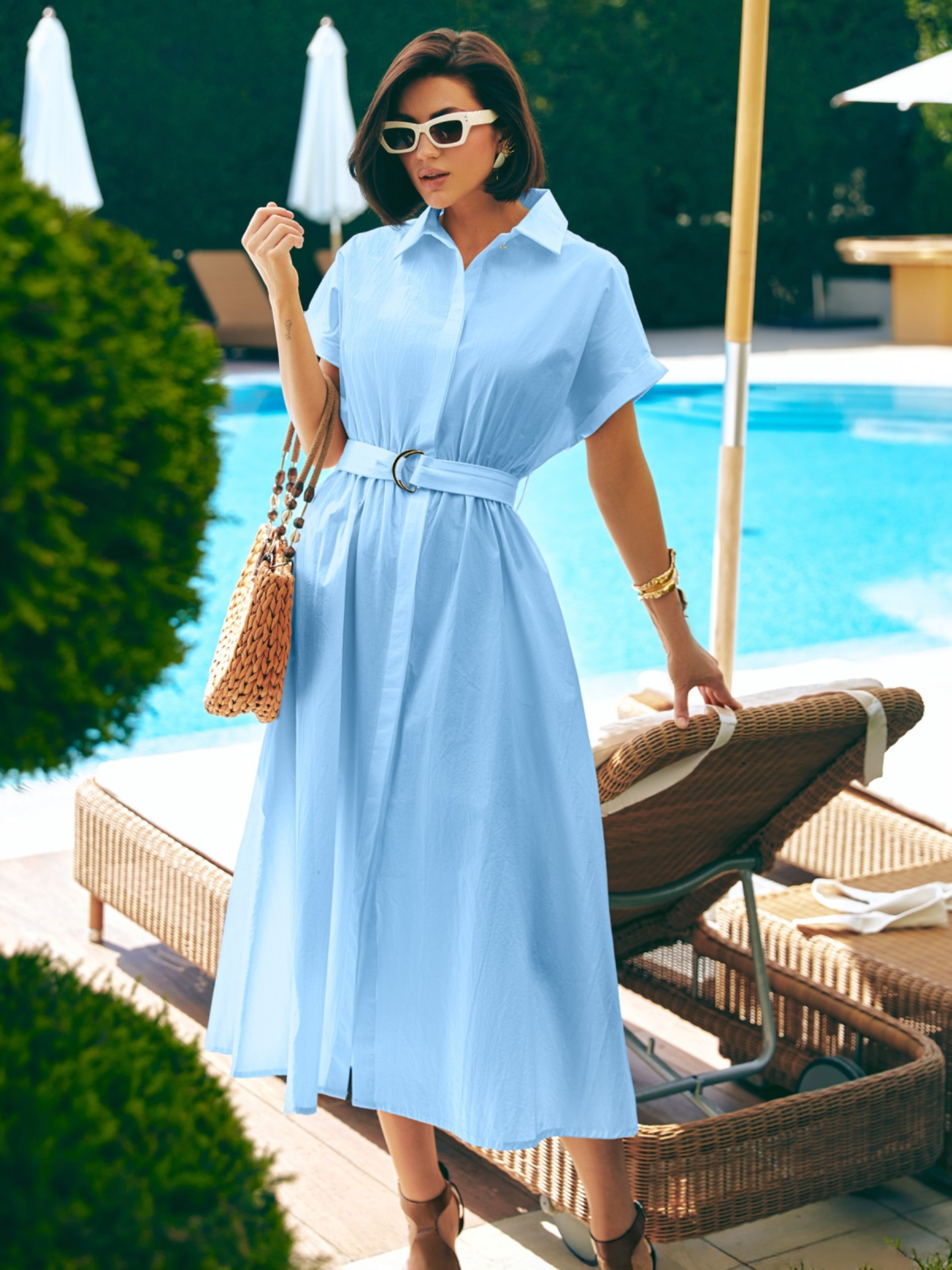 Сукня із високоякісної турецької бавовни. Модель з відкладним коміром і спущеним цільнокроєним рукавом. Талія зібрана на гумку, яка підлаштовується під фігуру без додаткової фіксації. У бокових швах — прорізні кишені. Застібка на ґудзики прихована під супатною планкою, що створює чисту вертикальну лінію.