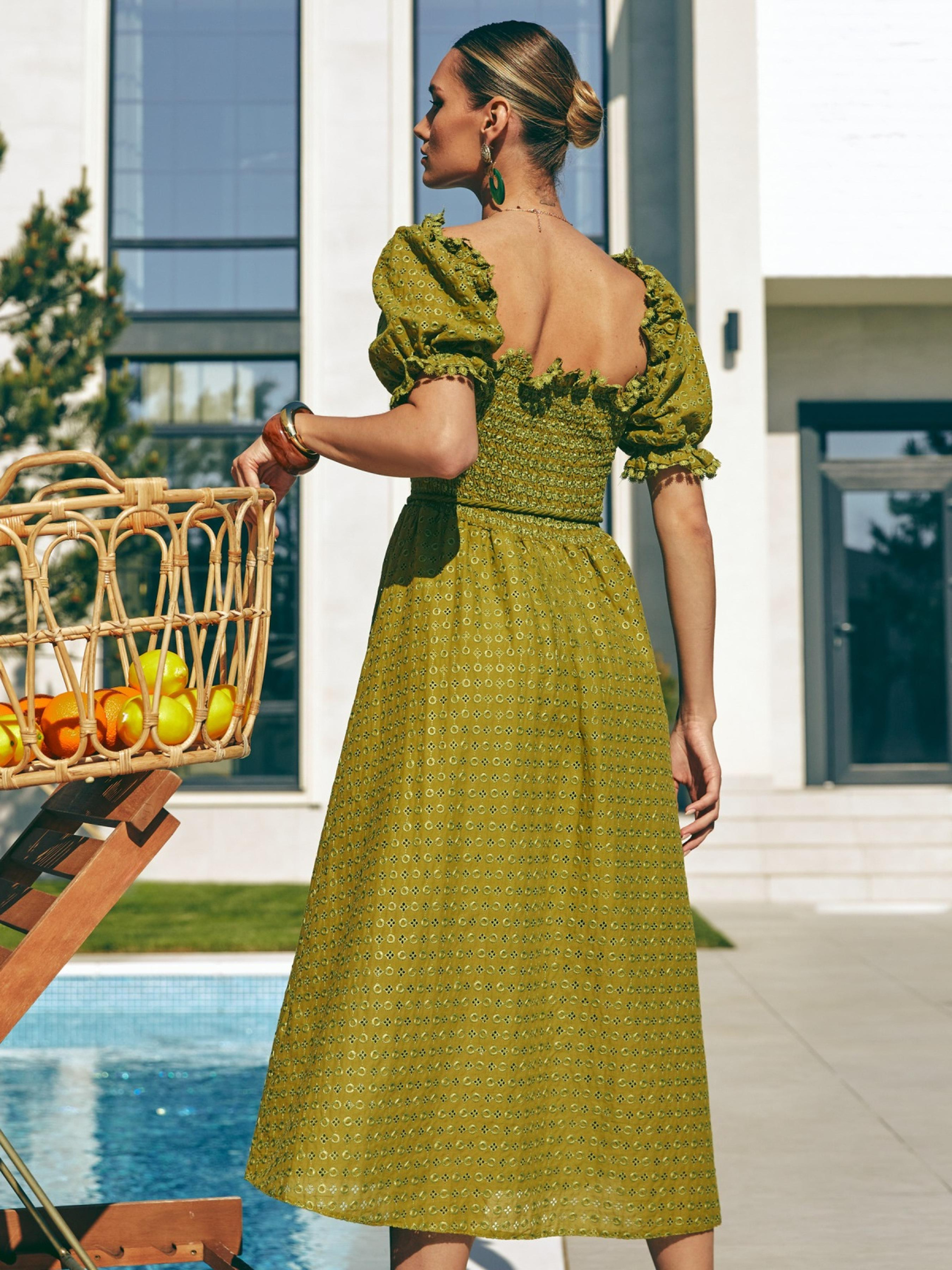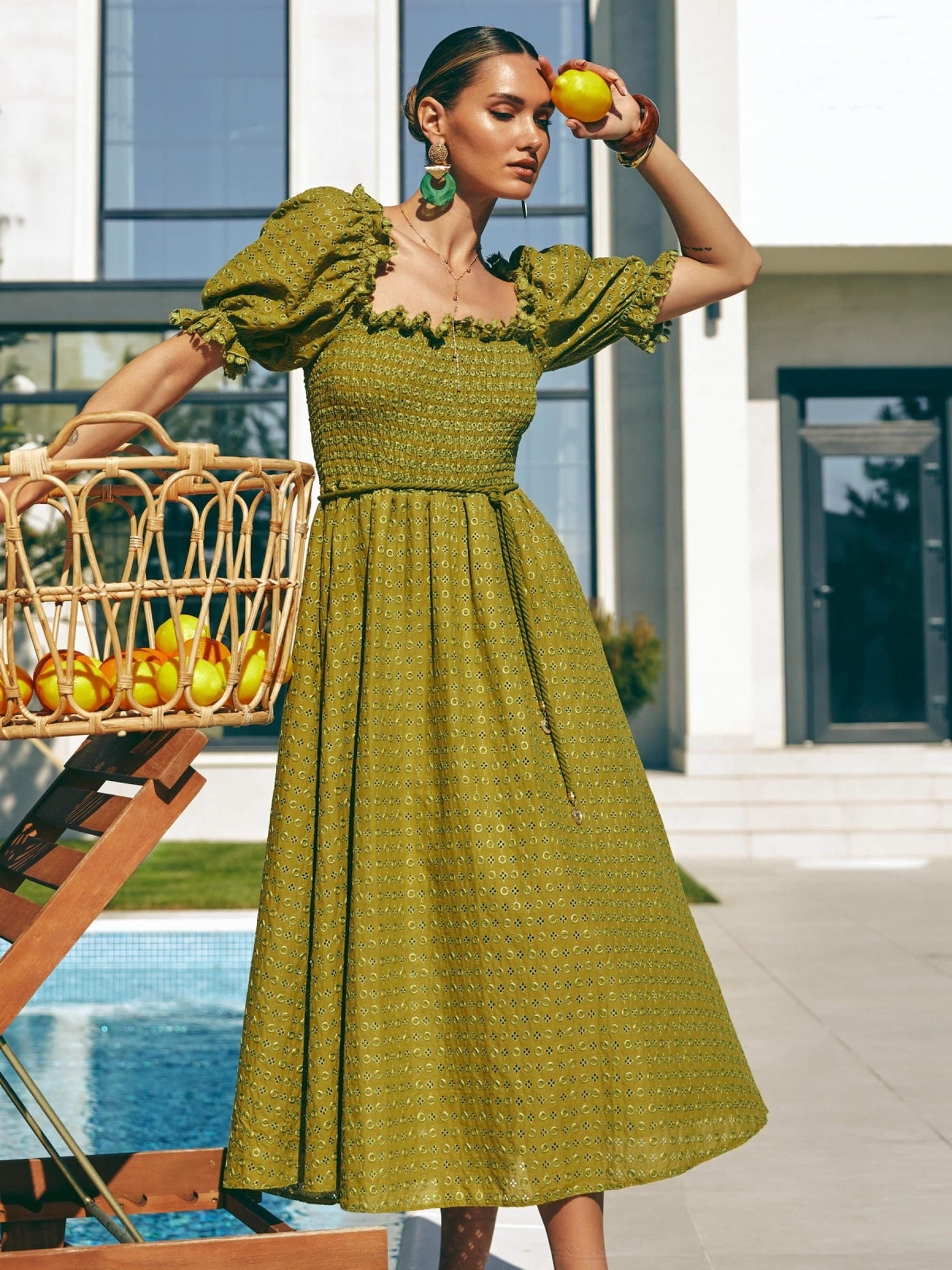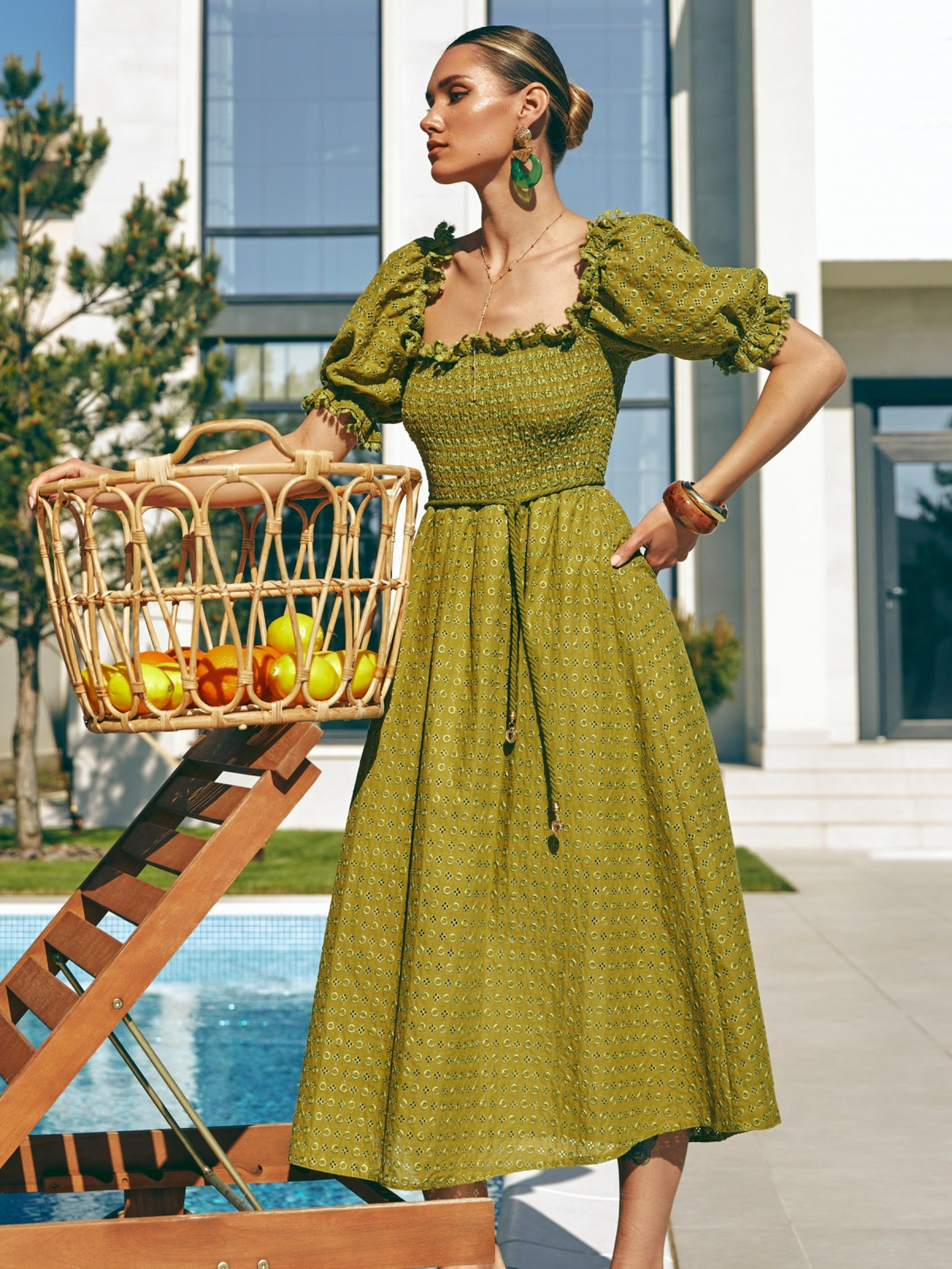 Сукня з високоякісного турецького матеріалу. Верх оформлений вафельною гумкою для комфортної посадки по фігурі. Відкриті плечі та короткі рукави додають образу романтики. Відрізна талія візуально формує силует, а розкльошена спідниця з підкладкою струмує під час ходьби. Знімний пояс-шнурок із тієї ж тканини створює акцент, що доповнює образ.