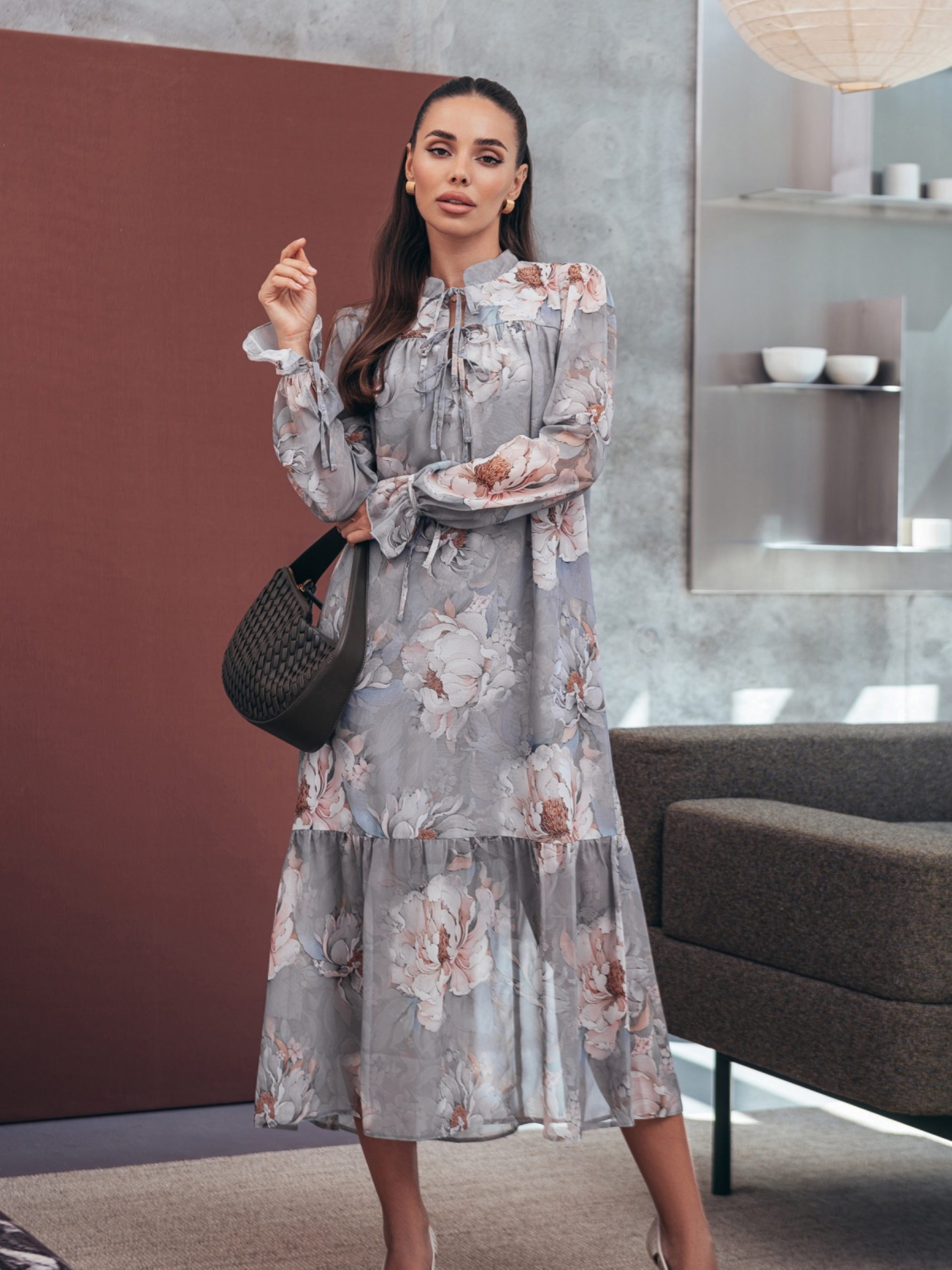 Сукня міді з шифону з квітковим принтом. Підкладка зі штапелю забезпечує комфорт і непрозорість. Вільний крій адаптується під різні типи фігур, забезпечуючи свободу рухів. Довгі рукави з манжетами на зав’язках додають акцент, а горловина з невеликим розрізом і зав’язками підкреслює вертикальну лінію силуету. Ярусна спідниця створює збалансований об’єм у нижній частині.