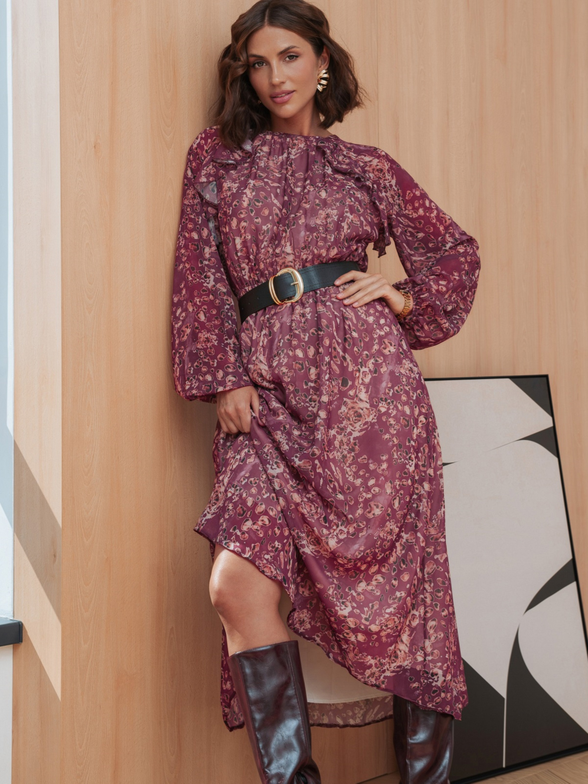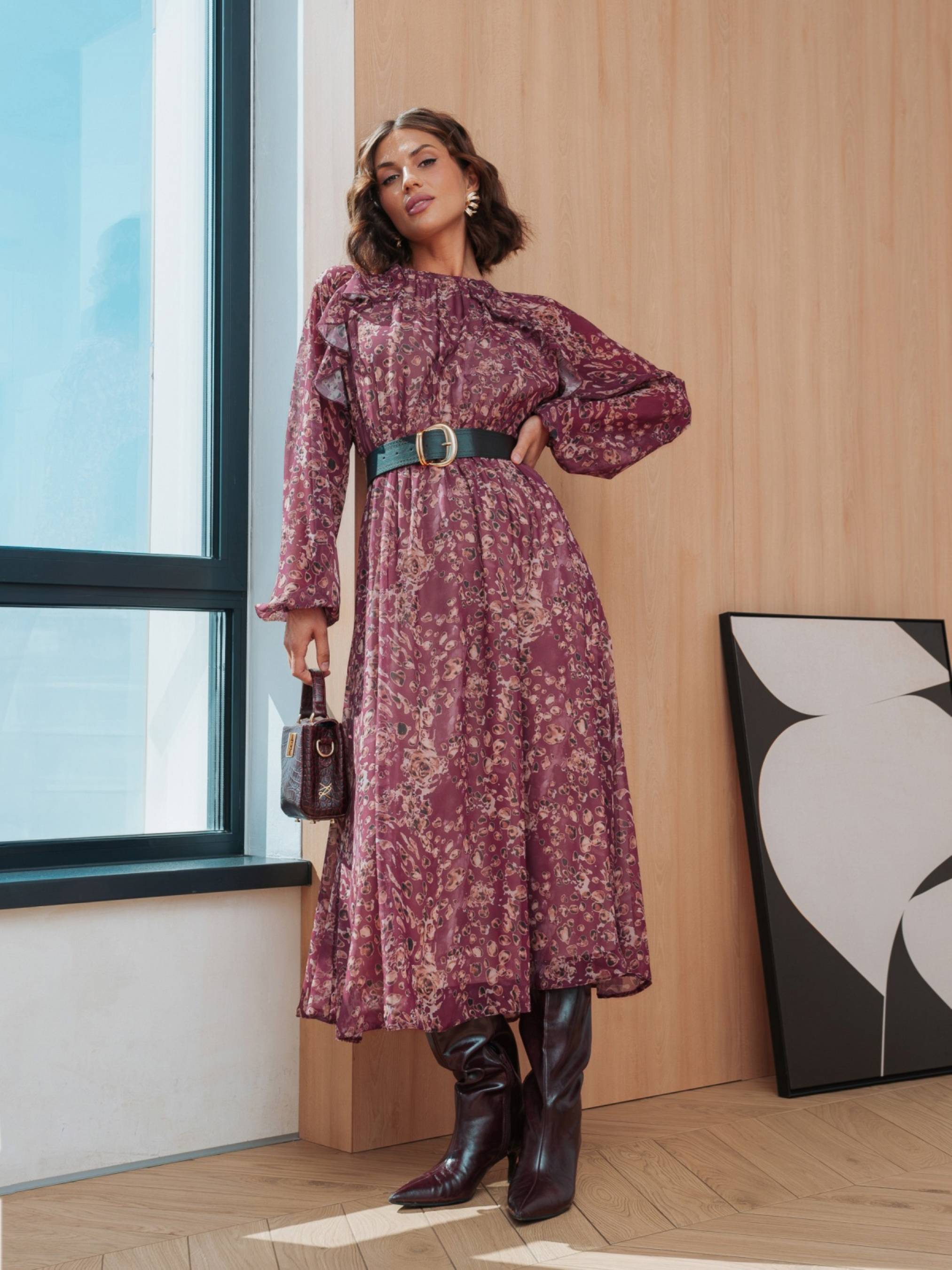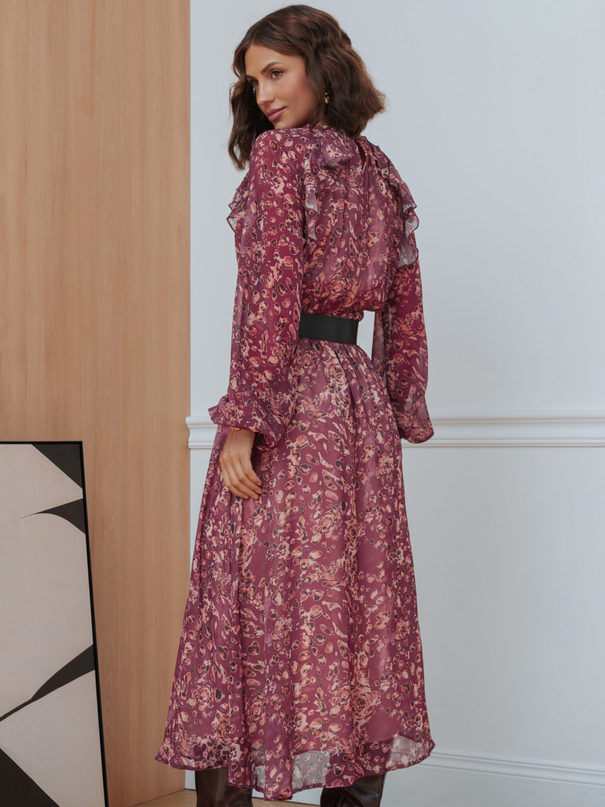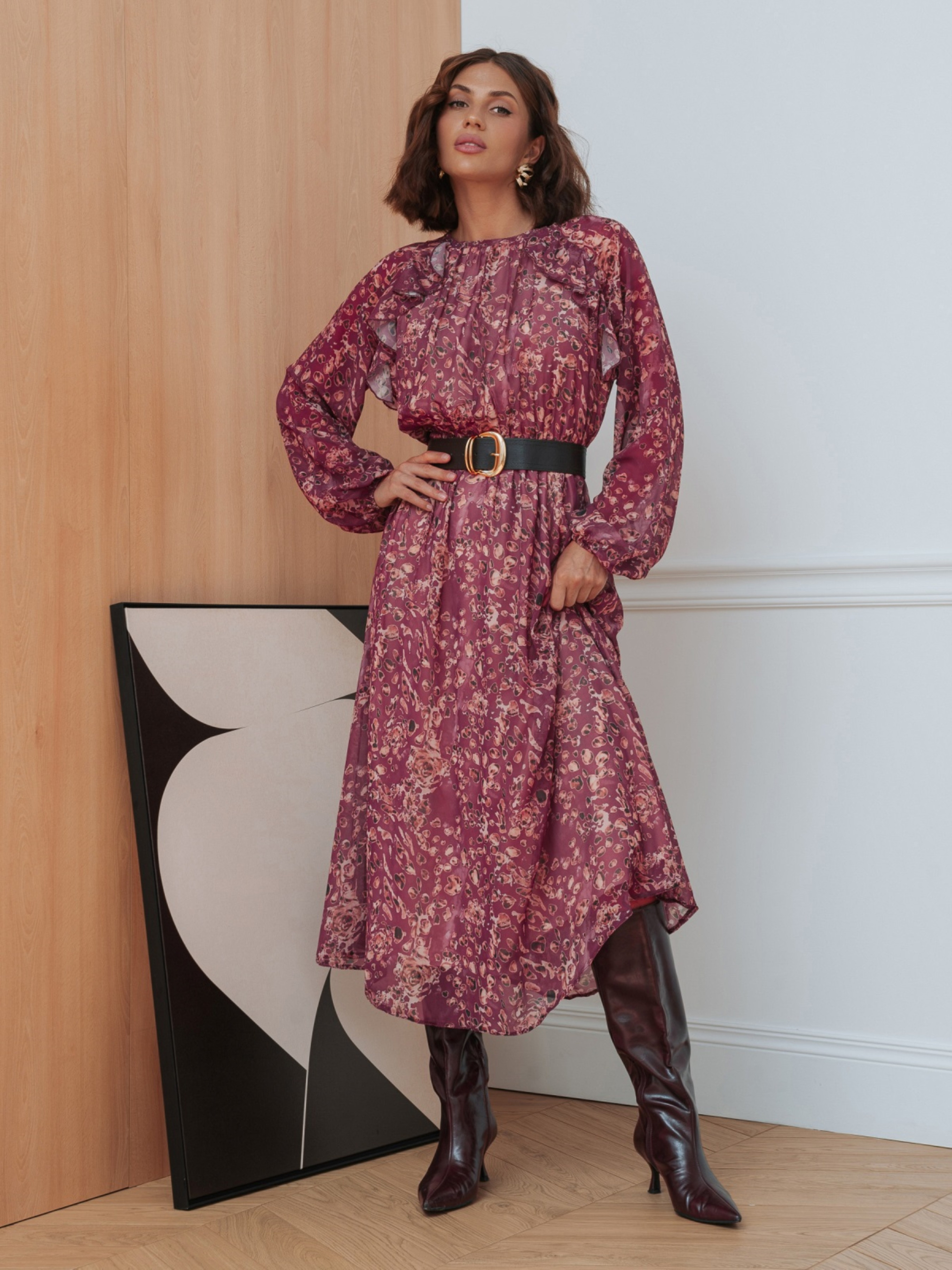 Сукня з легкого високоякісного турецького шифону. Всередині передбачена підкладка, яка закінчується трохи вище низу виробу, що надає образу легкість і багатошаровість. Талія і манжети рукавів зібрані на гумку. Принт і м'які оборки створюють витончений акцент. Ззаду на шиї сукня застібається на ґудзик. Комплектується поясом.