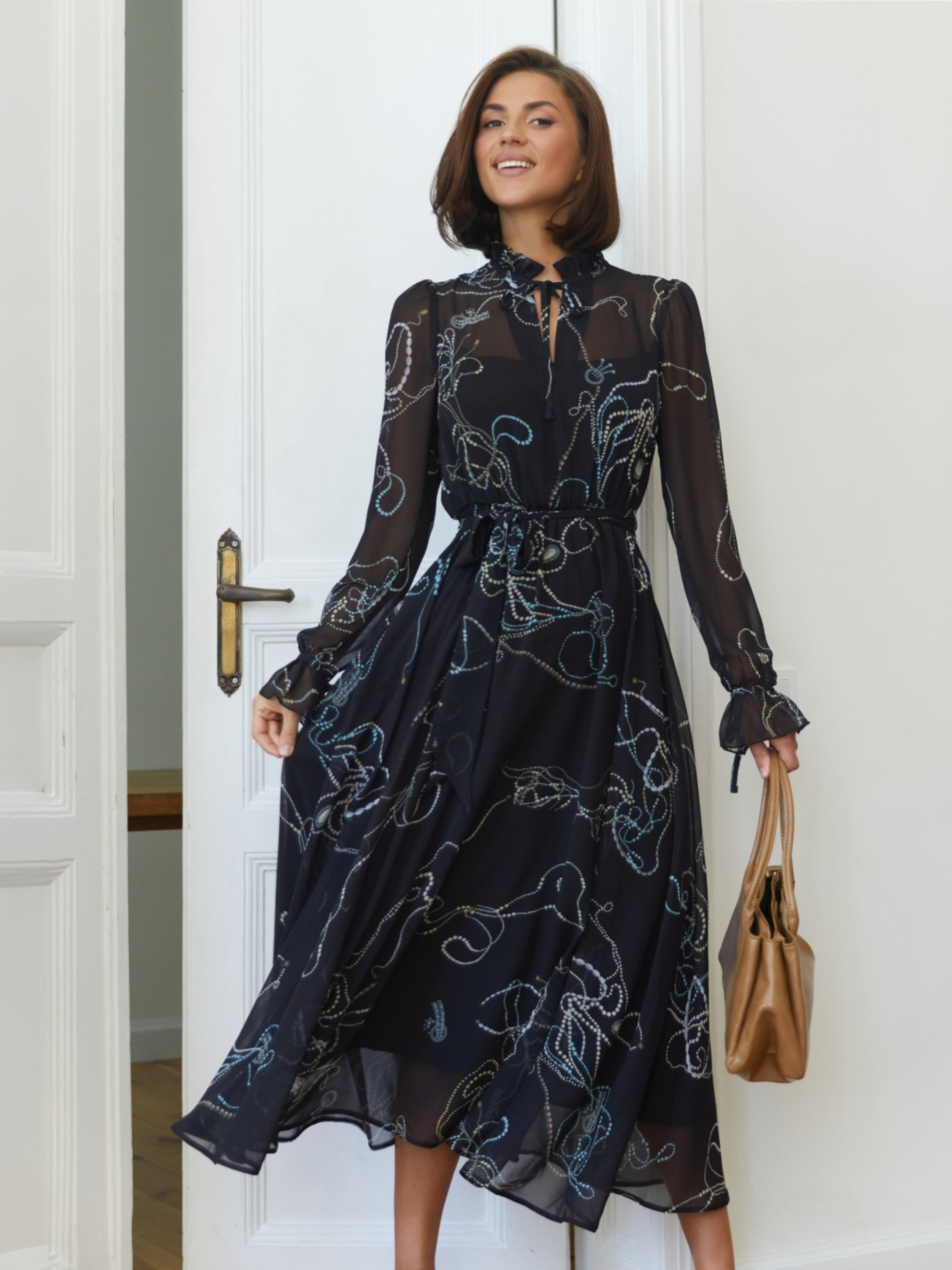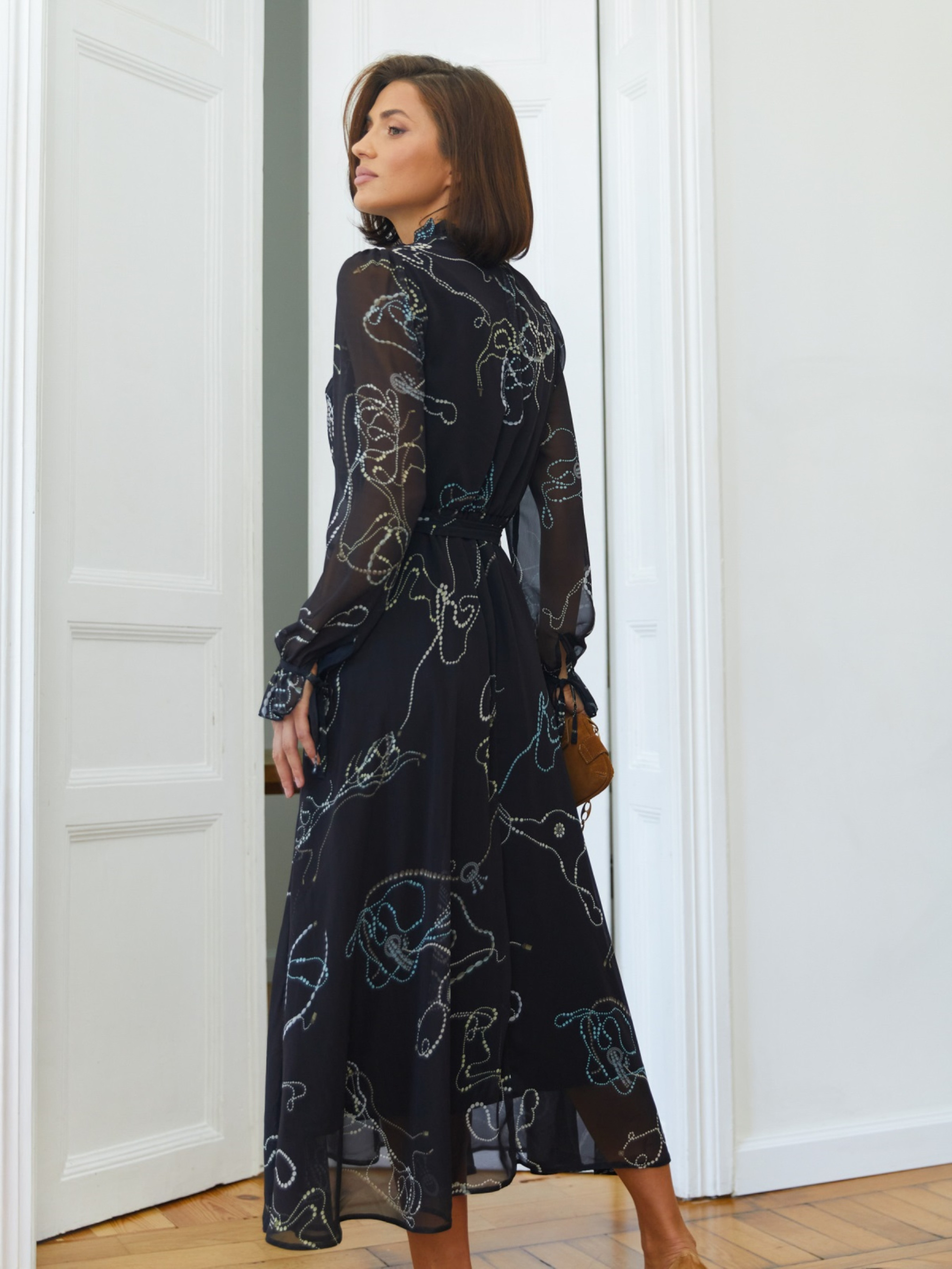 Сукня з повітряного шифону з принтом. Легка тканина красиво драпірується, створюючи силует, що струмує. Підкладка із батиста забезпечує комфорт. Модель виконана з коміром-стійкою із зав'язками та довгими рукавами з манжетами на стрічці. По талії доповнено гумкою, завдяки чому підлаштовується під фігуру. Пояс із основного матеріалу в комплекті.