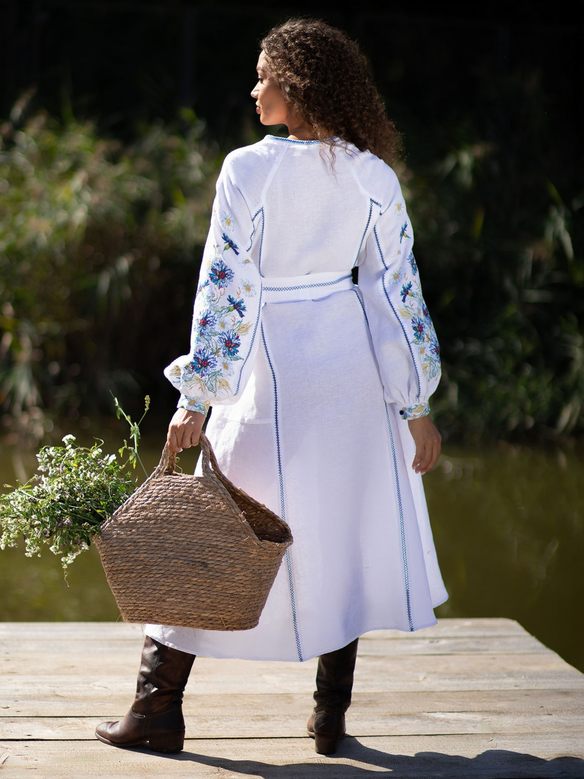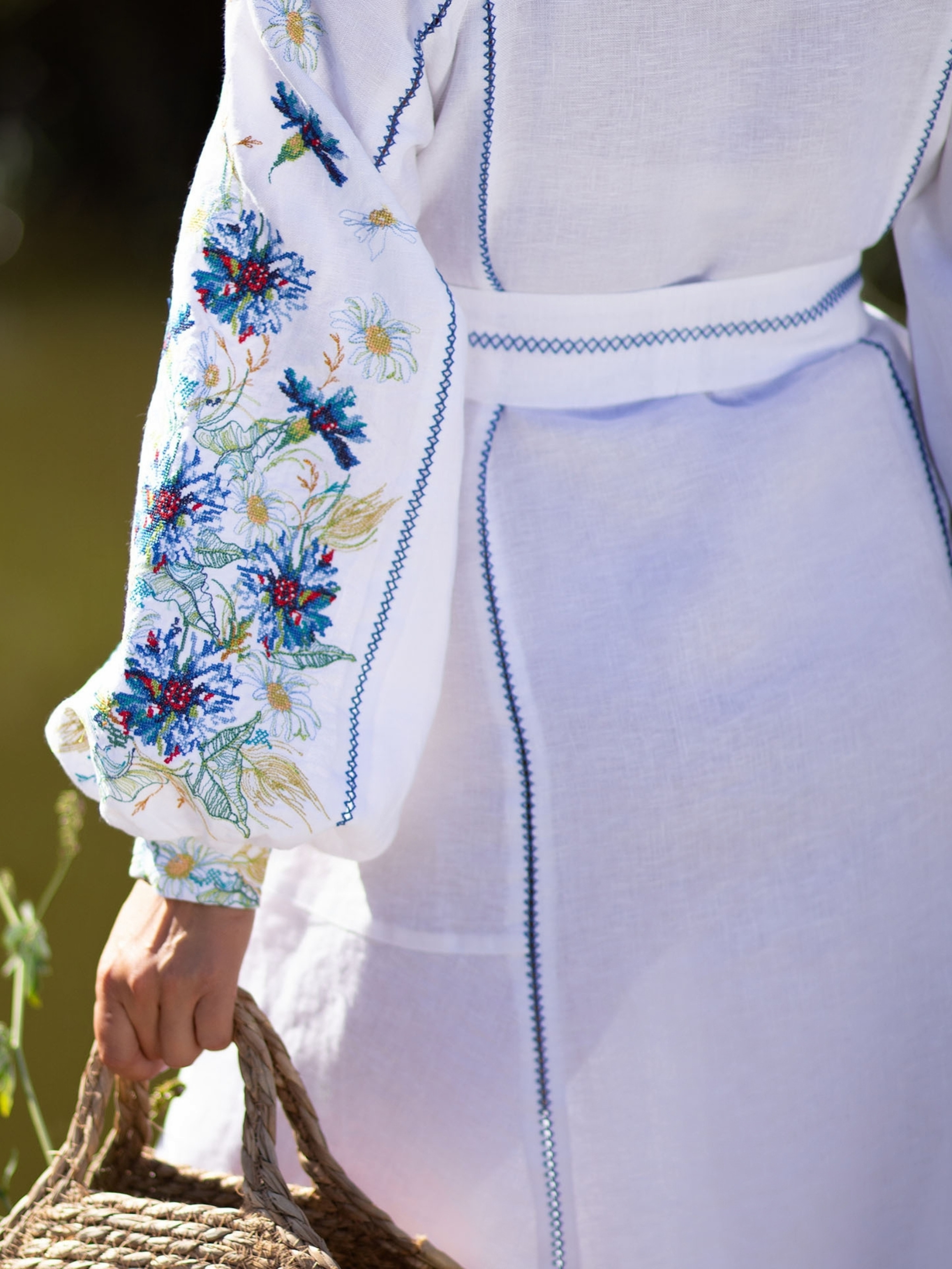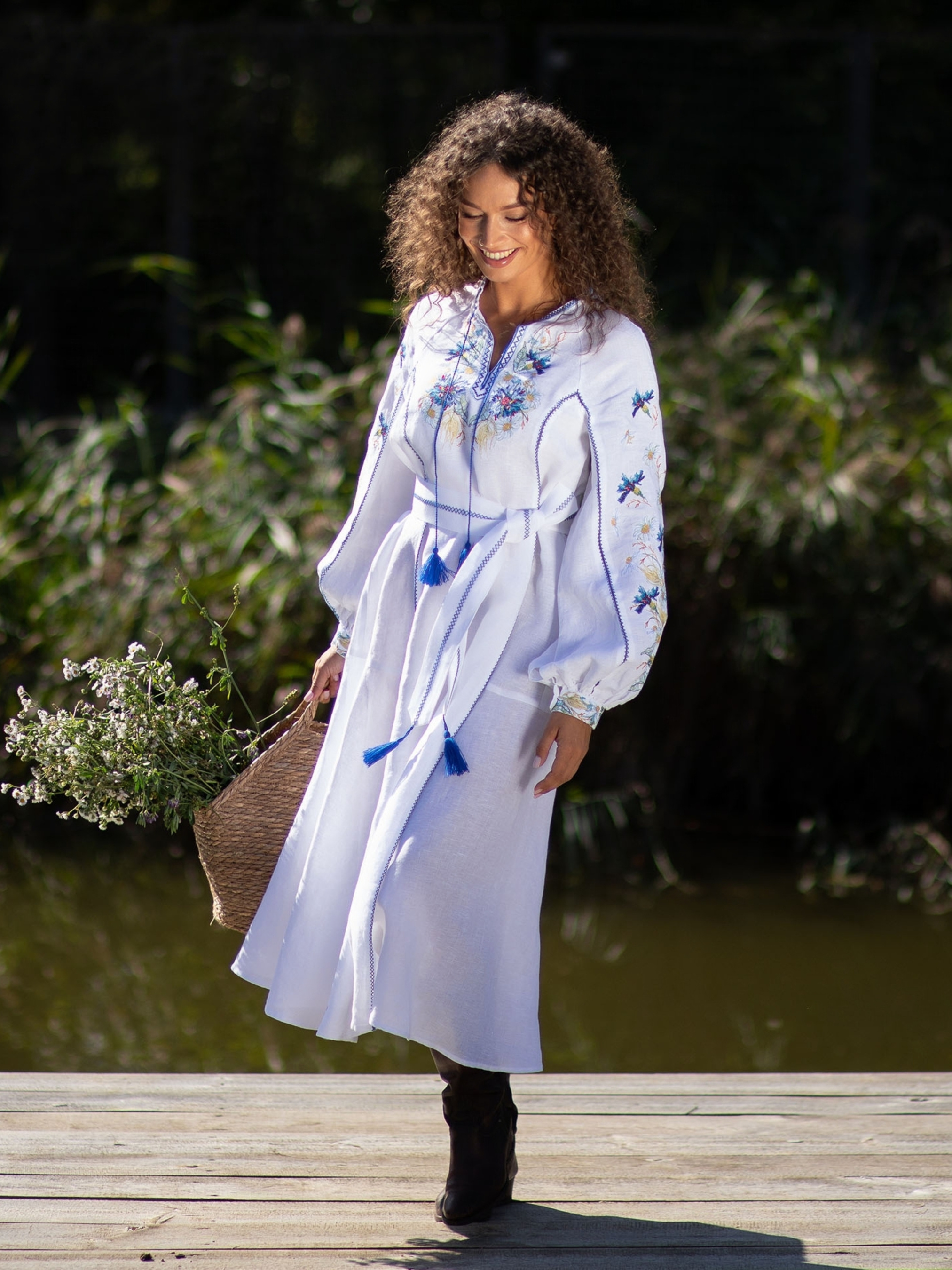 Ця вишивана сукня створена з натурального 100% льону, що забезпечує комфорт, довговічність та чудову повітропроникність. Лляна тканина приємна до тіла, зберігає охолоджувальний ефект у спеку та дарує відчуття природної легкості. Фасон сукні — вільний, з довгими пишними рукавами та паском із китицями, який підкреслює талію та дозволяє регулювати посадку. Акуратний розріз на горловині та оздоблення синім мереживним швом додають виробу вишуканості та особливого шарму. Вишивка виконана у яскравих синьо-жовтих та зелених відтінках, прикрашає передню частину сукні та рукави, створюючи гармонійний і виразний образ. Орнамент у стилі традиційних українських квіткових мотивів підкреслює автентичність моделі. Така сукня чудово пасує як для святкових подій та особливих зустрічей, так і для стильних літніх прогулянок, поєднуючи традицію та сучасну елегантність.