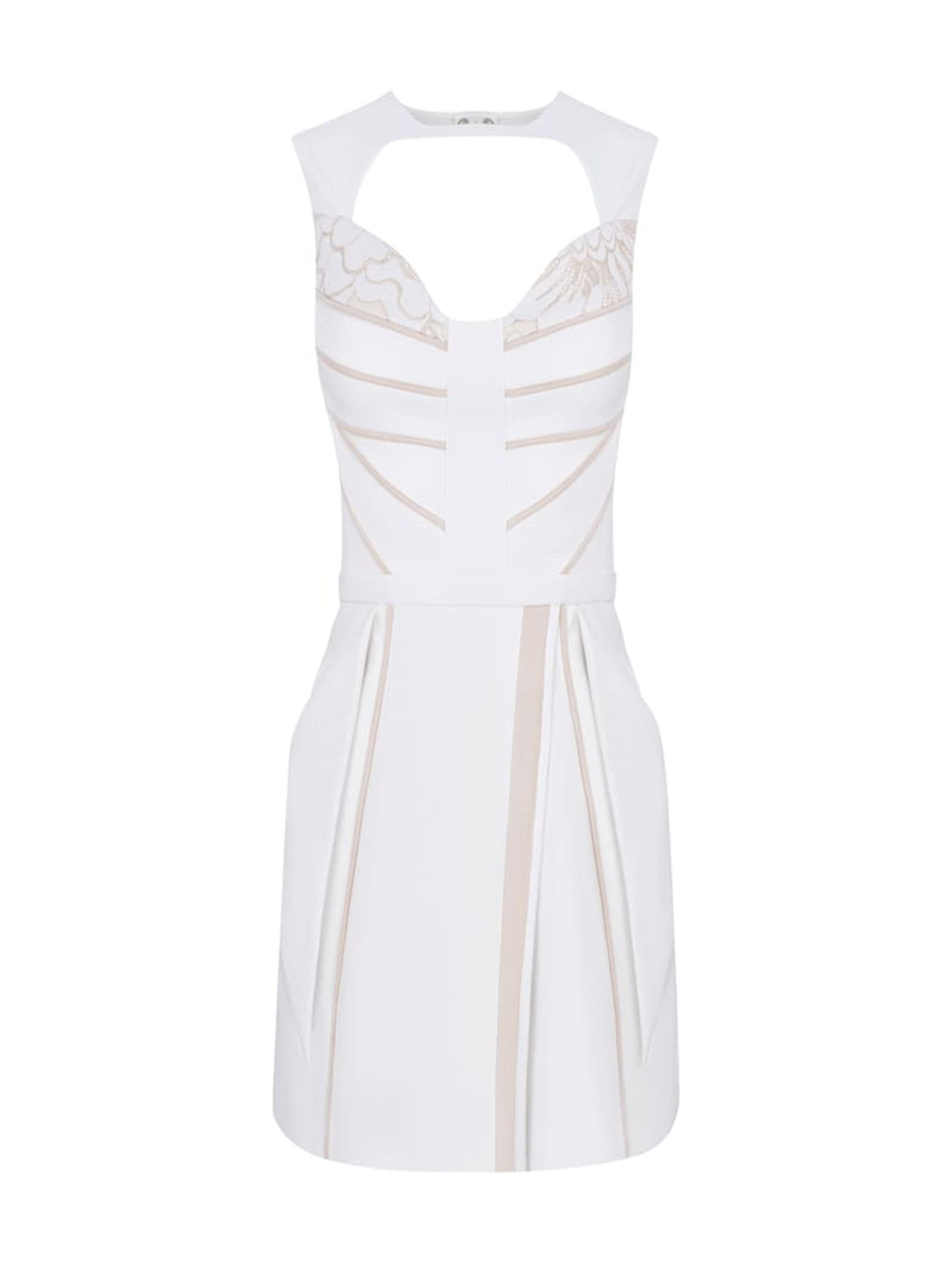 Сукня Protea з високоякісної екошкіри алькантара білого кольору, надзвичайно приємна на дотик, на підкладці з віскози з еластаном. Сукня оброблена трикотажним замшевим кантом і окремими італійськими мереживними деталями. Має кишені з великими декоративними клапанами як креативну обробку, а також окремий пояс з кишенями, застібка на гудзики.
