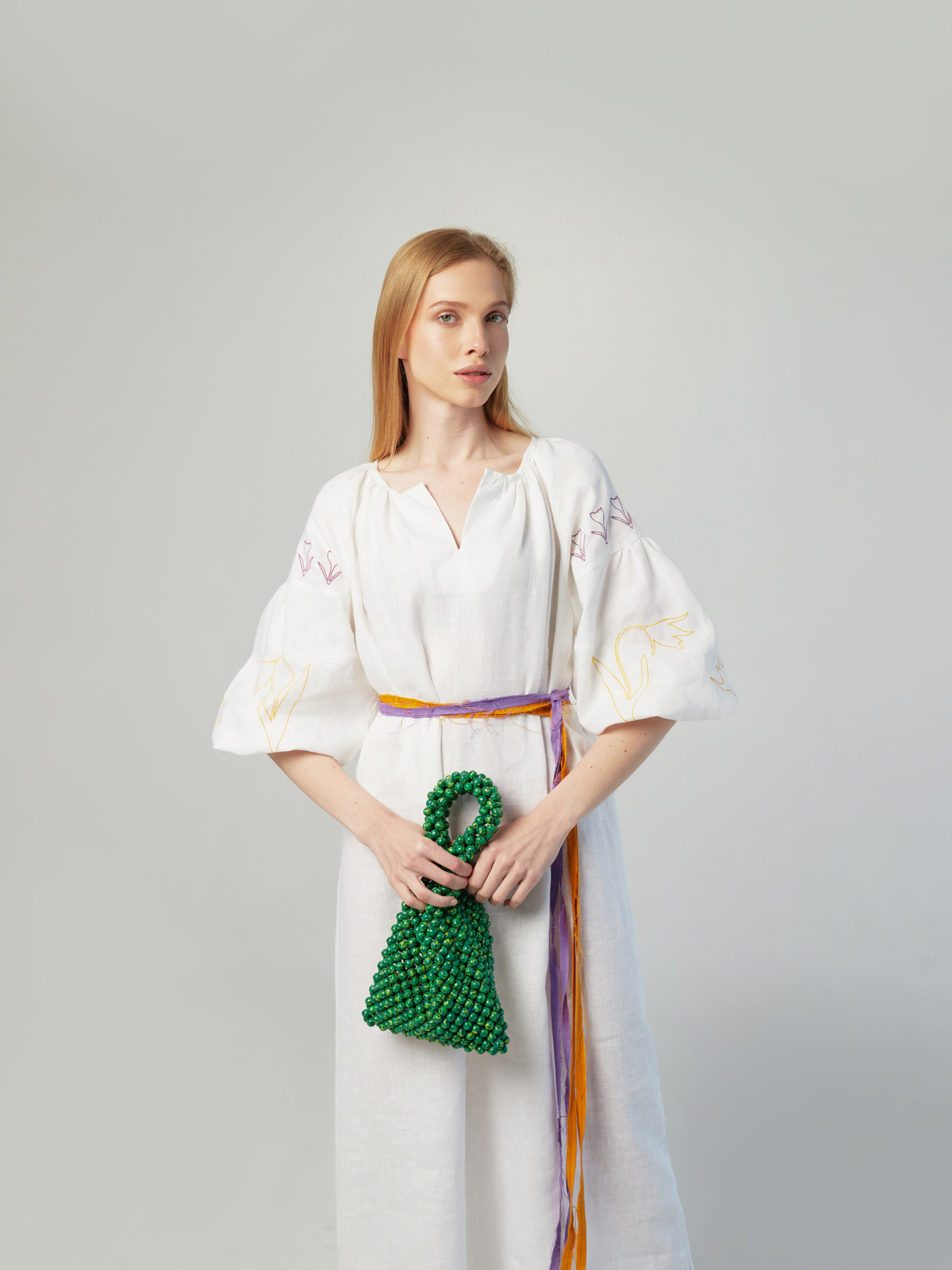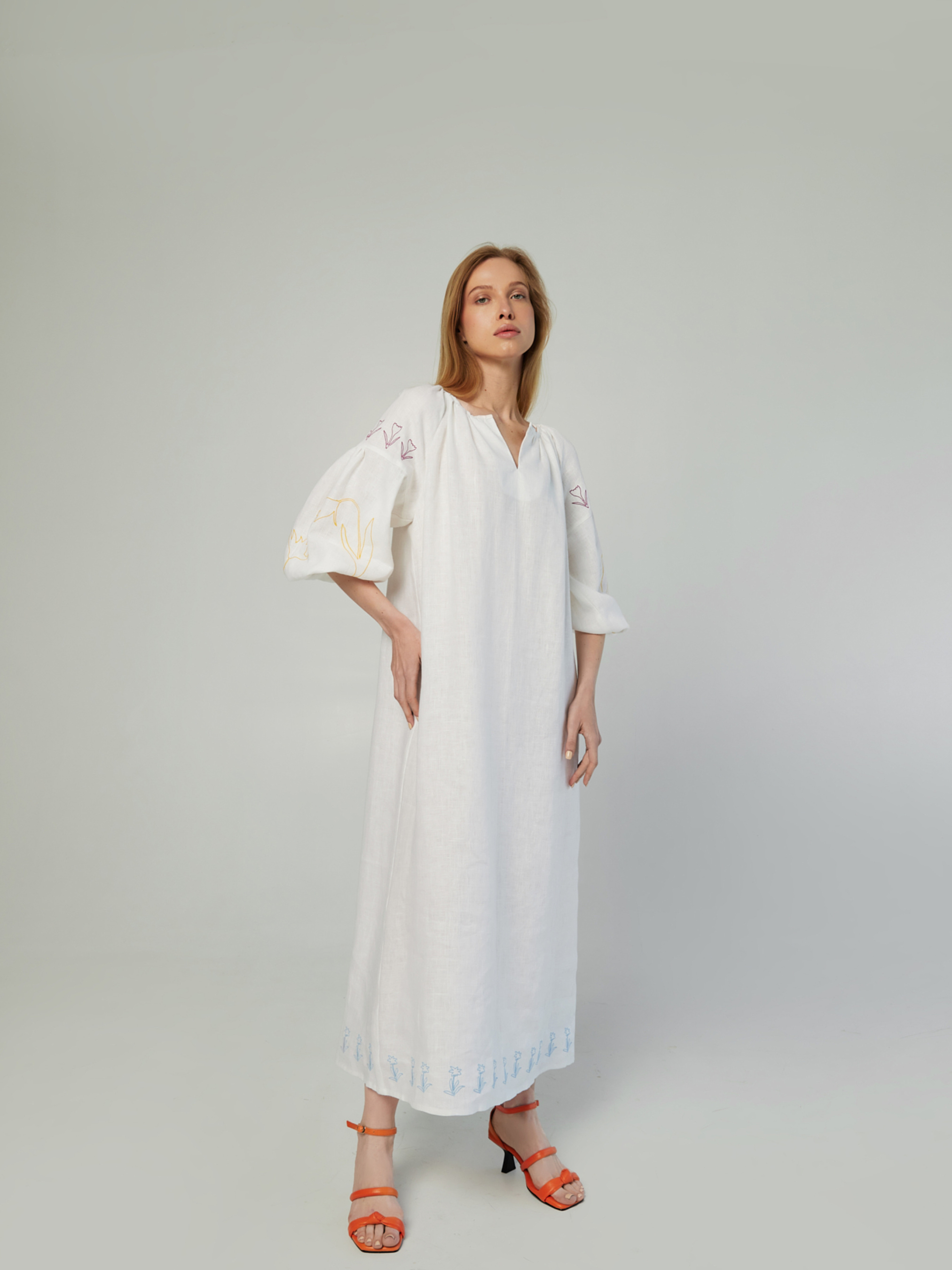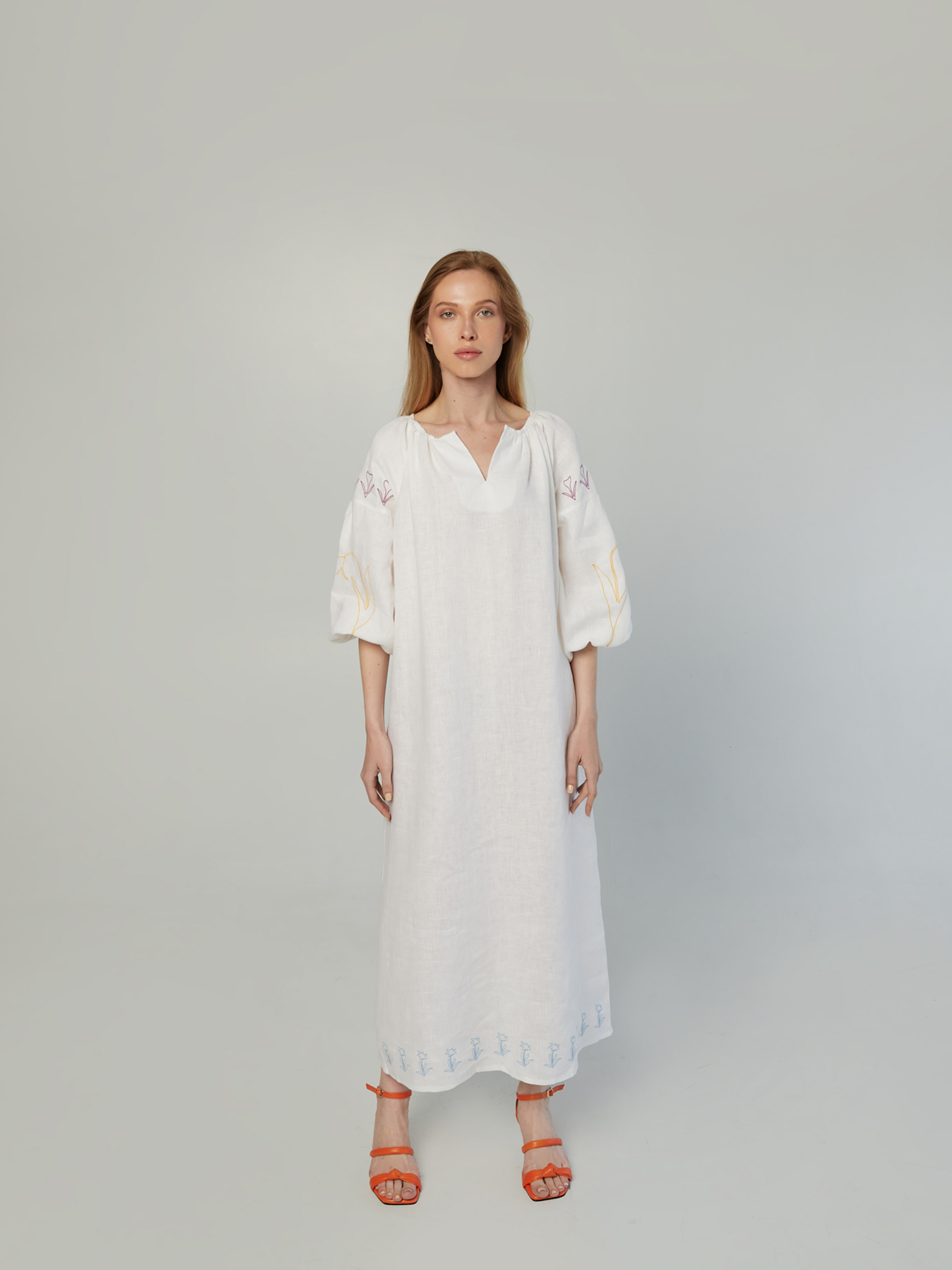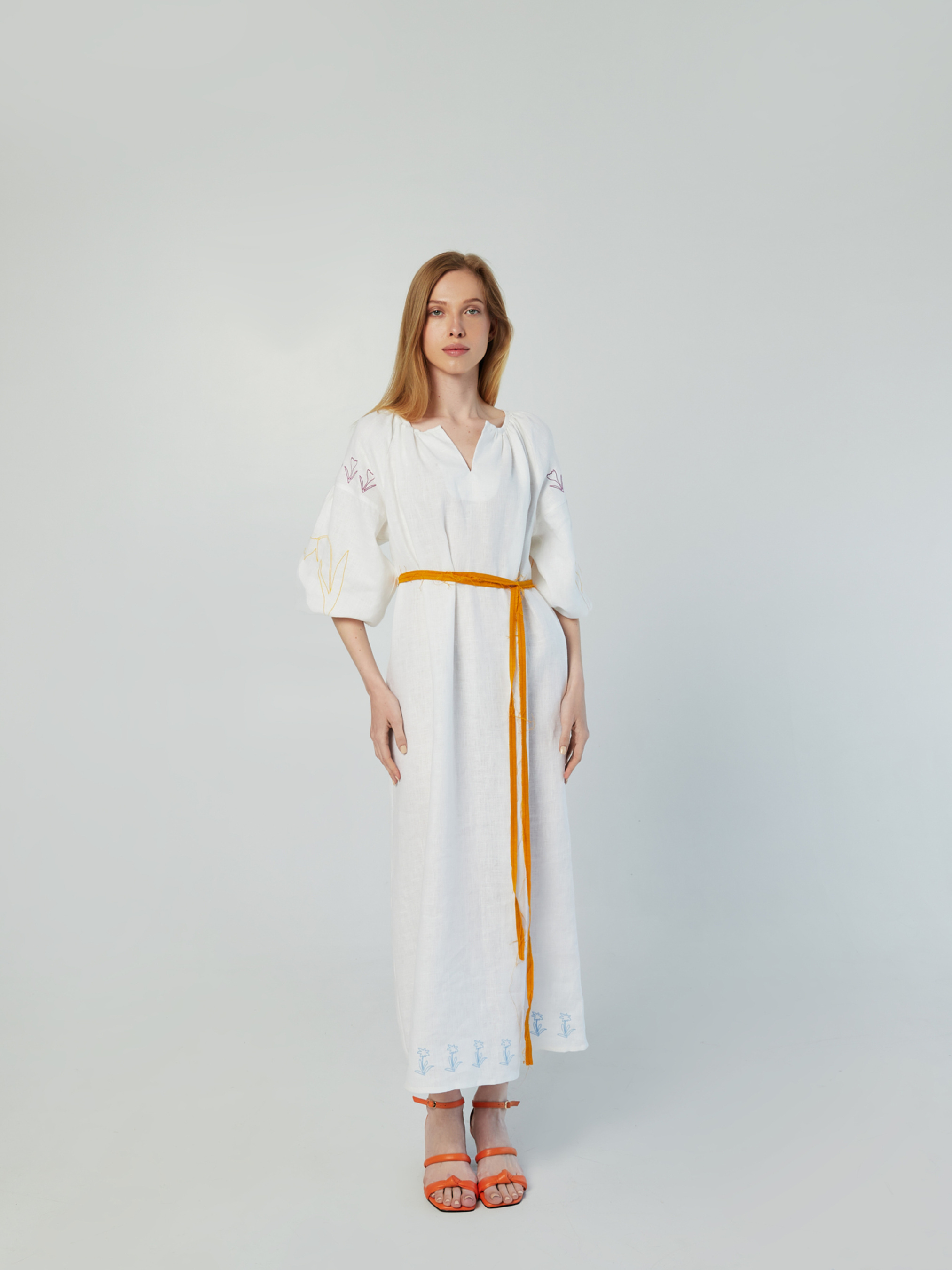 Сукня вільного крою, крій натхненний старовинними сорочками-вишиванками Довжина 125 см/ 49 дюймів Рукава-ліхтарики, машинна вишивка квітів Червоної книги України: Шафран Гейфеля над рукавами, Тюльпан Скіфський на рукавах і Білотка альпійська на подолі сукні Довжина рукава 58 см/23 дюйма В комплекті 2 ремені Матеріал поясів: 100% льон 2 кольори: помаранчевий і фіолетовий Ремені з ефектом необроблених країв Варіанти одягання: з та без поясів Колір: молочний Матеріал сукні: 100% льон