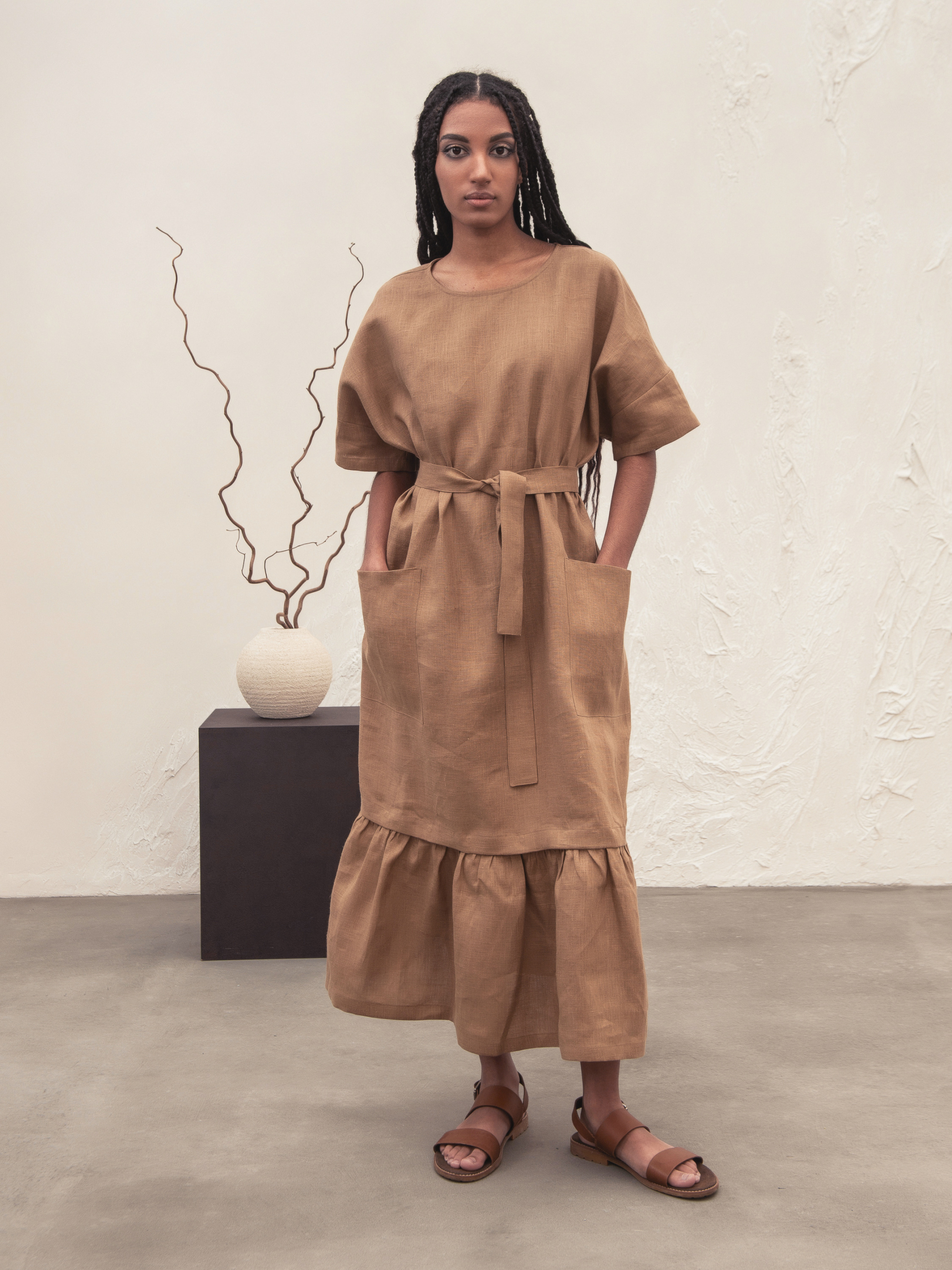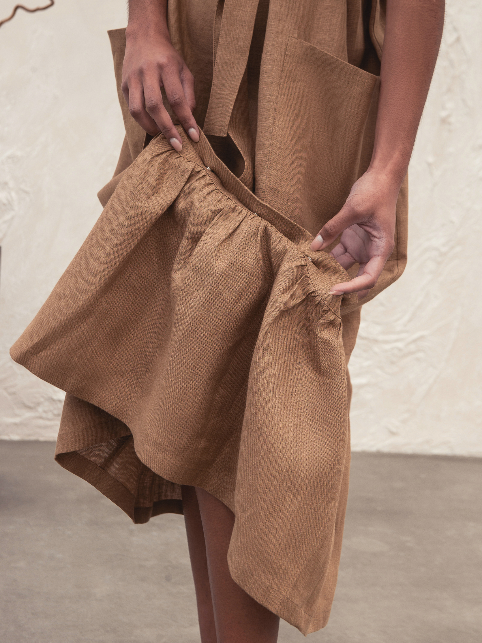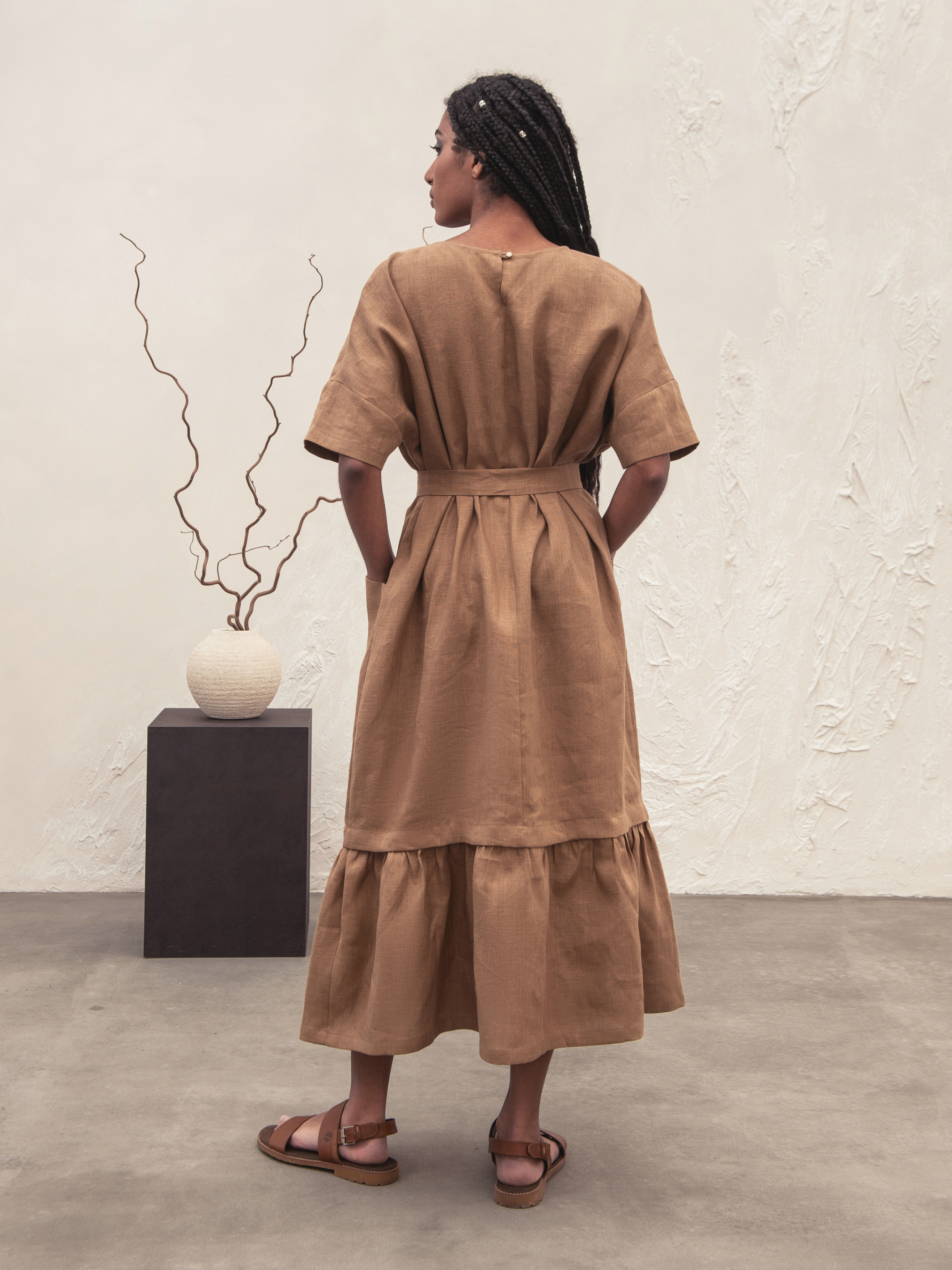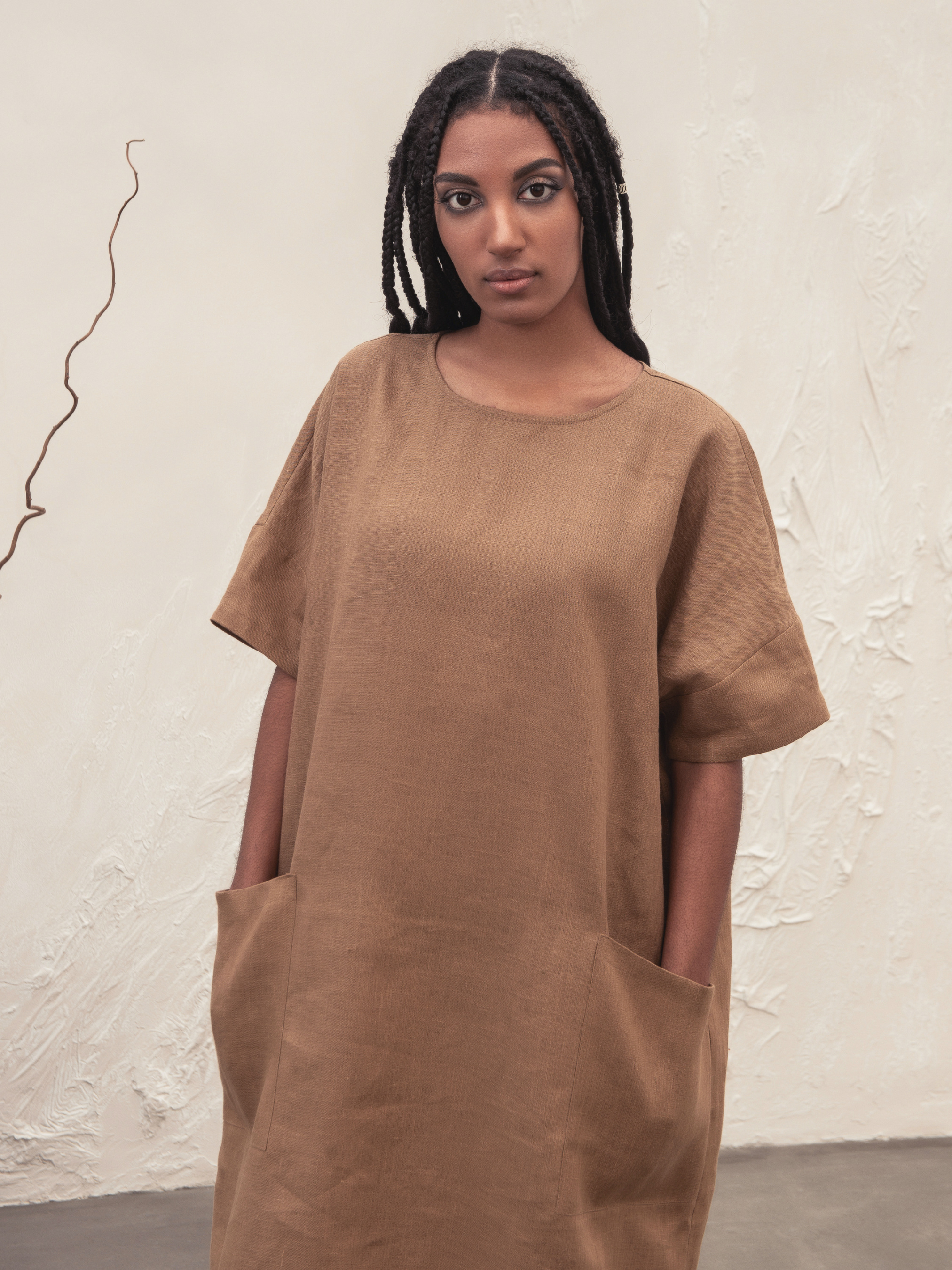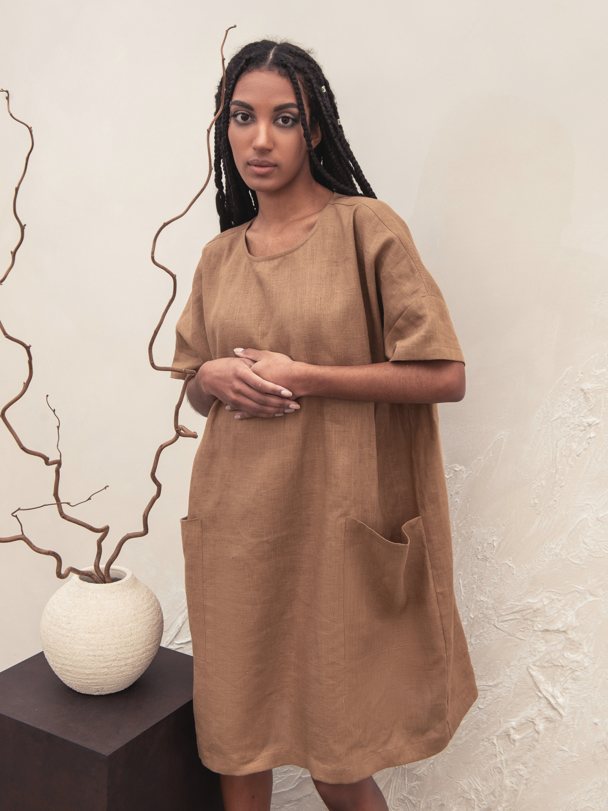 Лляна сукня-трансформер Міранда була розроблена з думкою про комфорт. Ми додали кишені, що відрізняє цю сукню від звичайної футболки. Довжина вище коліна робить цю сукню ідеальною для щоденних прогулянок. Пояс і міні-спідниця внизу створюють нові образи. Об'єм грудей 131cm Об'єм талії 131cm Об'єм стегон 131cm Довжина (сукня) 123cm Довжина (футболка) 93cm Довжина рукава 46cm (від 7го шийного позвонка) Об'єм низу рукава 39см