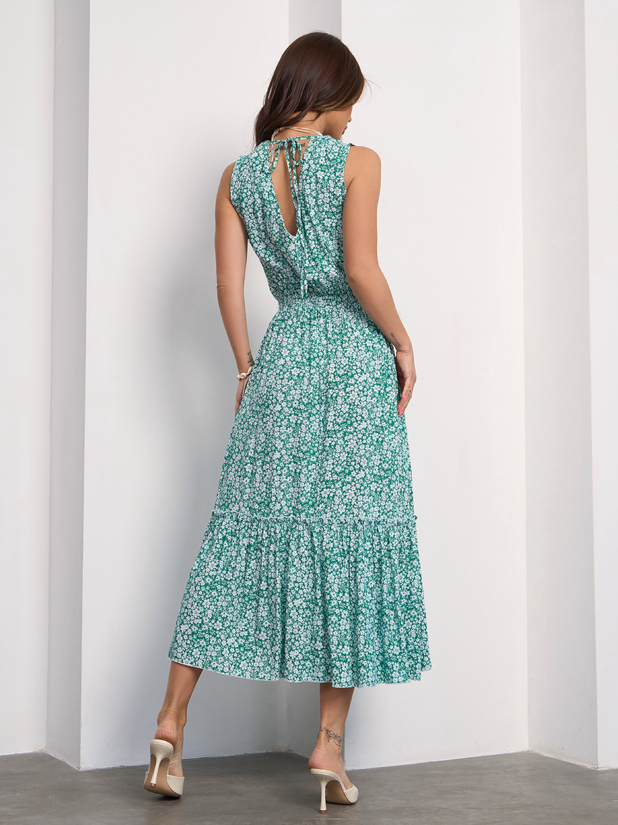 Зелене квіткове плаття без рукавів, виготовлене зі штапелю. Модель із широкою гумкою на талії, відкритою спиною із зав'язкою та глибоким вирізом горловини. Сукня з кишенями та розкльошеним низом з рюшами та воланом. Напівобхват: Груди: S (45), M (47), L (49), XL (51), Талія: S (27-37), M (29-39), L (31-41), XL (33-43), Стегна: S (67), M (69), L (71), XL (73), Довжина виробу - 116, Тканина: Низької еластичності. Склад: 100% бавовна