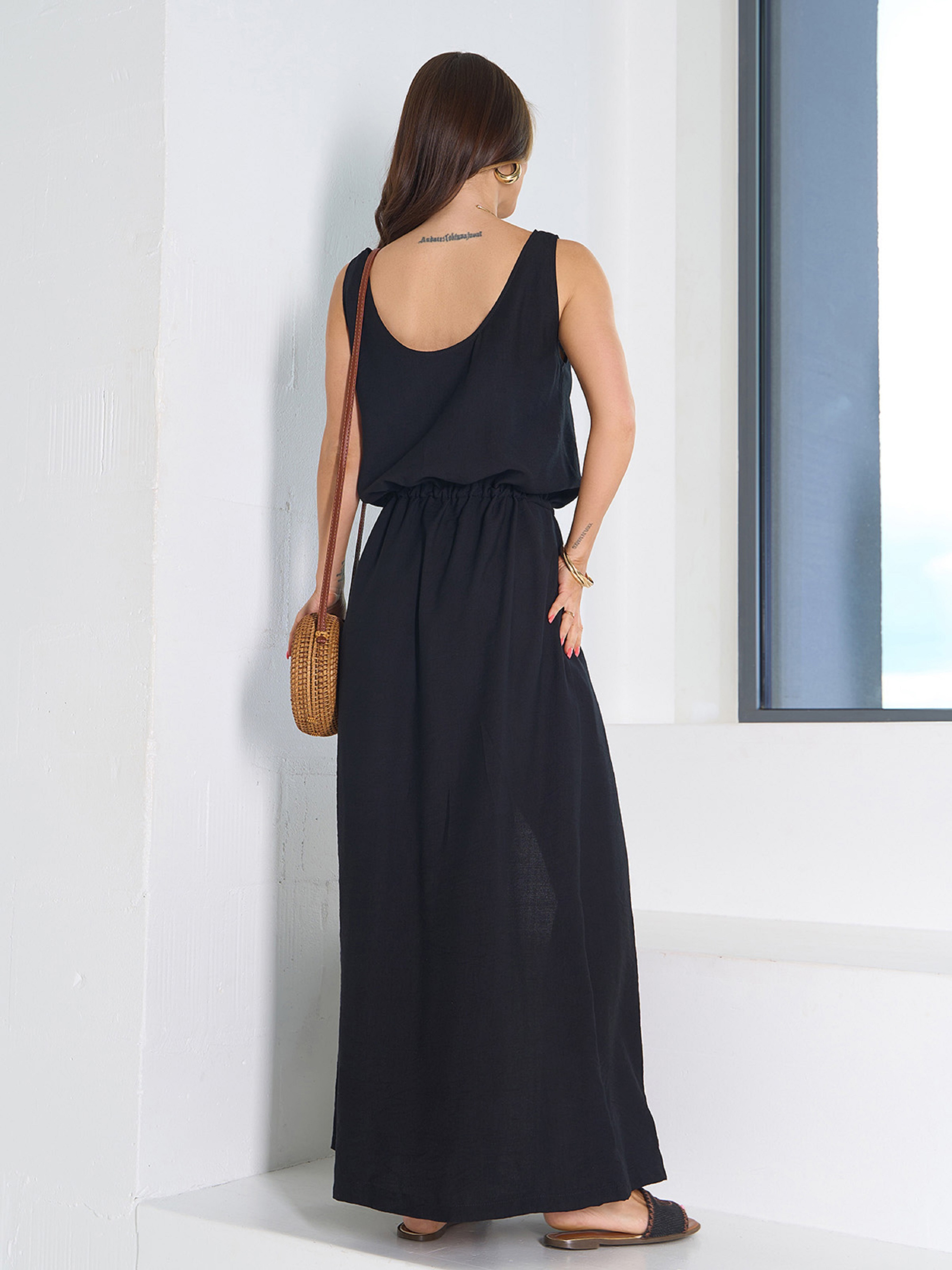 Чорний лляний сарафан без рукавів із планкою на ґудзиках. Модель довжини в підлогу з куліскою на талії і кишенями. Сарафан прямого вільного крою з поглибленою проймою горловини. Напівобхват: Груди: S (47), M (48), L (52), XL (54), XXL (57), 3XL (59); Талія: S (50), M (52), L (55), XL (57), XXL (60), 3XL (62); Стегна: S (55), M (58), L (60), XL (62), XXL (65), 3XL (66); Довжина виробу – 134-139*; Тканина: Низької еластичності.