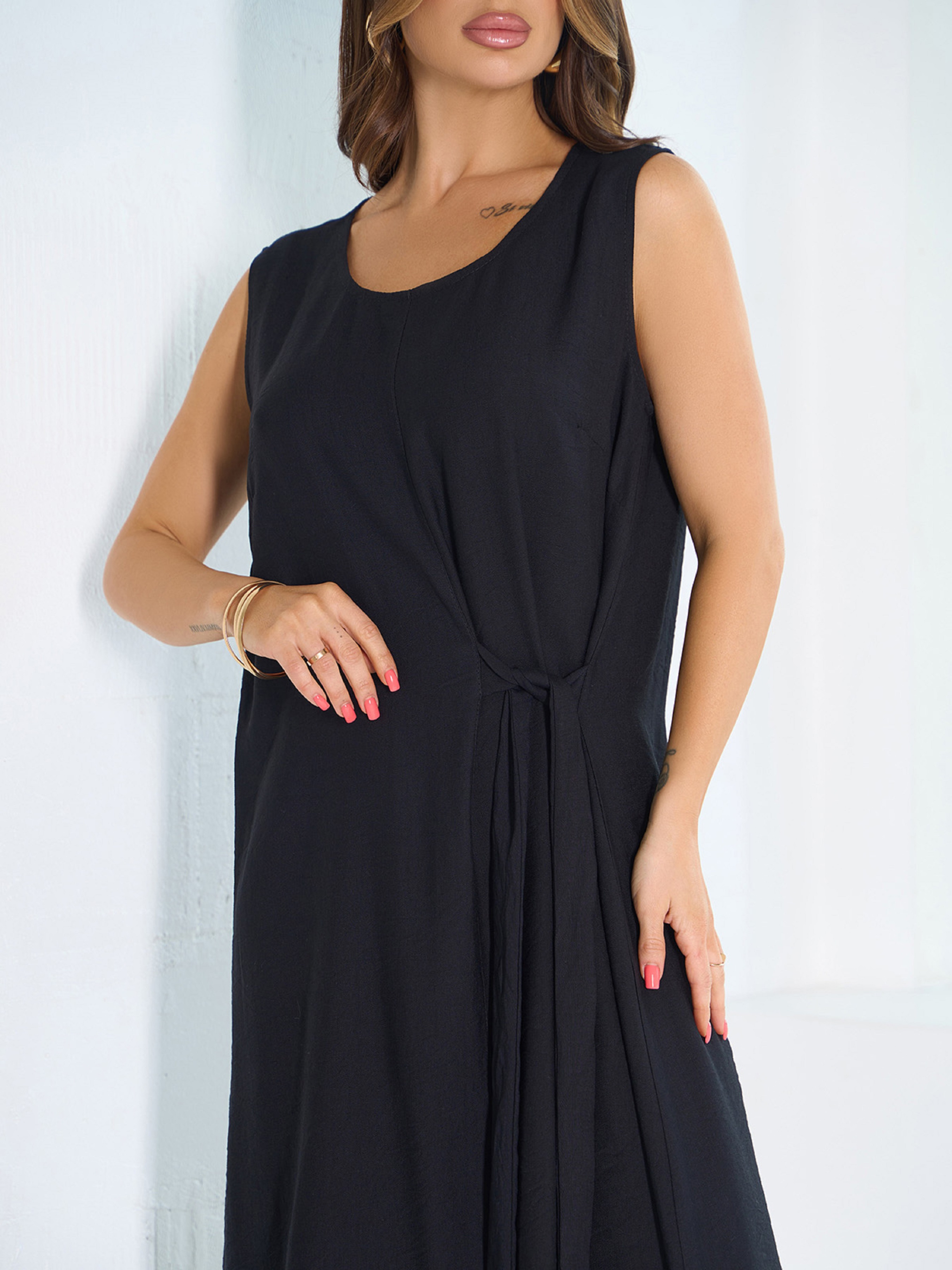 Легкий сарафан із чорного лляного матеріалу з боковою зав'язкою на талії. Модель без рукавів із напівкруглою горловиною. Виріб вільного розкльошеного крою міді завдовжки. Напівобхват: Груди: S (50), M (52), L (54), XL (56), XXL (58), 3XL (60), 4XL (62), 5XL (64); Талія: S (54), M (56), L (58), XL (60), XXL (62), 3XL (64), 4XL (66), 5XL (68); Стегна: S (60), M (62), L (64), XL (66), XXL (68), 3XL (70), 4XL (72), 5XL (74); Довжина виробу - 113-120*; Тканина: Низької еластичності.