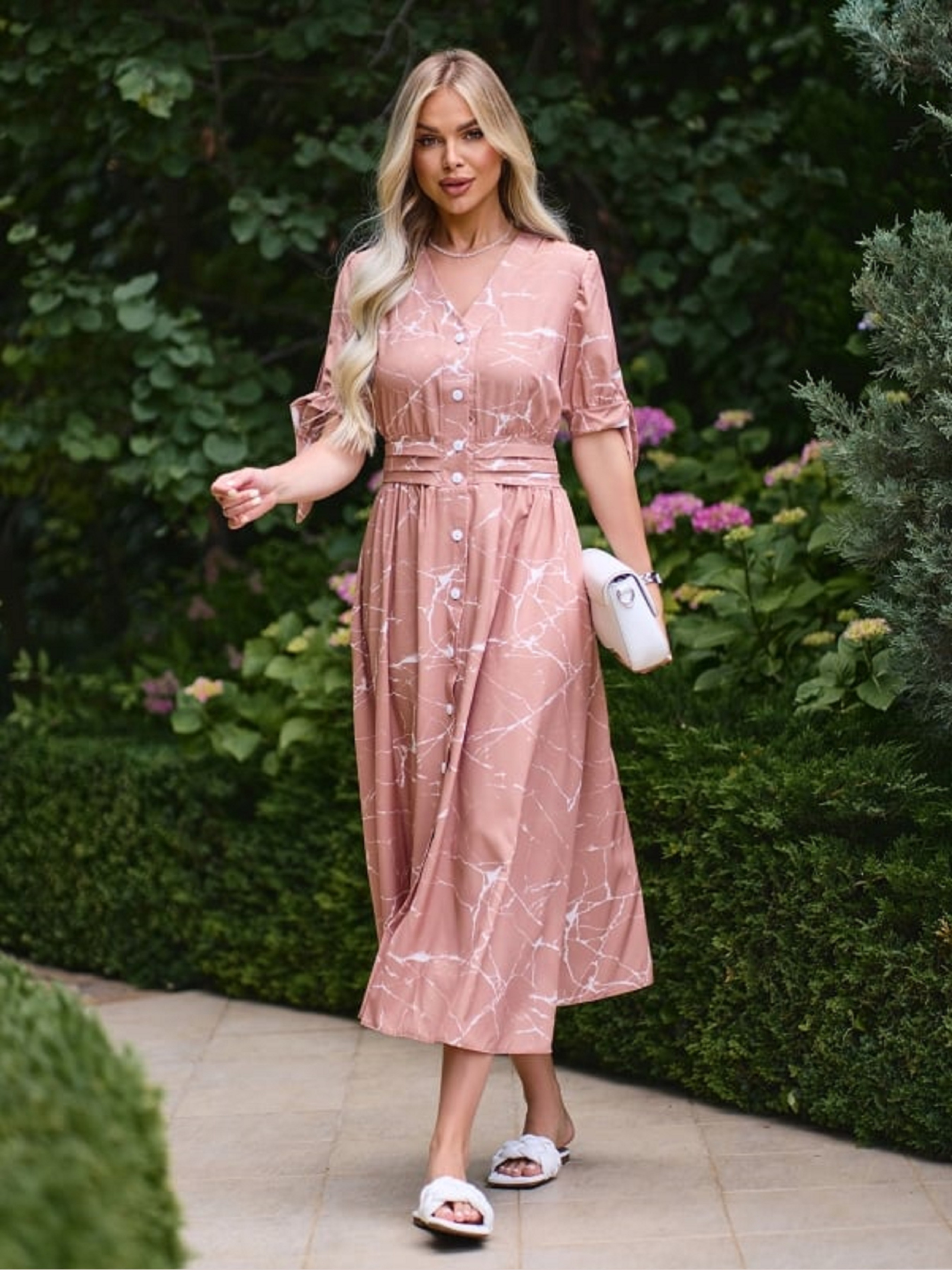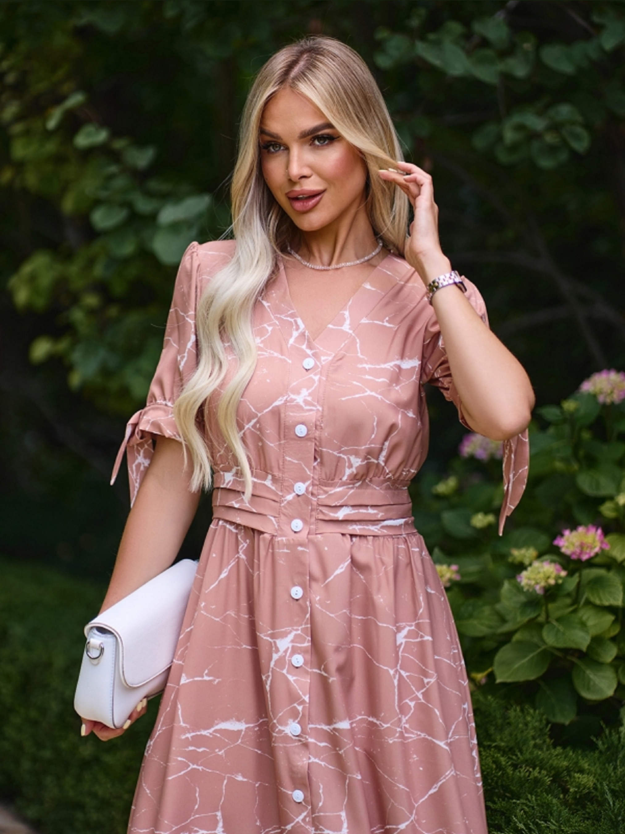 Бежева літня сукня з принтованого софту із короткими рукавами на зав'язках. Модель на ґудзиках з V-подібною горловиною та приталеним кроєм. Сукня міді довжини з кишенями. Напівобхват: Груди: S (45), M (47), L (49), XL (51), Талія: S (36), M (38), L (40), XL (42), Стегна: S (74), M (76), L (78), XL (80), Довжина виробу - 121, Рукав - 27, Тканина: Низької еластичності.
