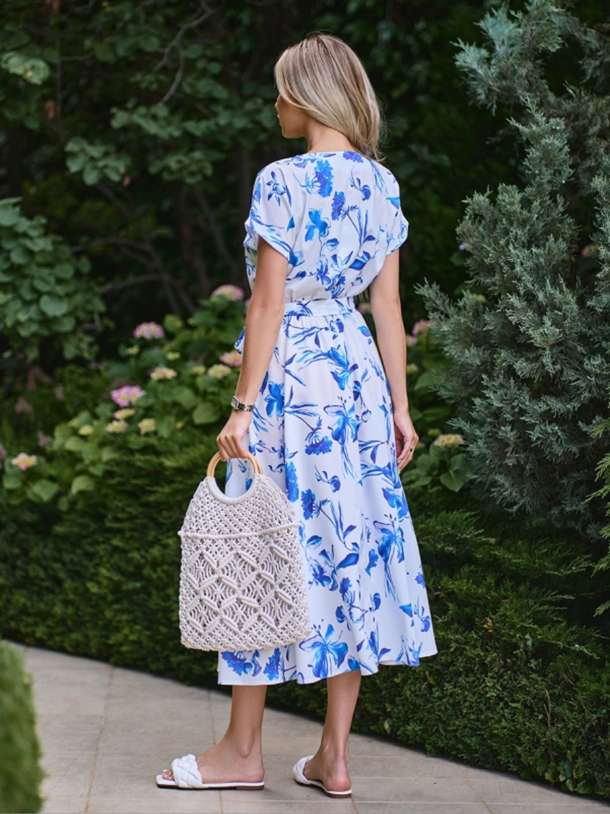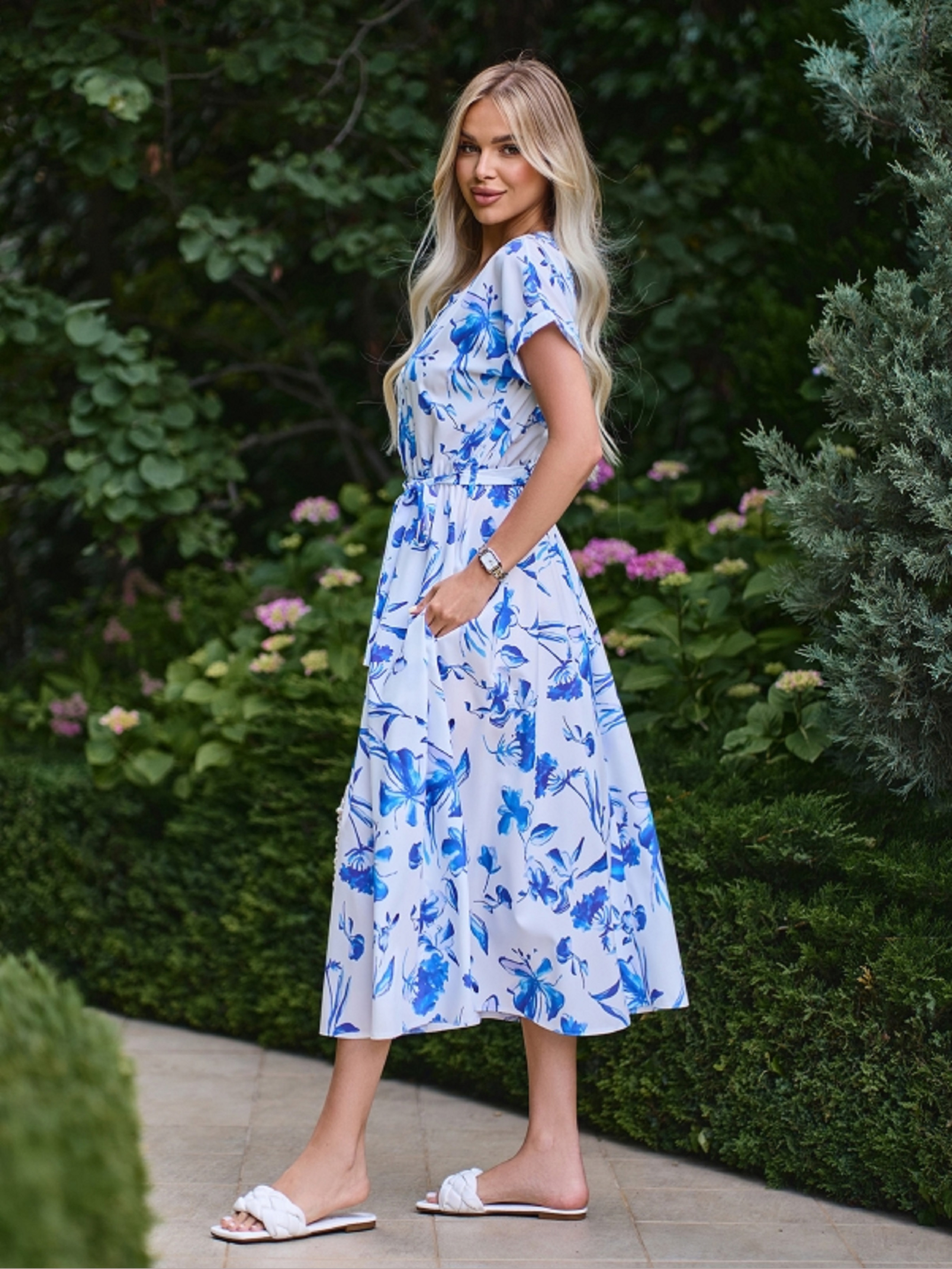 Біло-блакитне квіткове плаття із принтованого софту. Модель з укороченою планкою на ґудзиках, гумкою на талії та розкльошеним низом міді довжини. Сукня з кишенями та знімним поясом у тон. Виріб з проймою кажана та короткими рукавами з підворотами. Напівобхват: Груди: S (49), M (51), L (53), XL (55), XXL (57); Талія: S (32-40), M (34-42), L (36-44), XL (38-46), XXL (48); Стегна: S (74), M (76), L (78), XL (80), XXL (82); Довжина виробу - 120; Рукав - 10; Тканина: Низької еластичності.