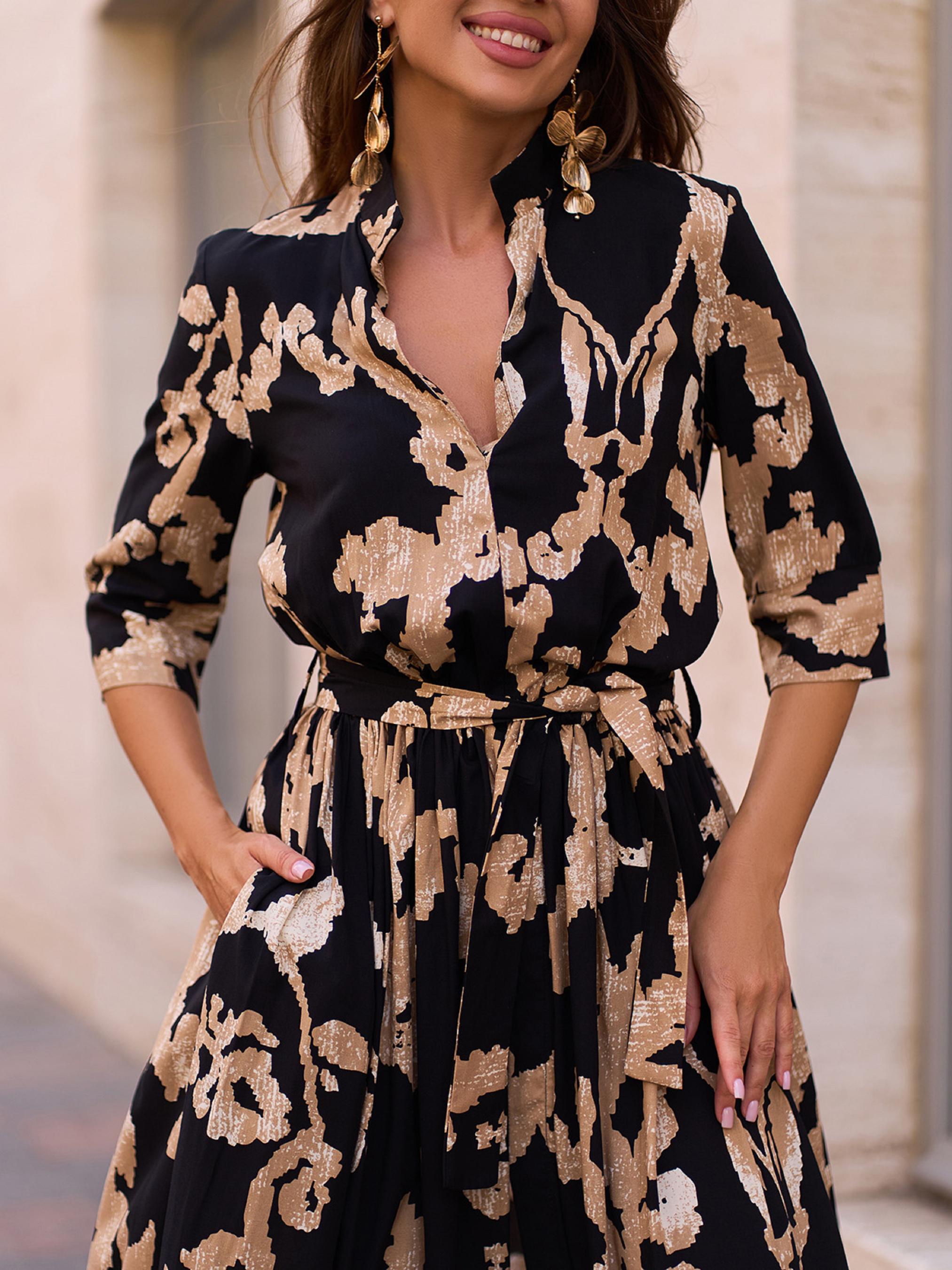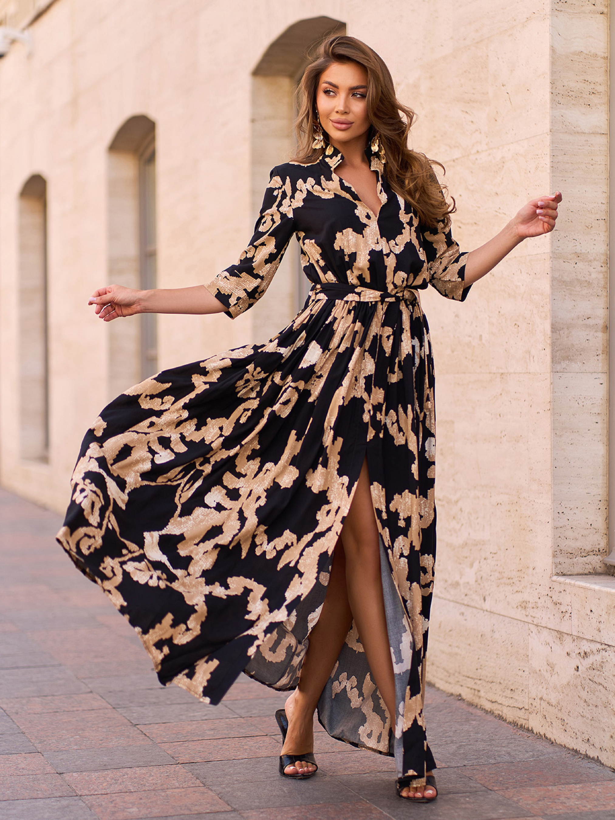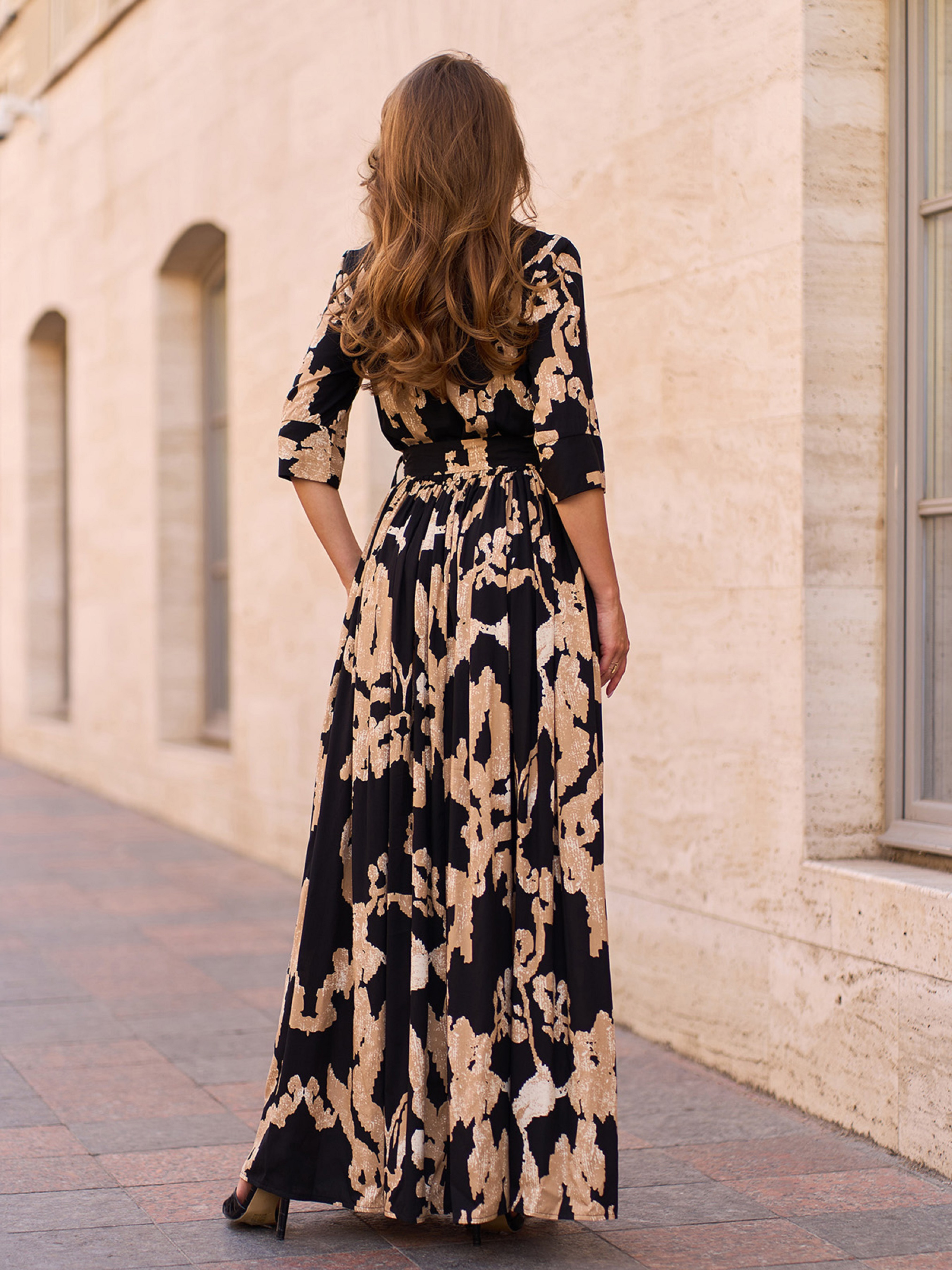 Довга чорна сукня з принтованої бавовни з гумкою на талії та знімним поясом. Модель з V-вирізом горловини, коміром та рукавами 3\4. Низ розкльошеного крою з кишенями і переднім довгим розрізом. Напівобхват: Груди: S (46), M (48), L (50), XL (52), XXL (54), 3XL (56), Талія: S (30-40), M (32-42), L (34-44), XL (36-46), XXL (38-48), 3XL (40-50), Стегна: S (84), M (86), L (88), XL (90), XXL (92), 3XL (94), Довжина виробу - 145-147*, Рукав - 36-40*, Тканина: Низької еластичності.