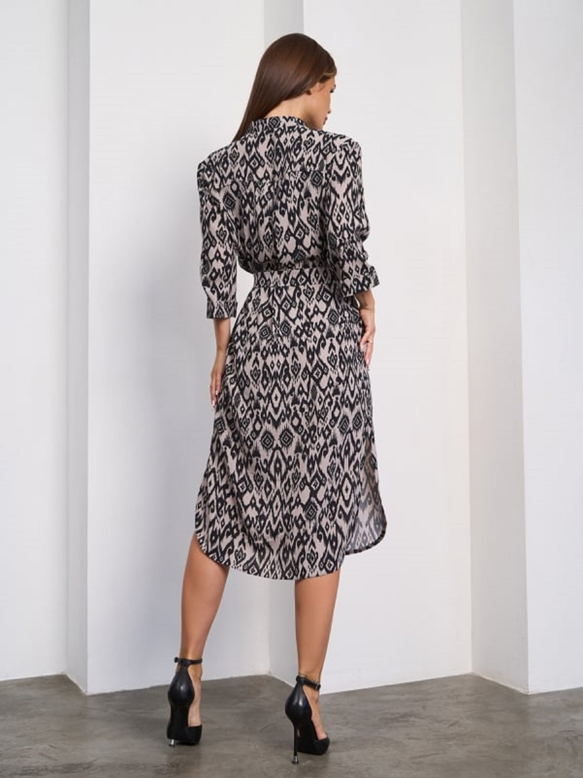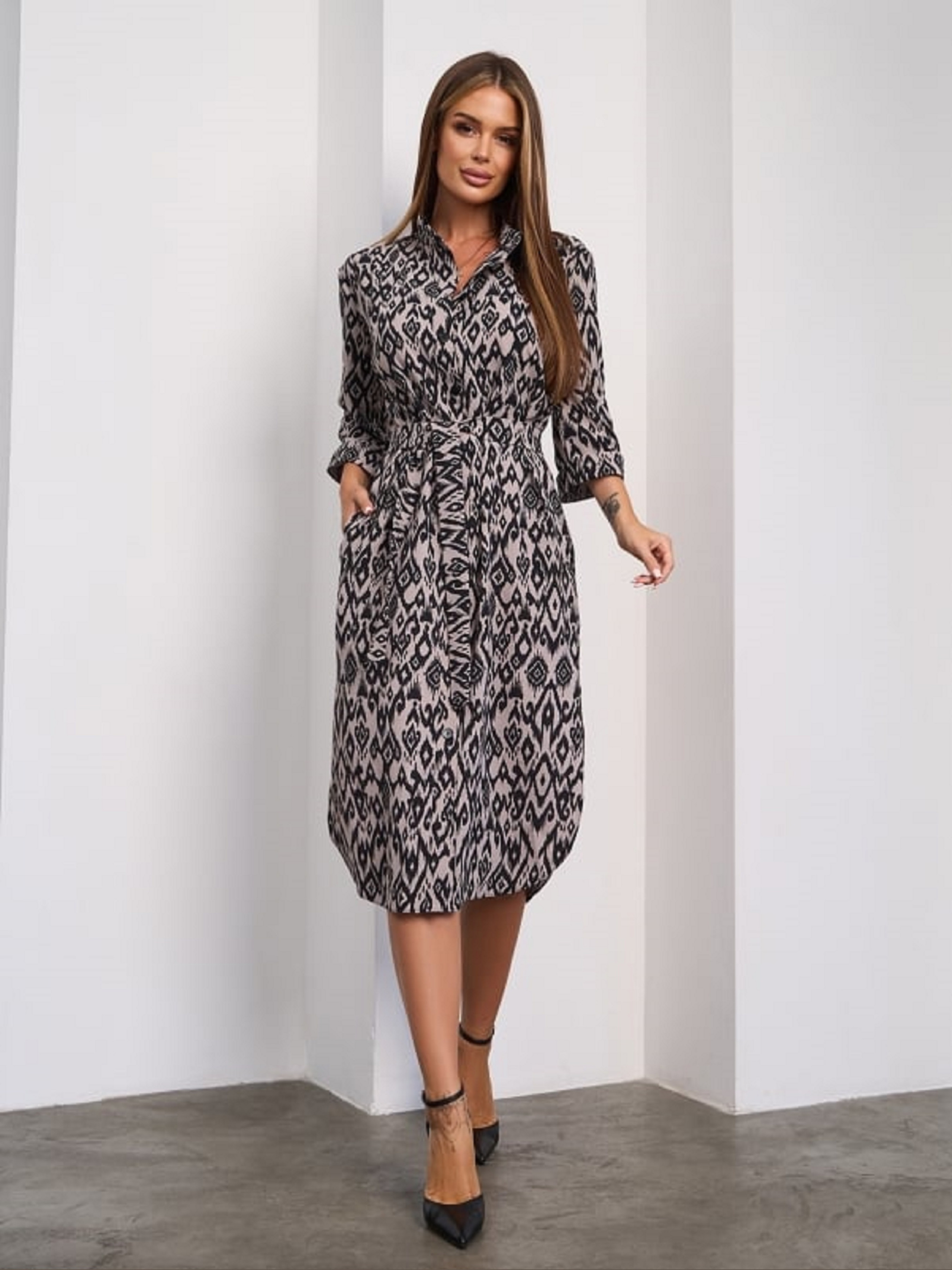 Коричневе плаття-сорочка на гудзиках з рукавами 3/4, виконане із крепу з орнаментом. Модель прямого крою з округлими бічними розрізами та довжиною нижче колін. Сукня з коміром-стійкою та бічними кишенями оснащена знімним поясом. Напівобхват: Груди: S (51), M (53), L (55), XL (57), XXL (59), Талія: S (51), M (53), L (55), XL (57), XXL (59), Стегна: S (51), M (53), L (55), XL (57), XXL (59), Довжина виробу - 104, Рукав - 39, Тканина: Низької еластичності.