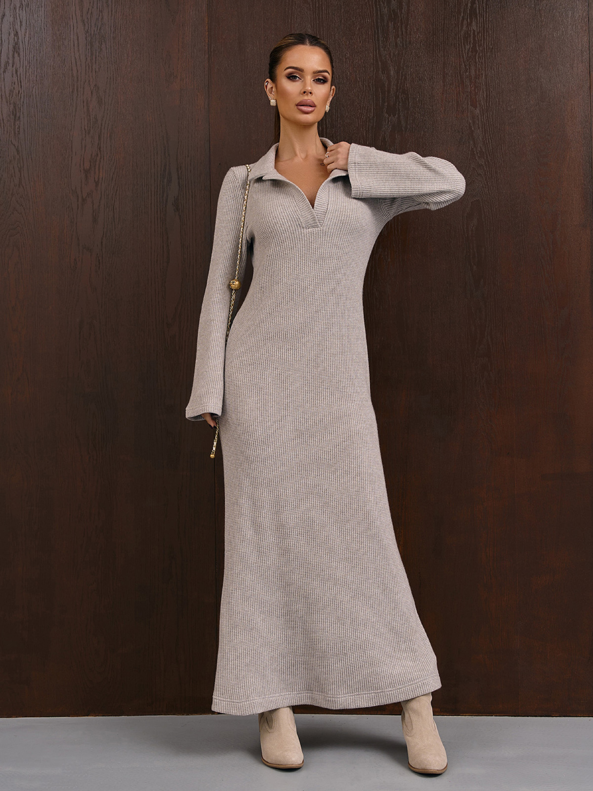 Сіре демісезонне бохо плаття прямого крою, виконане з трикотажу-в'язки. Модель облягаючого крою з довгими рукавами дзвіночками та V-подібною горловиною з коміром. Напівобхват: Груди: S (44), M (46), L (48), XL (50), Талія: S (42), M (44), L (46), XL (48), Стегна: S (44), M (46), L (48), XL (50), Довжина виробу - 134, Довжина рукава - 62, Тканина: Високої еластичності.
