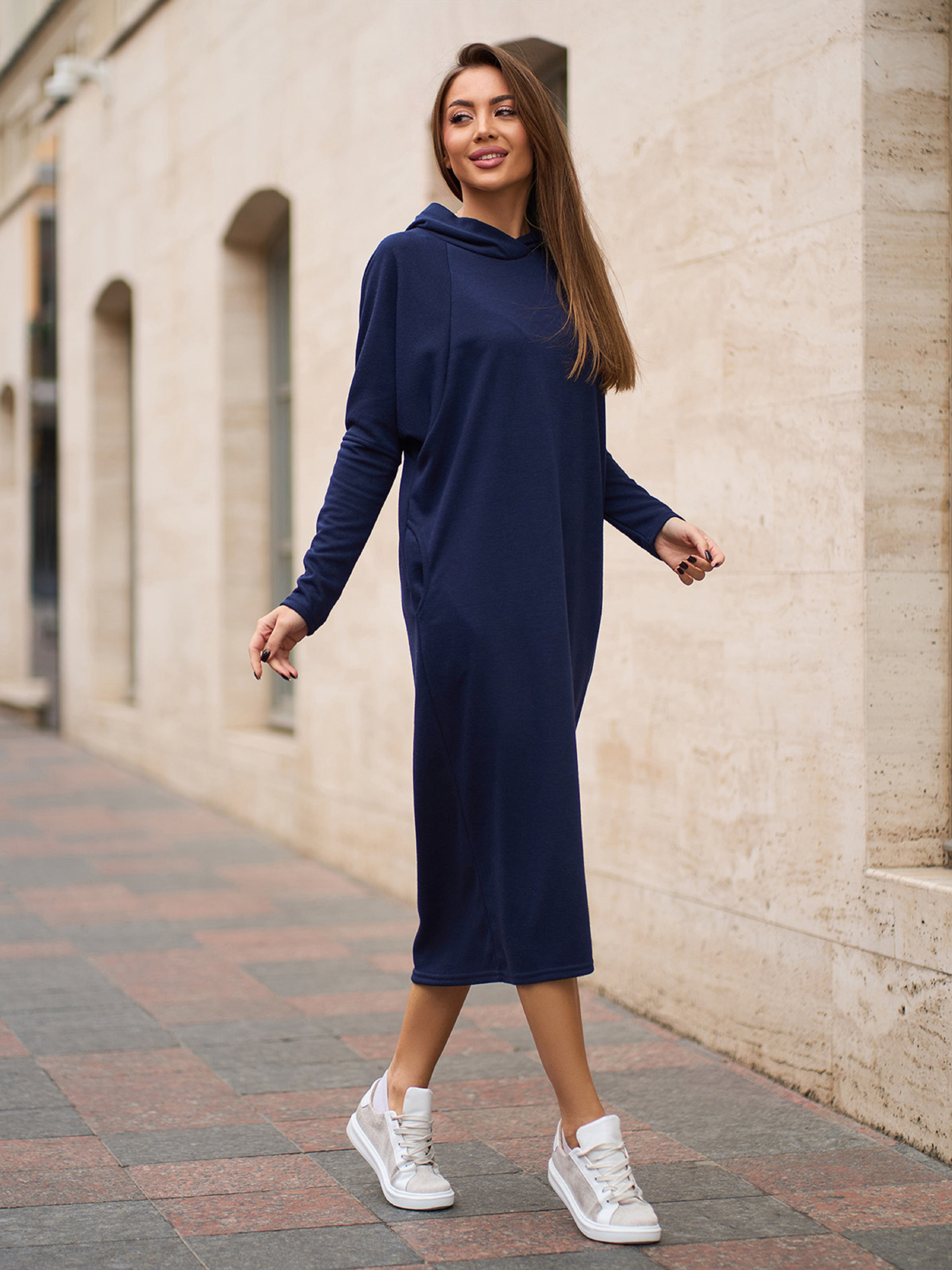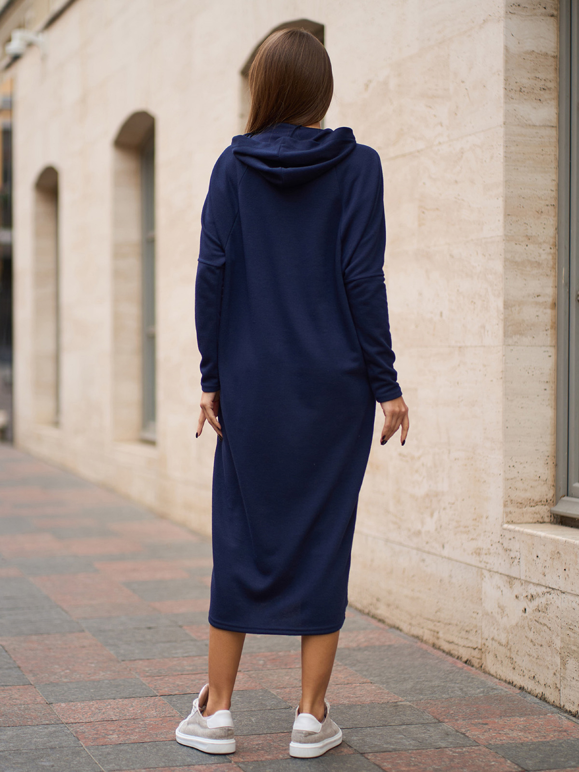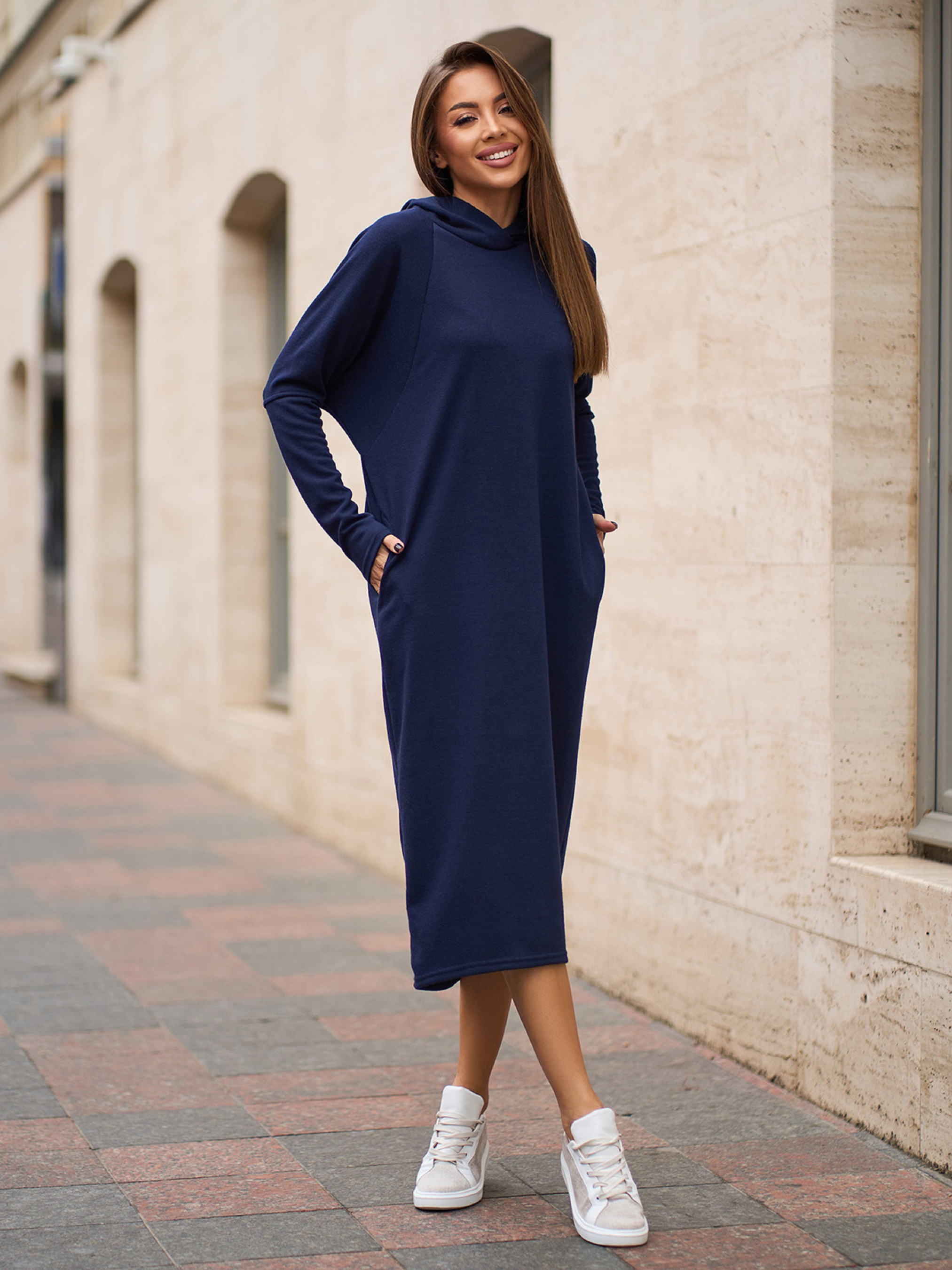 Ангорова темно-синя сукня міді довжини з довгими рукавами-реглан. Модель асиметричного вільного крою з кишенями та захисним капюшоном. Напівобхват: Груди: S (56), M (58), L (60), XL (62), XXL (64), 3XL (66), Талія: S (54), M (56), L (58), XL (60), XXL (62), 3XL (64), Стегна: S (52), M (54), L (56), XL (58), XXL (60), 3XL (62), Довжина виробу - 115/120, Рукав - 54, Тканина: Високої еластичності.