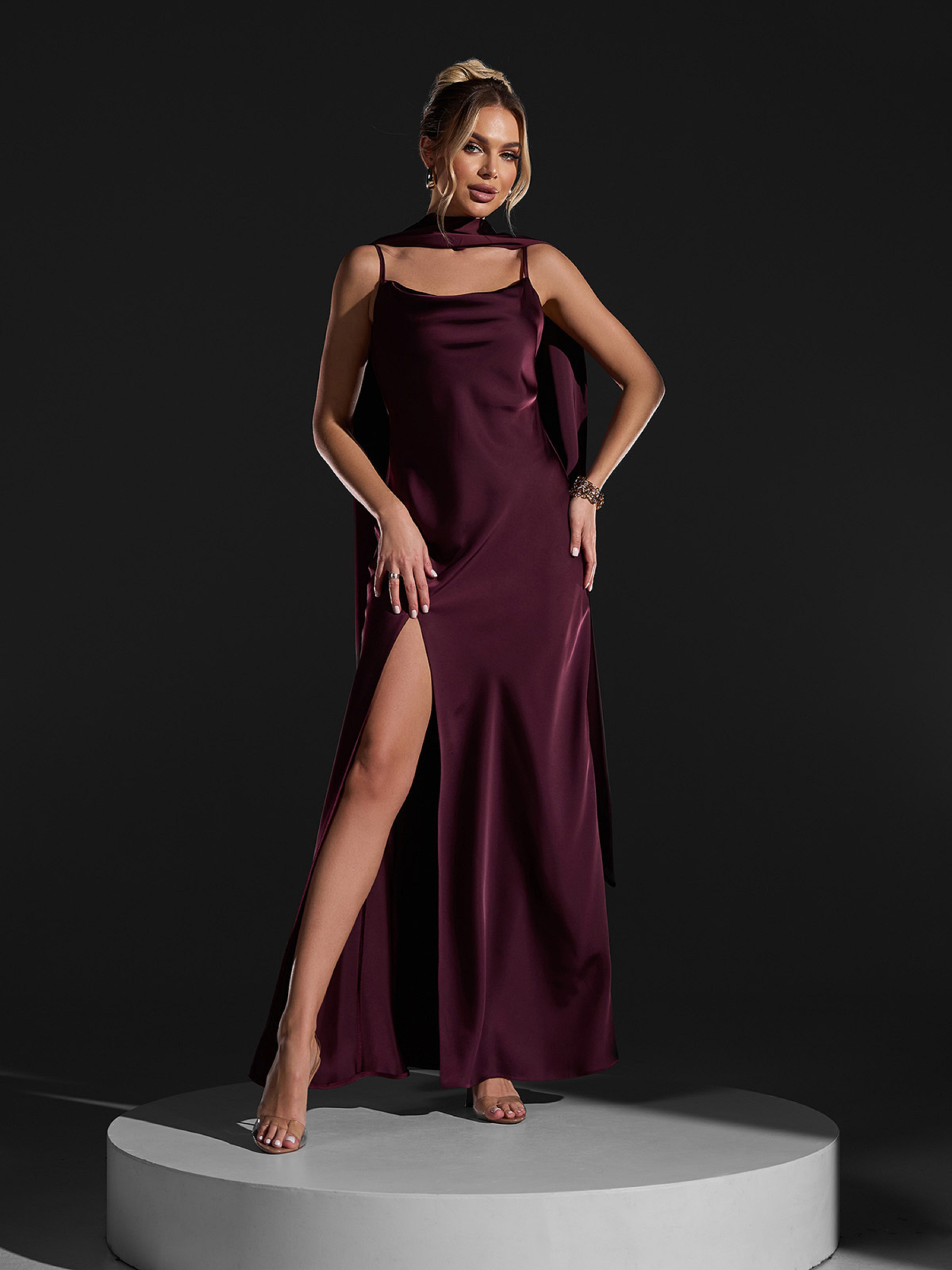 Шовкова вечірня сукня в підлогу темно-бордового кольору з бічним високим розрізом. Модель на тонких бретельках з драпіруванням на грудях і відкритою спинкою. У комплекті довга шаль. Напівобхват: Груди: S (43), M (45), L (47), XL (49), Талія: S (40), M (42), L (44), XL (46), Стегна: S (49), M (51), L (53), XL (55), Довжина виробу - 148, Тканина: Низької еластичності.