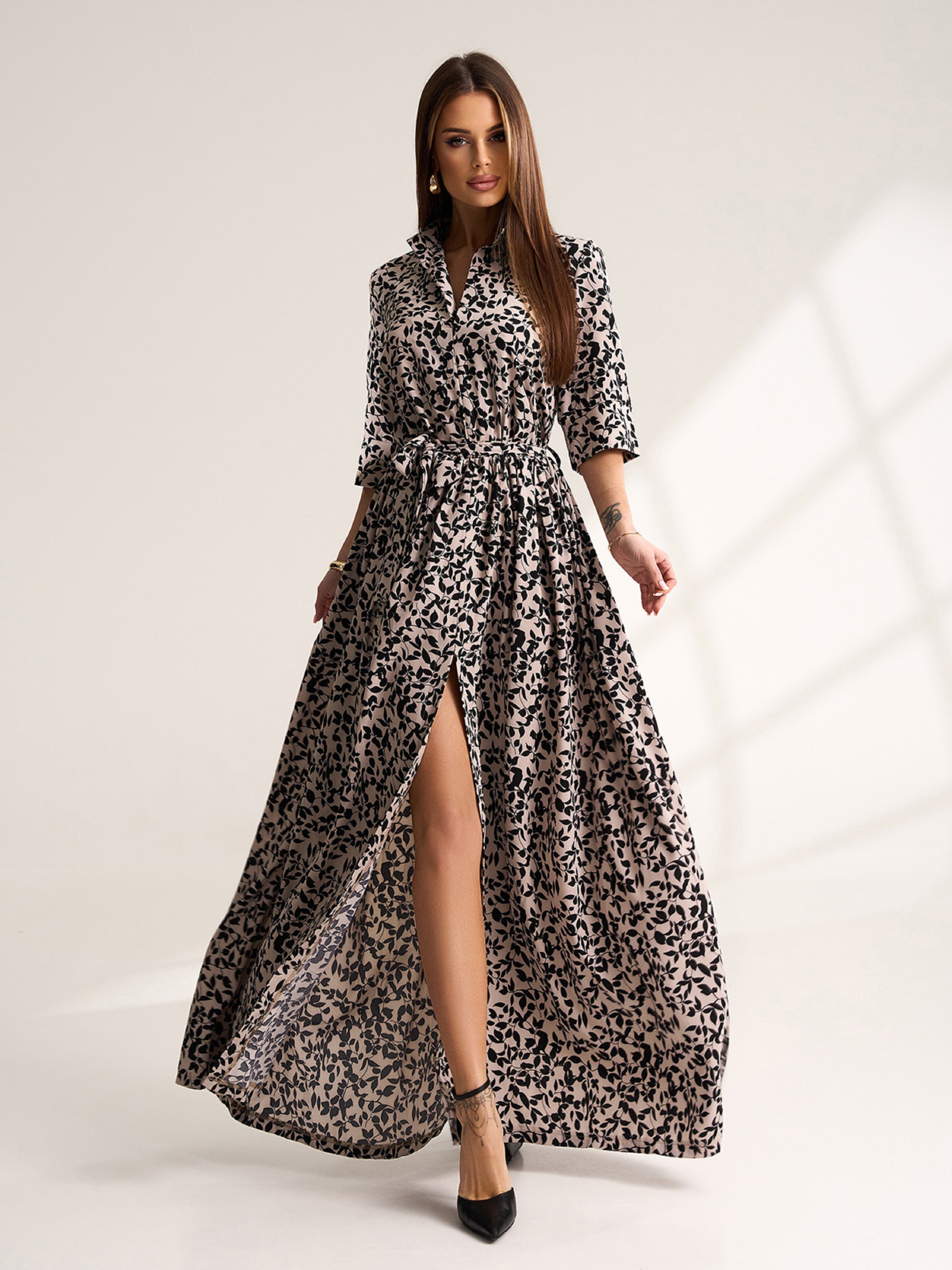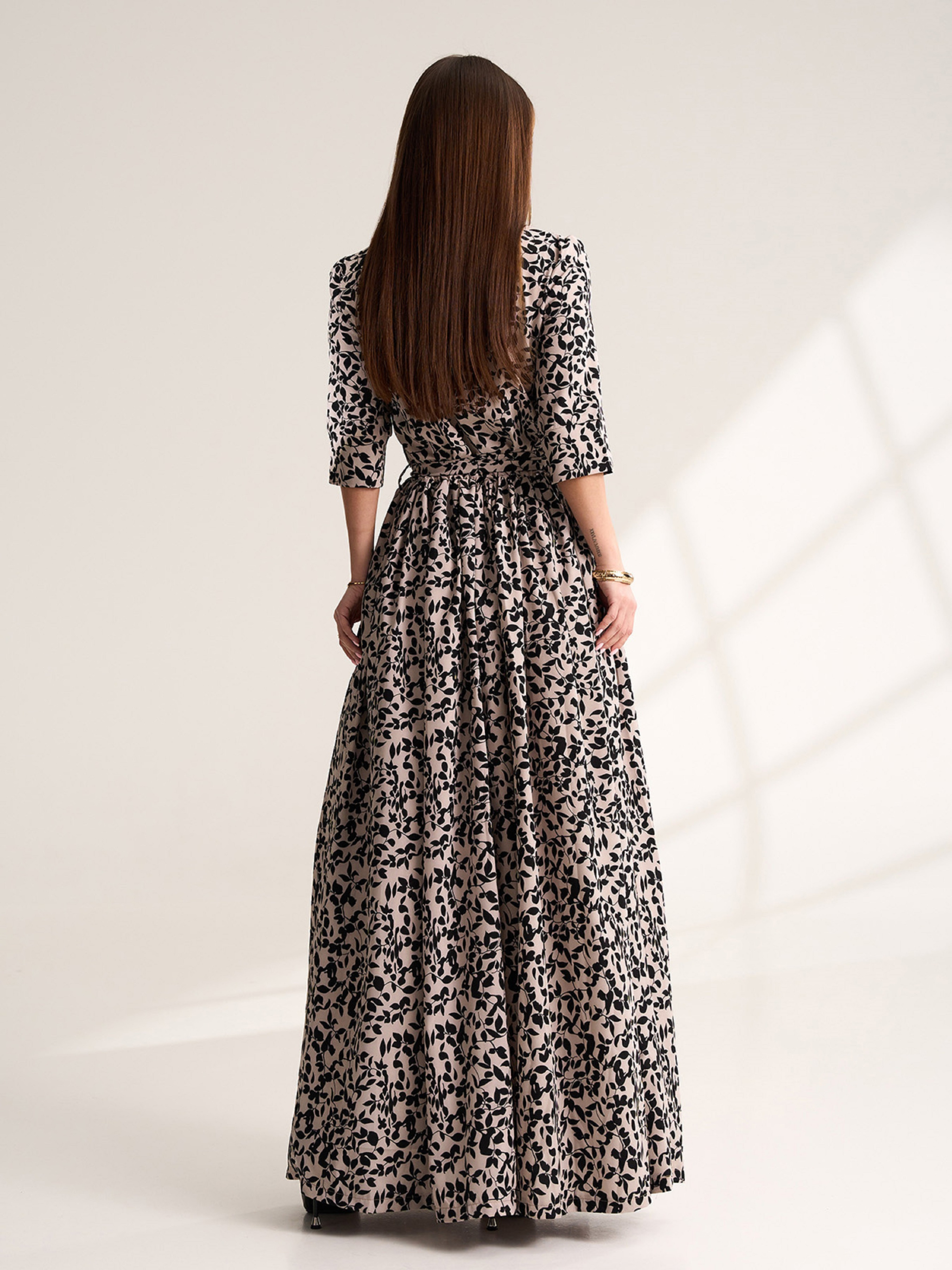 Длинное платье, выполненное из принтованного софта с рукавами длиной 3/4. Платье с расклешенной длинной юбкой с разрезом и карманами. Платье с резинкой на талии, поясом и V-образной горловиной с воротником. Полуобхват: Грудь: S (45), M (47), L (49), XL (51), XXL (53), 3XL (55), Талия: S (26-36), M (28-38), L (30-40), XL (32-42), XXL (34-44), 3XL (36-46), Бедра: S (82), M (84), L (86), XL (88), XXL (90), 3XL (92), Длина изделия - 145, Рукав - 36, Ткань: Низкой эластичности.