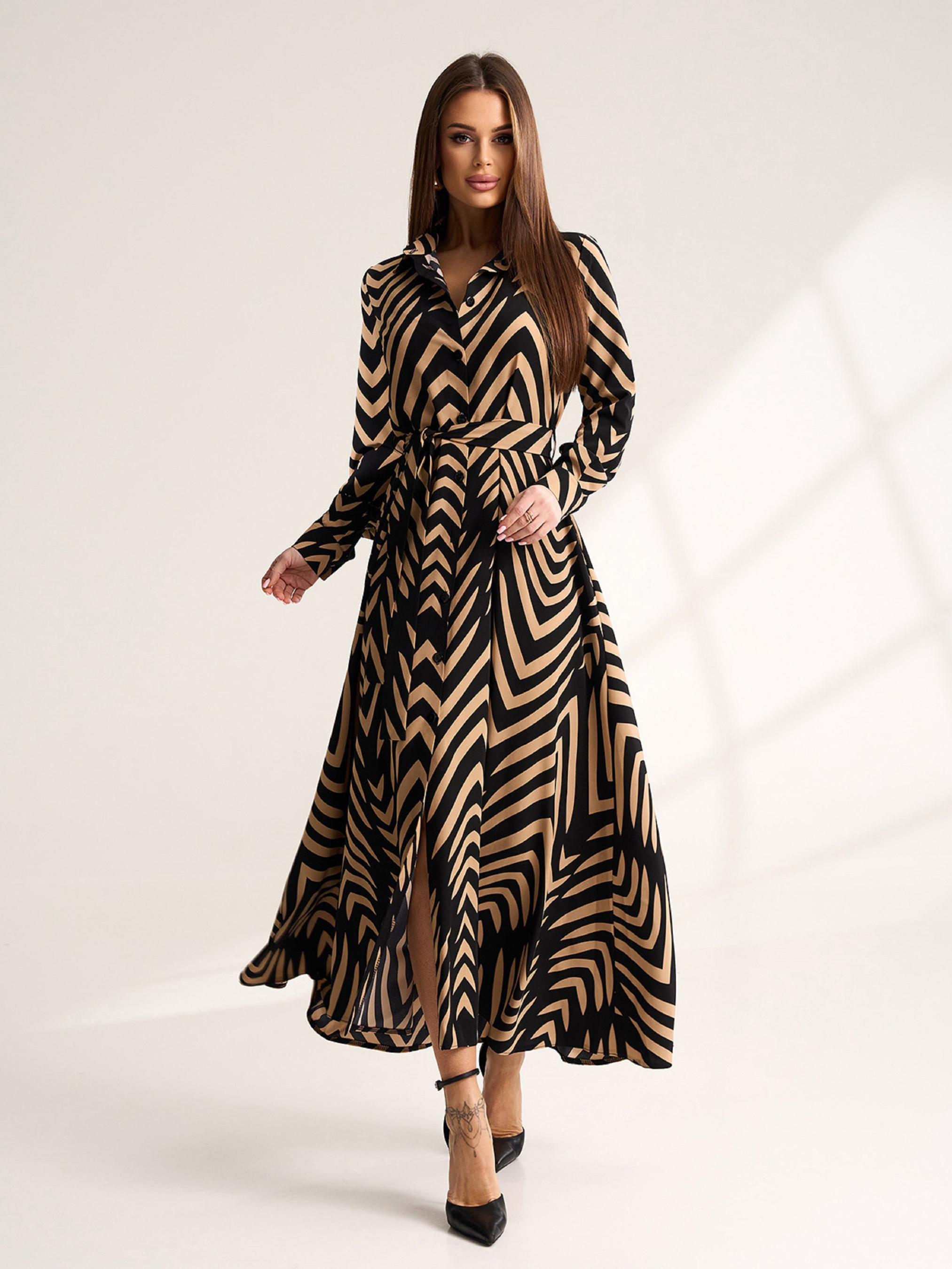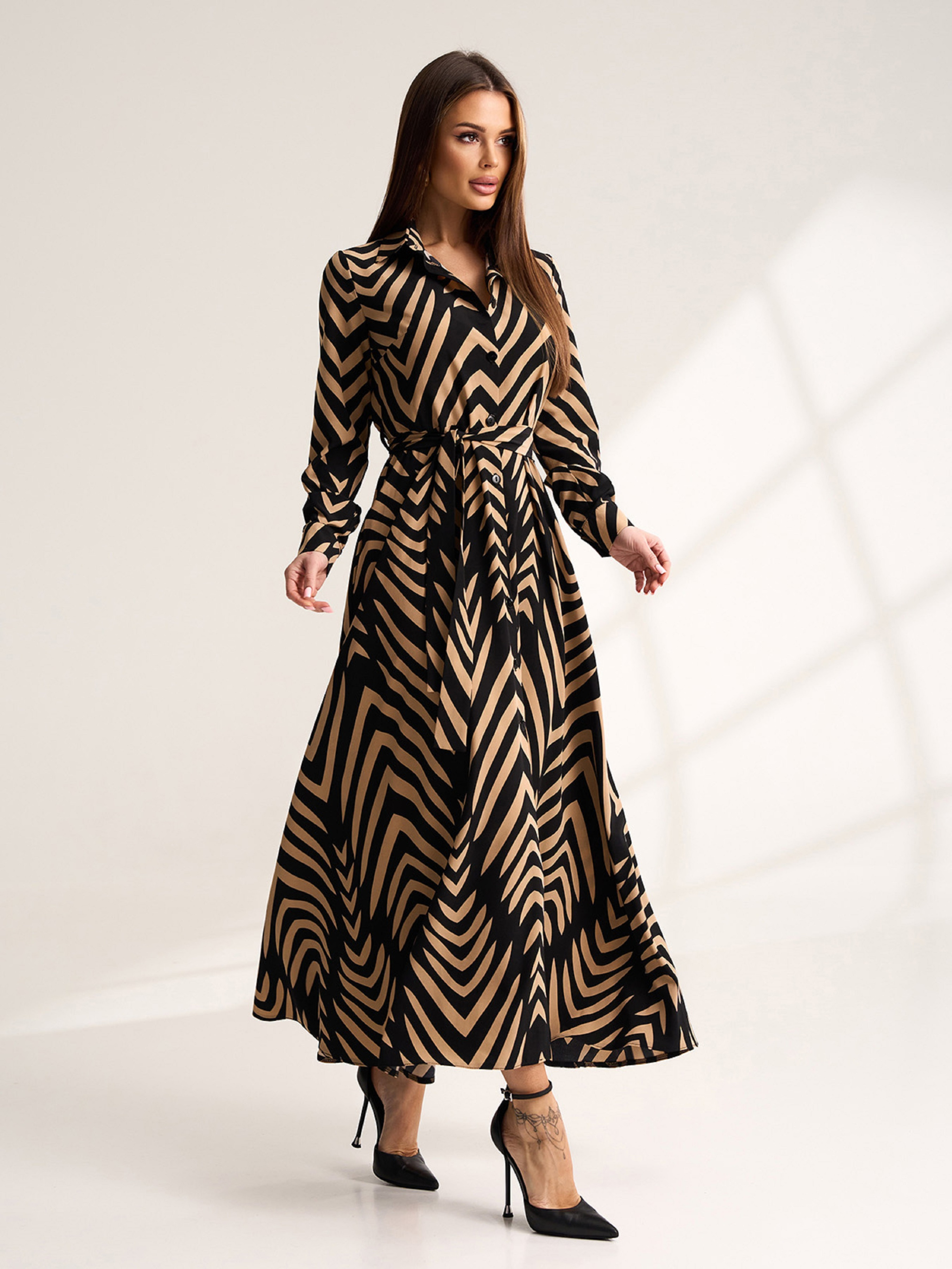 Приталенное платье-рубашка на пуговицах из принтованного черно-бежевого софта. Модель макси длины с расклешенным низом и длинными рукавами на манжетах. Платье со съемным поясом и рубашечным воротником. Полуобхват: Грудь: S (48), M (50), L (52), XL (54), Талия: S (42), M (44), L (46), XL (48), Бедра: S (62), M (64), L (66), XL (68), Длина изделия - 126, Рукав - 63, Ткань: Низкой эластичности.