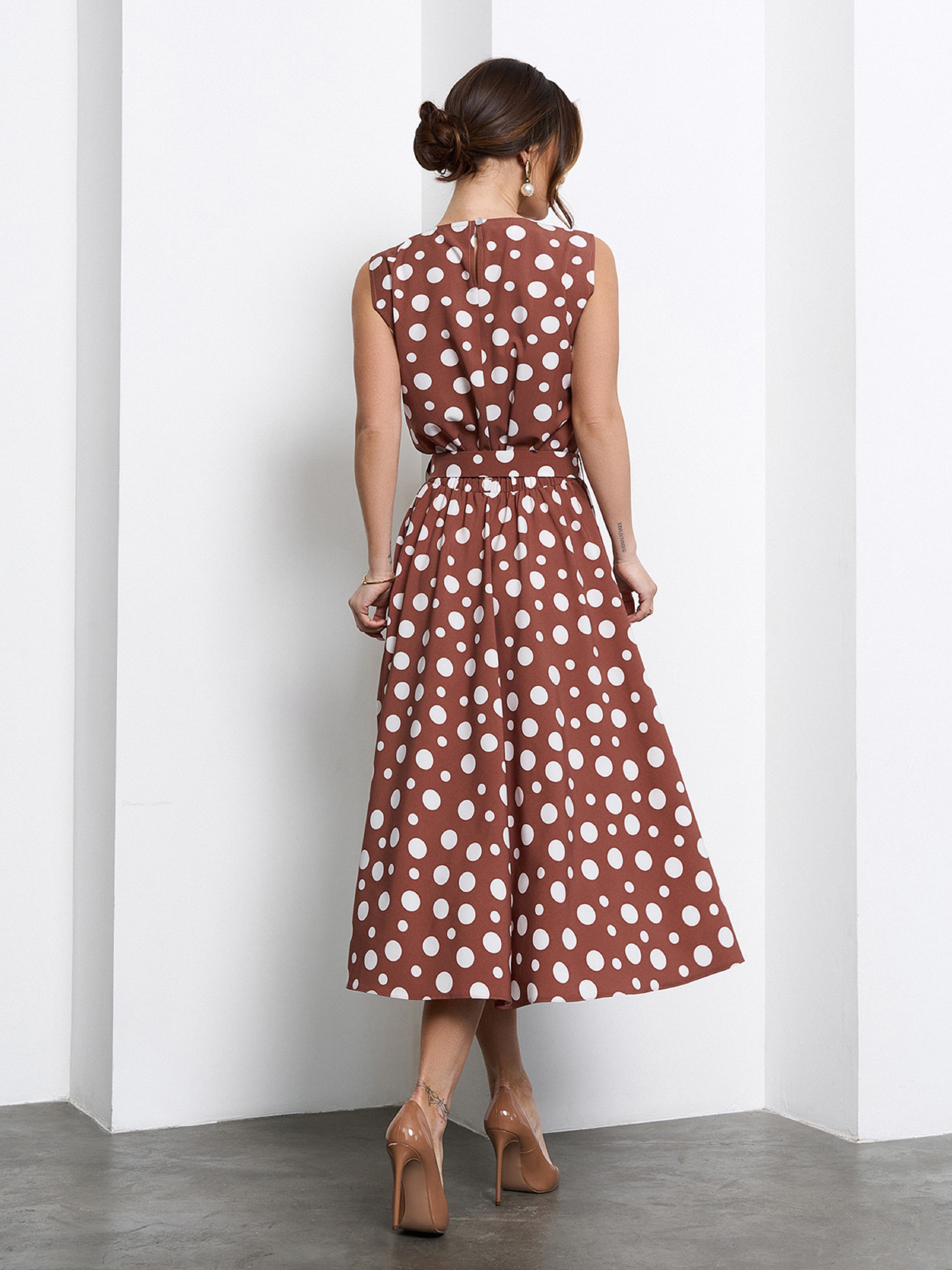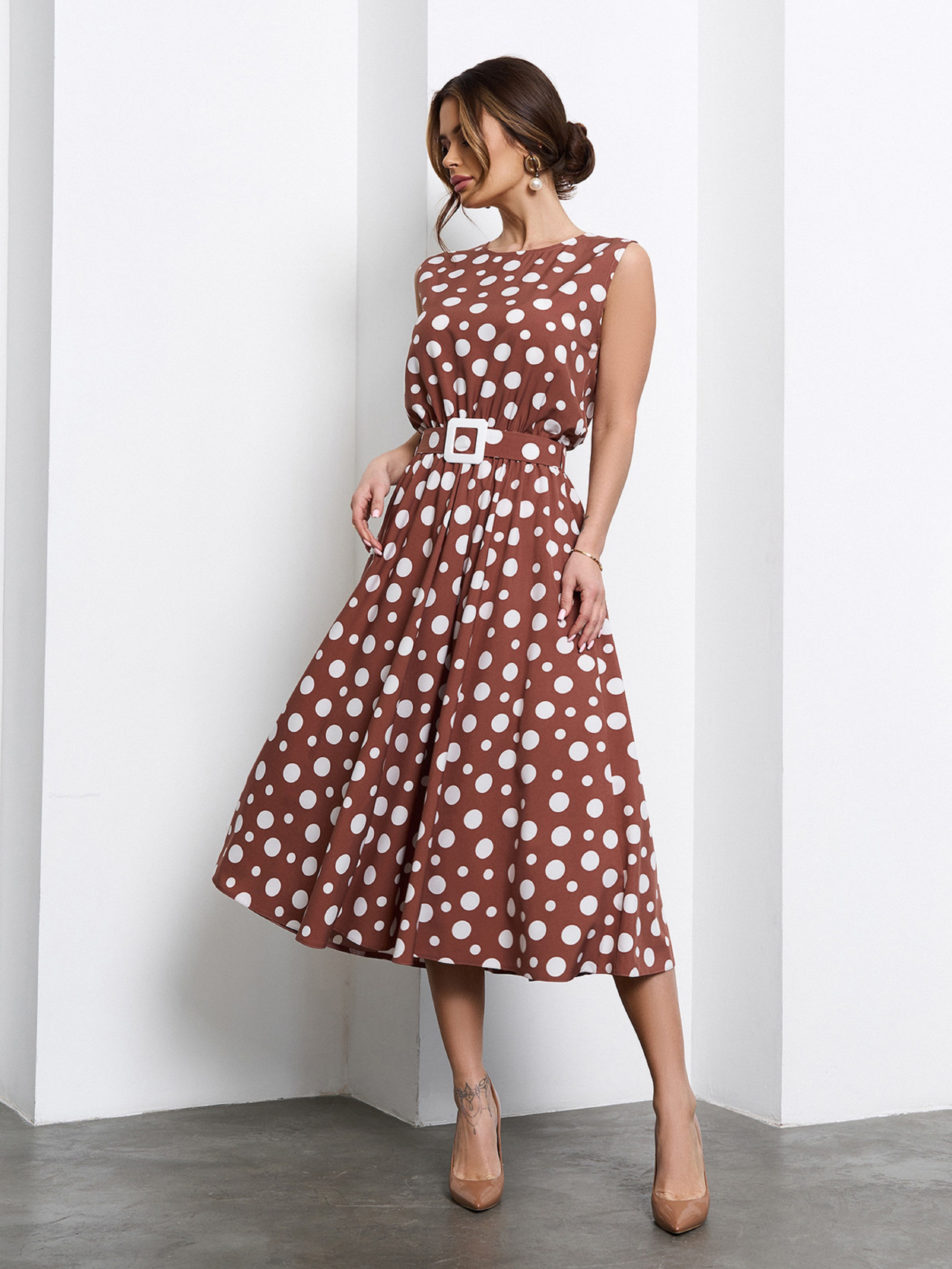 Коричневе елегантне плаття класичного приталеного фасону із софту в горох. Модель з гумкою на талії, низом міді довжини і застібкою у горловини. Сукня без рукавів зі знімним поясом. Напівобхват: Груди: S (47), M (49), L (51), XL (53), XXL (55), 3XL (57), Талія: S (31-41), M (33-43), L (35-44), XL (37-46), XXL (39-48), 3XL (41-50), Стегна: S (70), M (72), L (74), XL (76), XXL (78), 3XL (80), Довжина виробу - 119, Тканина: Низької еластичності.