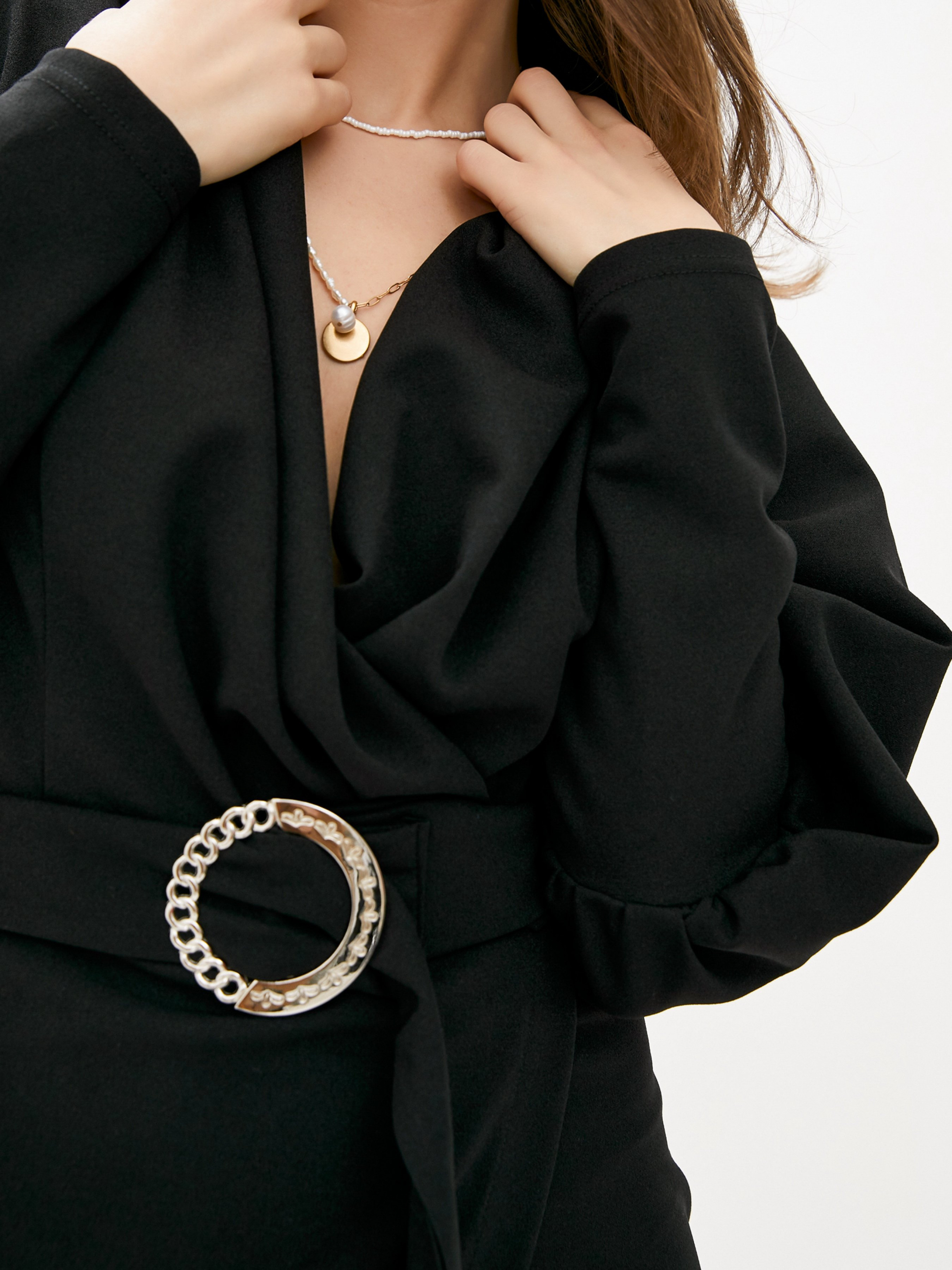 Еластичне чорне плаття виконане з однотонного комбінованого трикотажу. Модель з довжиною до колін декорована запахом по нижньому краю і оснащена знімним пояском з великою пряжкою. Виріб з довгими рукавами декорованими ліхтариками і потайною застібкою-блискавкою. Склад: 100% поліестер. Напівобхват: Груди: S (44-50), M (46-52), L (48-54), XL (50-56), Талія: S (35-39), M (37-41), L ( 39-43), XL (41-45), Стегна: S (45-49), M (47-51), L (49-53), XL (51-55), рукав-60, довжина - 90, Тканина: Висока еластичність.