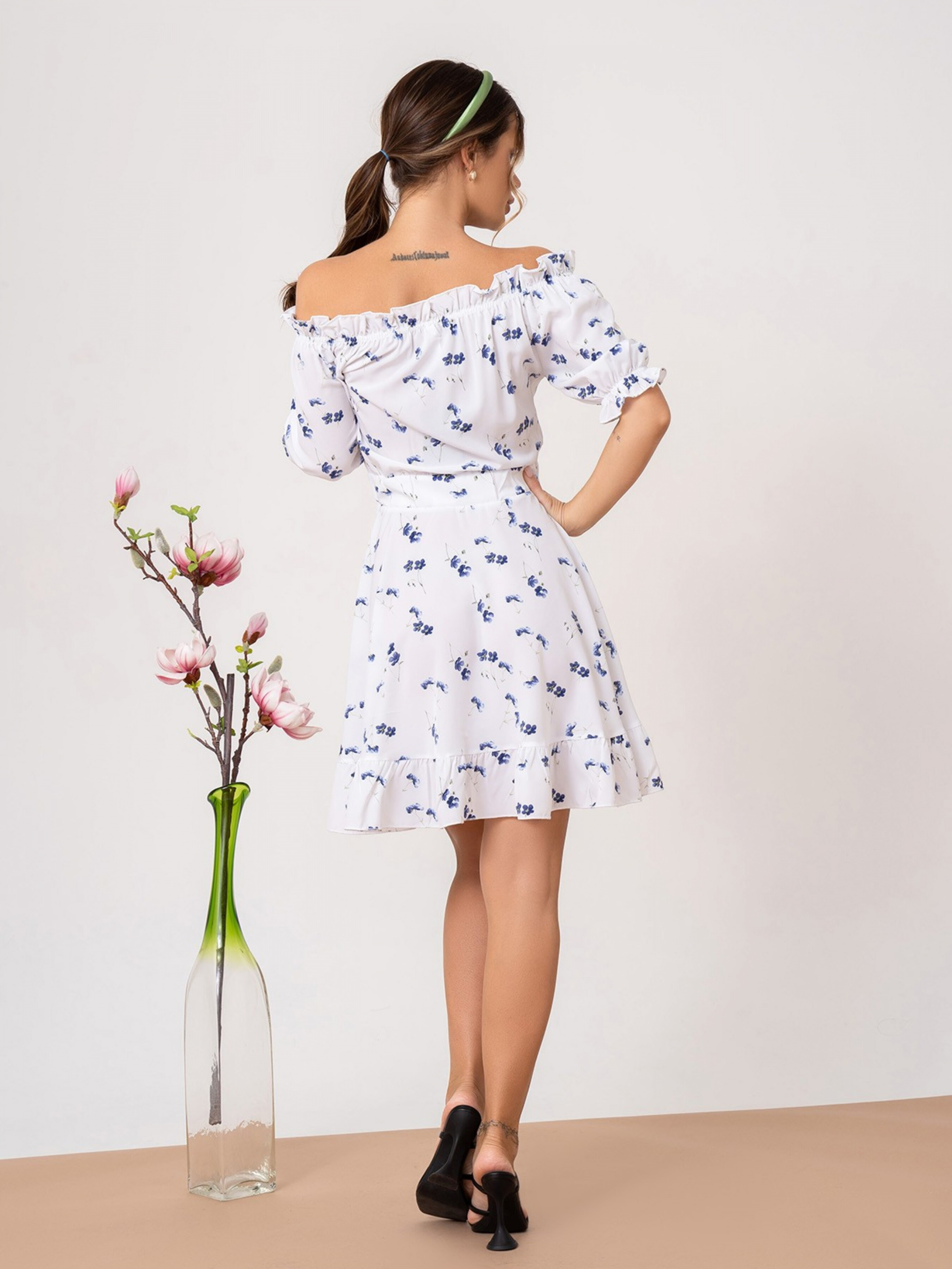 Біло-блакитна коротка сукня на гудзиках. Біла сукня короткої довжини на гудзиках, виготовлена з софту з квітковим блакитним принтом. Модель з широкою гумкою на талії та короткими рукавами з резинками. Модель декорована ніжними рюшами та воланом по нижньому краю. Матеріал: Софт. Склад: 50% бавовна, 50% поліестер. Напівобхват: Груди: S (44), M (46), L (48), XL (50), Талія: S (31-34), M (33-36), L (35-38), XL (36) -40), Стегна: S (59), M (61), L (63), XL (65), Довжина виробу - 78, Тканина: Низька еластичність.