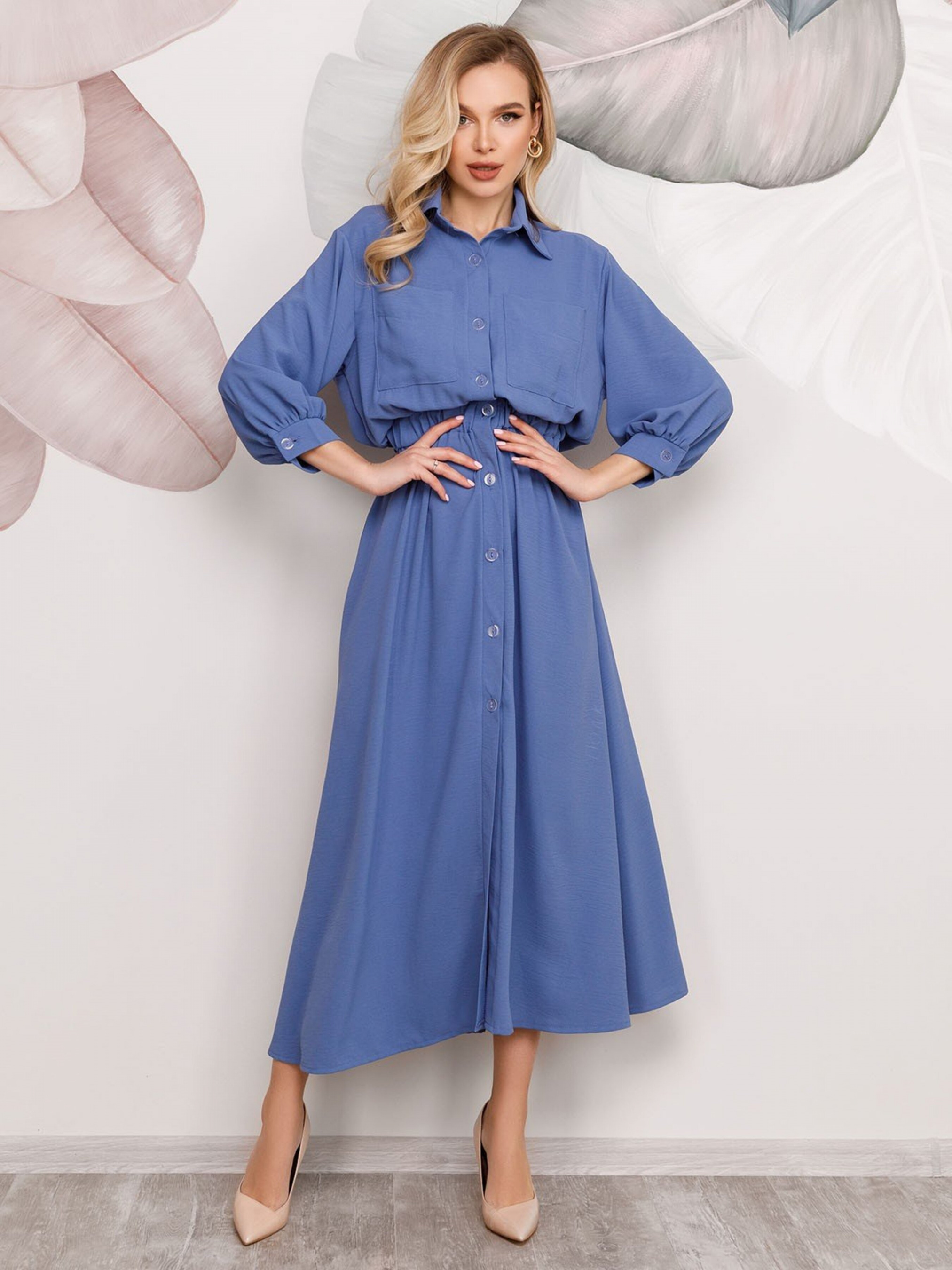 Синя довга сукня-сорочка на ґудзиках. Синє повсякденне плаття-сорочка на ґудзиках виконанне з фактурного крепу. Модель оснащена коміром і накладними нагрудними кишенями. Модель максі довжини до кісточок з широкою поясною гумкою і вільними рукавами на манжетах довжиною 3/4. Склад: 50% бавовна, 50% поліестер. Матеріал: Міцний. Напівобхват: Груди: S (49), M (51), L (53), XL (55), Талія: S (30-40), M (32-42), L (34-44), XL (36) -46), Стегна: S (75), M (77), L (79), XL (81), Довжина виробу - 136, Рукав - 40, Тканина: Низька еластичність.
