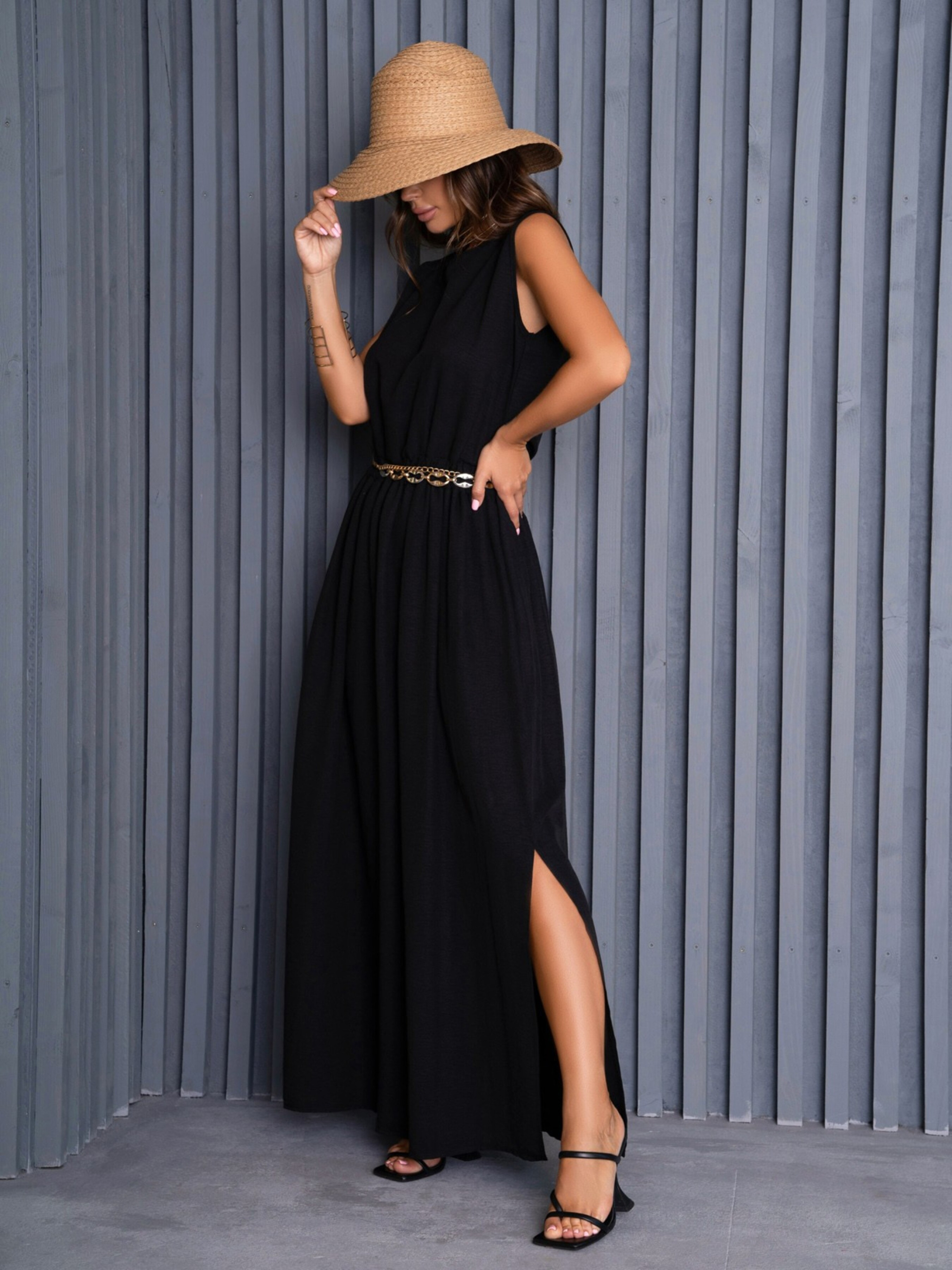 Чорний максі сарафан з розрізом. Склад: 59% поліестер, 21% еластан, 20% бавовна. Напівобхват: Груди: S (46), M (48), L (50), XL (52), XXL (55), 3XL (57); Талія: S (32-43), M (33-45), L (35-46), XL (36-48), XXL (40-54), 3XL (41-57); Стегна: S (74), M (77), L (77), XL (80), XXL (84), 3XL (83); Довжина виробу - 139; Тканина: Низької еластичності.