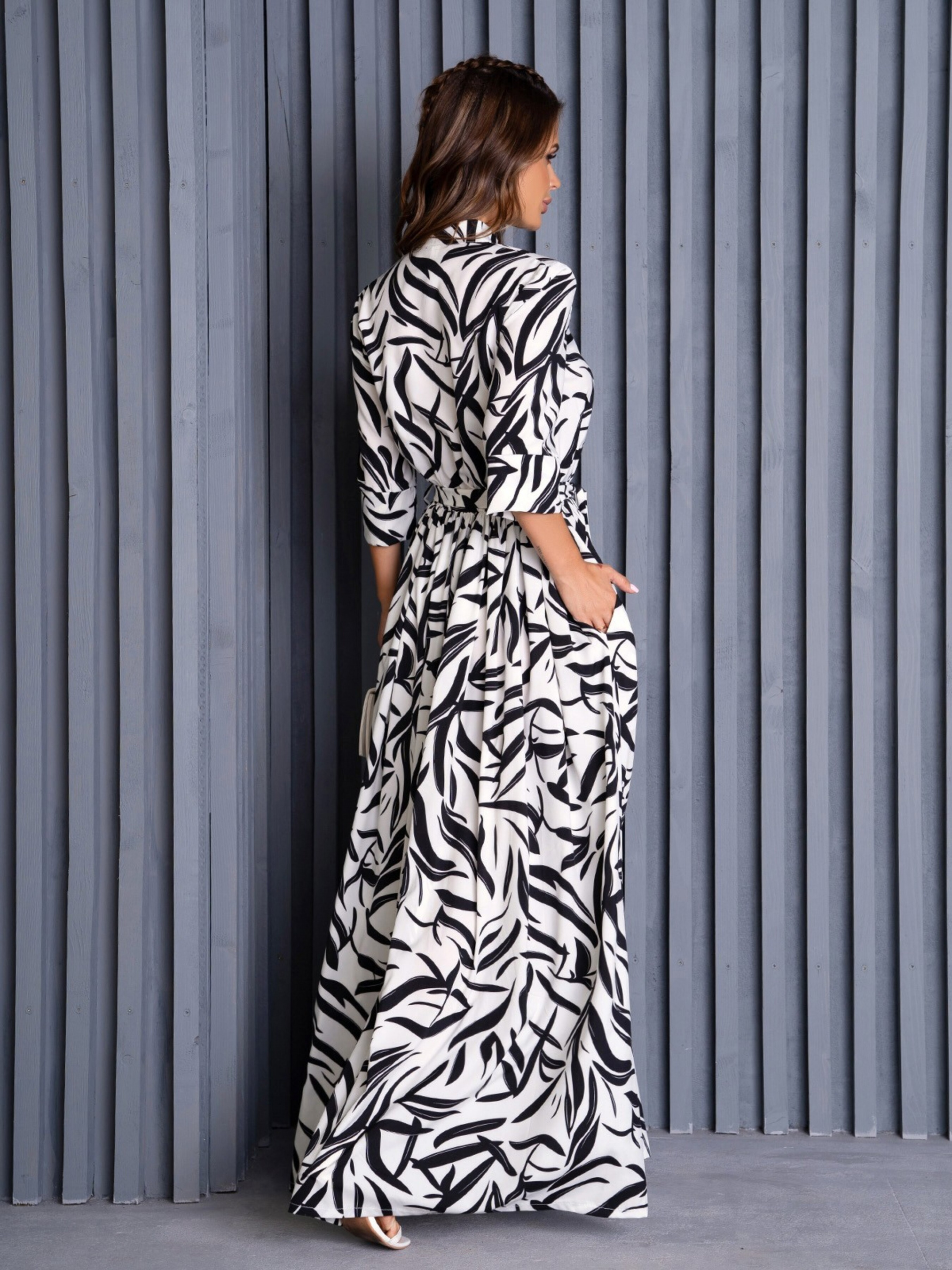 Біла довга сукня з розрізом. Довга молодіжна сукня, виготовлена з білого софту з принтом. Модель з клиноподібним вирізом у горловини та рукавами нижче ліктів оснащена знімним поясом та коміром-стійкою. Сукня максі довжини з потайною гумкою на талії та спідницею. Сукня з кишенями та розрізом на передній частині спідниці. Склад: 59% поліестер, 21% еластан, 20% бавовна. Матеріал: Софт. Напівобхват: Груди: S (46), M (48), L (50), XL (52), Талія: S (30-42), M (32-44), L (34-46), XL (36) -48), Стегна: S (94), M (96), L (98), XL (100), Довжина виробу - 145, Рукав - 39, Тканина: Низька еластичність.