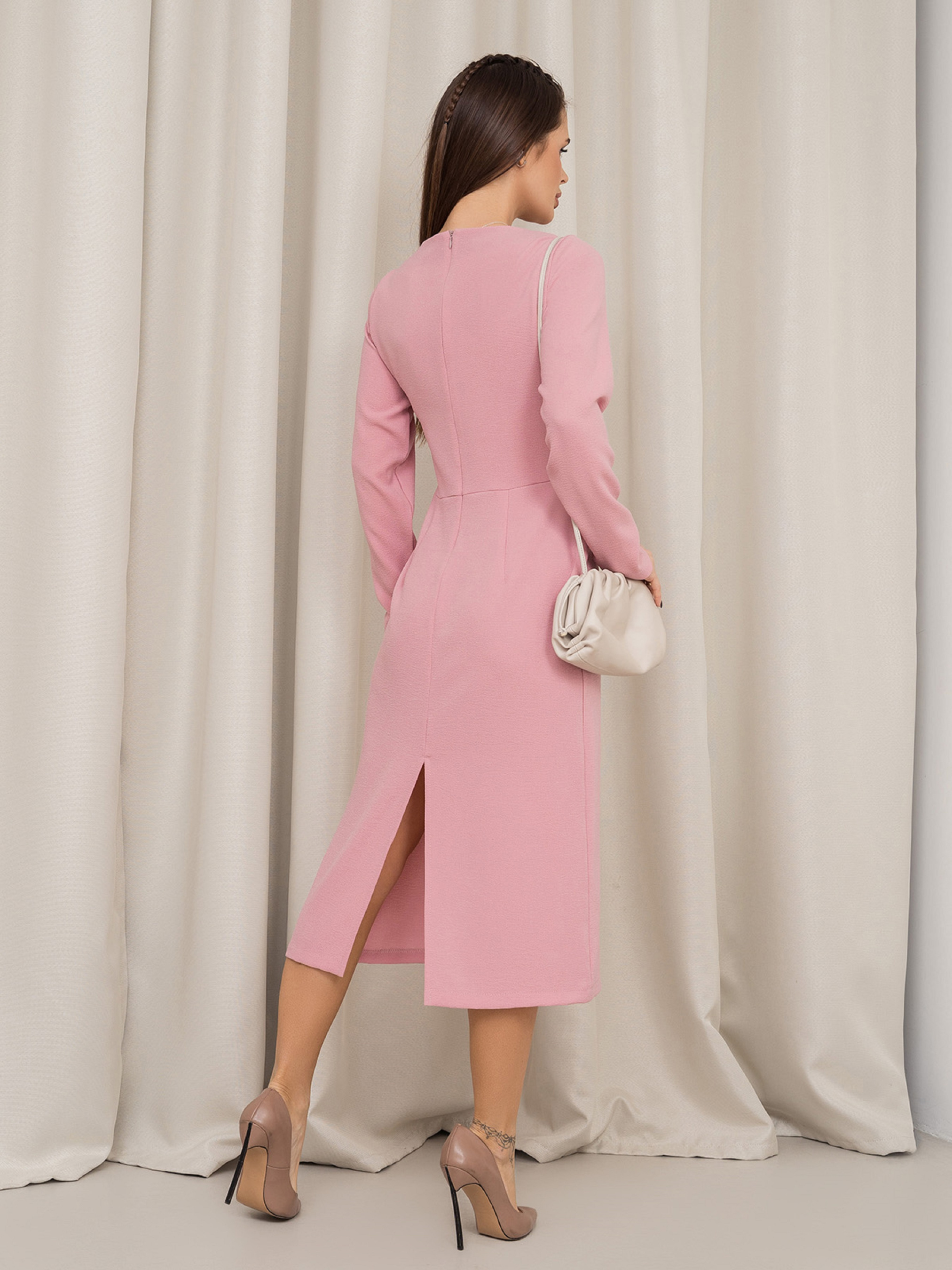 Класична сукня-олівець на блискавці, виготовлена з крепу рожевого кольору. Сукня міді довжини з функціональним розрізом ззаду. Модель приталеного крою з довгими рукавами та напівкруглою закритою горловиною.Напівобхват: Груди: S (43), M (45), L (47), XL (49), Талія: S (33), M (35), L (37), XL (39), Стегна: S ( 48), M (50), L (52), XL (54), Довжина виробу - 112, Рукав - 57, Тканина: Низька еластичність.