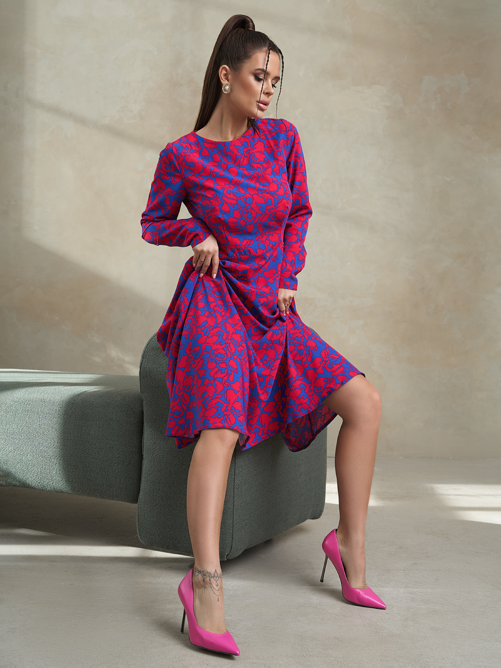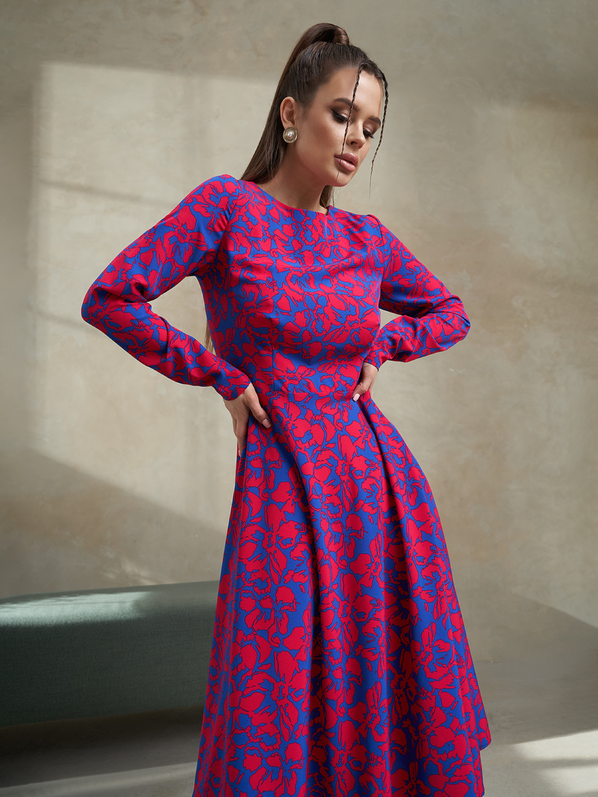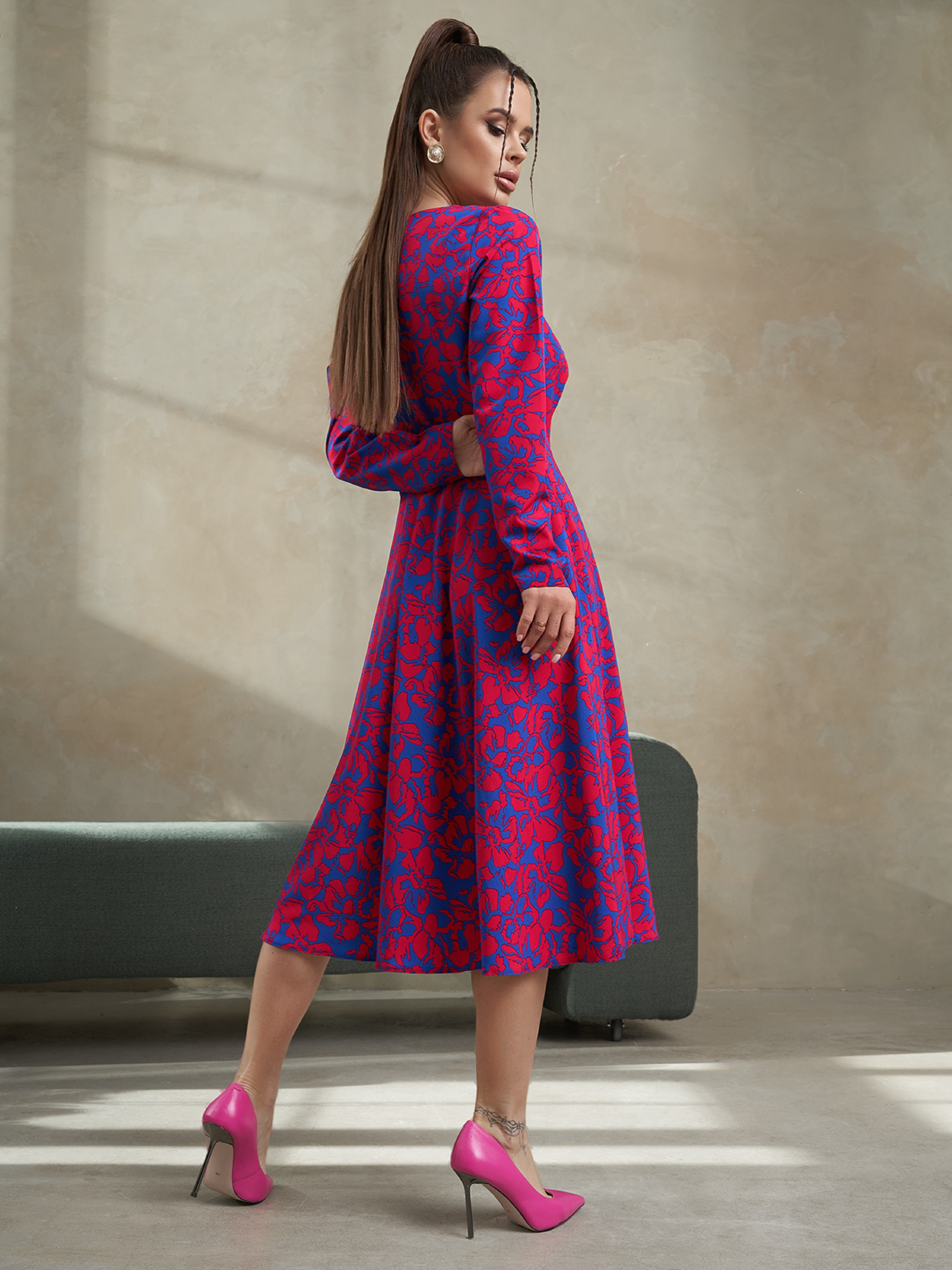 Квіткове синьо-червоне плаття класичного крою із закритою горловиною на гудзику. Модель приталеного силуету з довгими прямими рукавами та розкльошеним низом міді довжини. Сукня пошита із софту.Напівобхват: Груди: S (43), M (45), L (47), XL (49), Талія: S (35), M (37), L (39), XL (41), Стегна: S ( 72), M (74), L (76), XL (78), Довжина виробу - 110, Рукав - 60, Тканина: Низька еластичність.