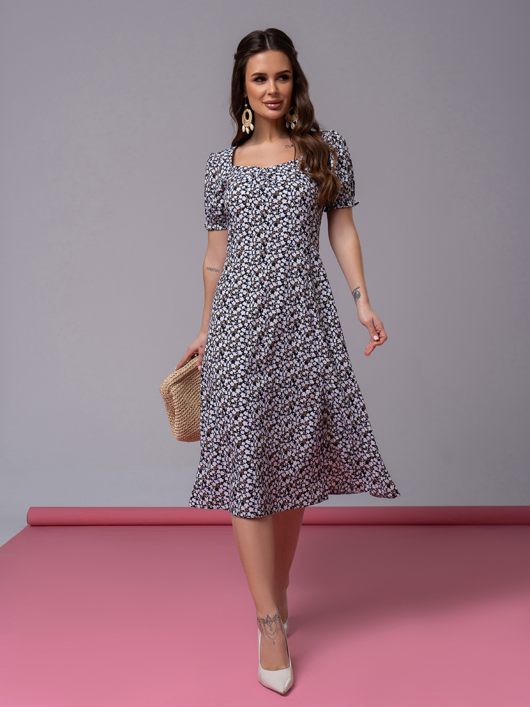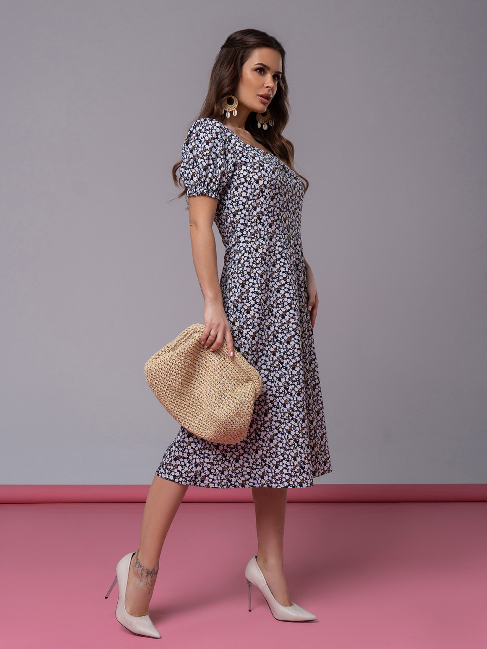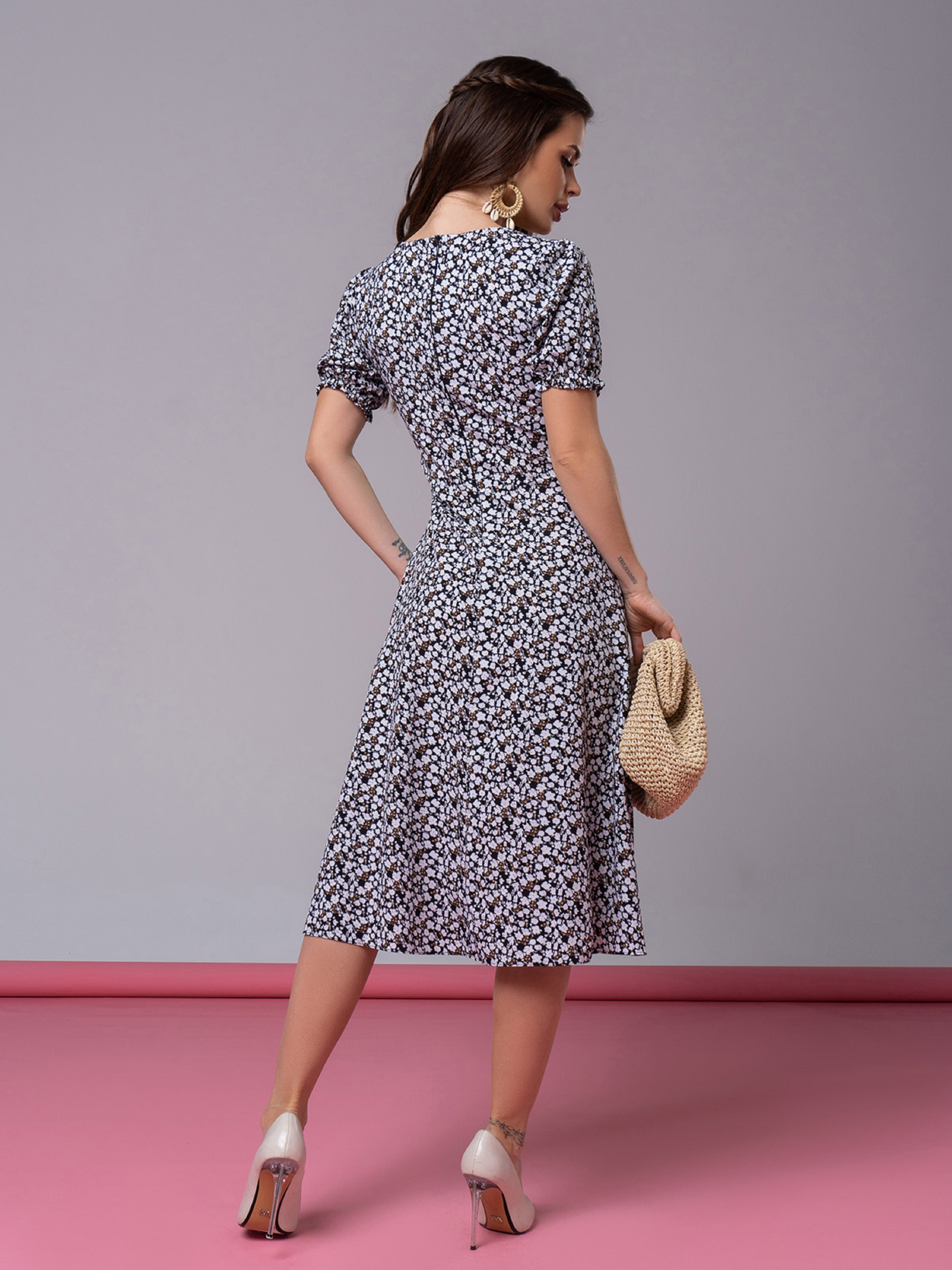 Легка ретро сукня, виготовлена з чорного софту із короткими рукавами, декорованими рюшами. Модель приталеного крою з декольте та блискавкою на спинці. Сукня з довжиною нижче колін та бічним розрізом. Напівобхват: Груди: S (43), M (45), L (47), XL (49), Талія: S (34), M (36), L (38), XL (40), Стегна: S ( 49), M (51), L (53), XL (55), Довжина виробу - 108, Рукав - 22, Тканина: Низька еластичність.